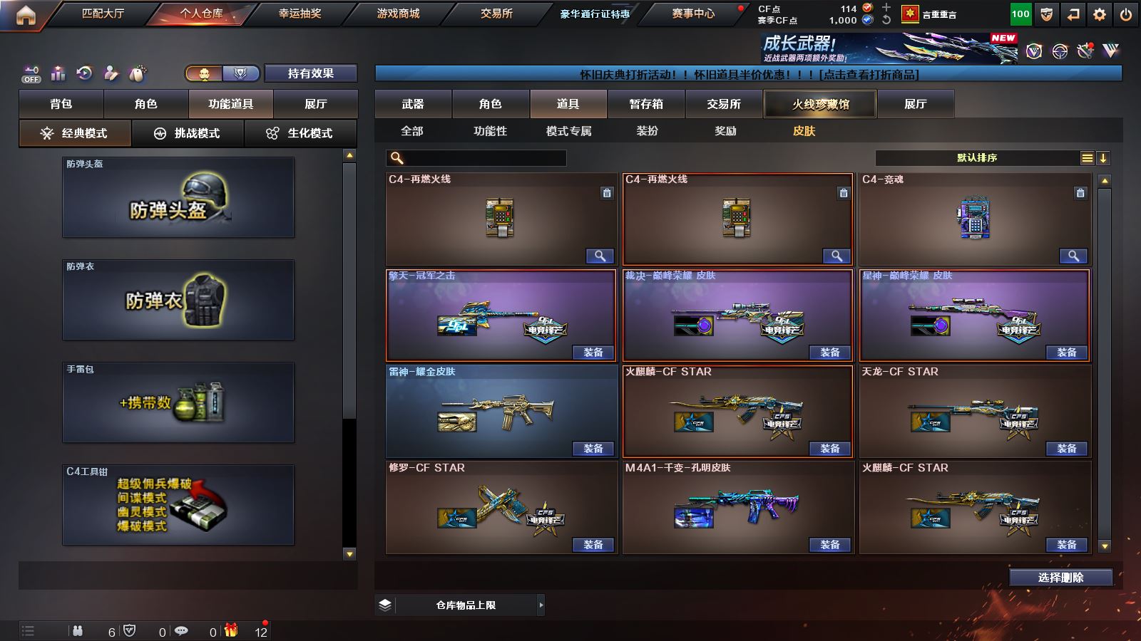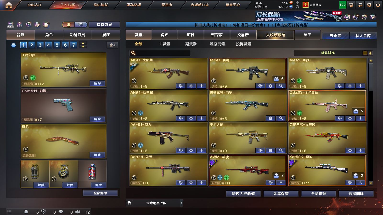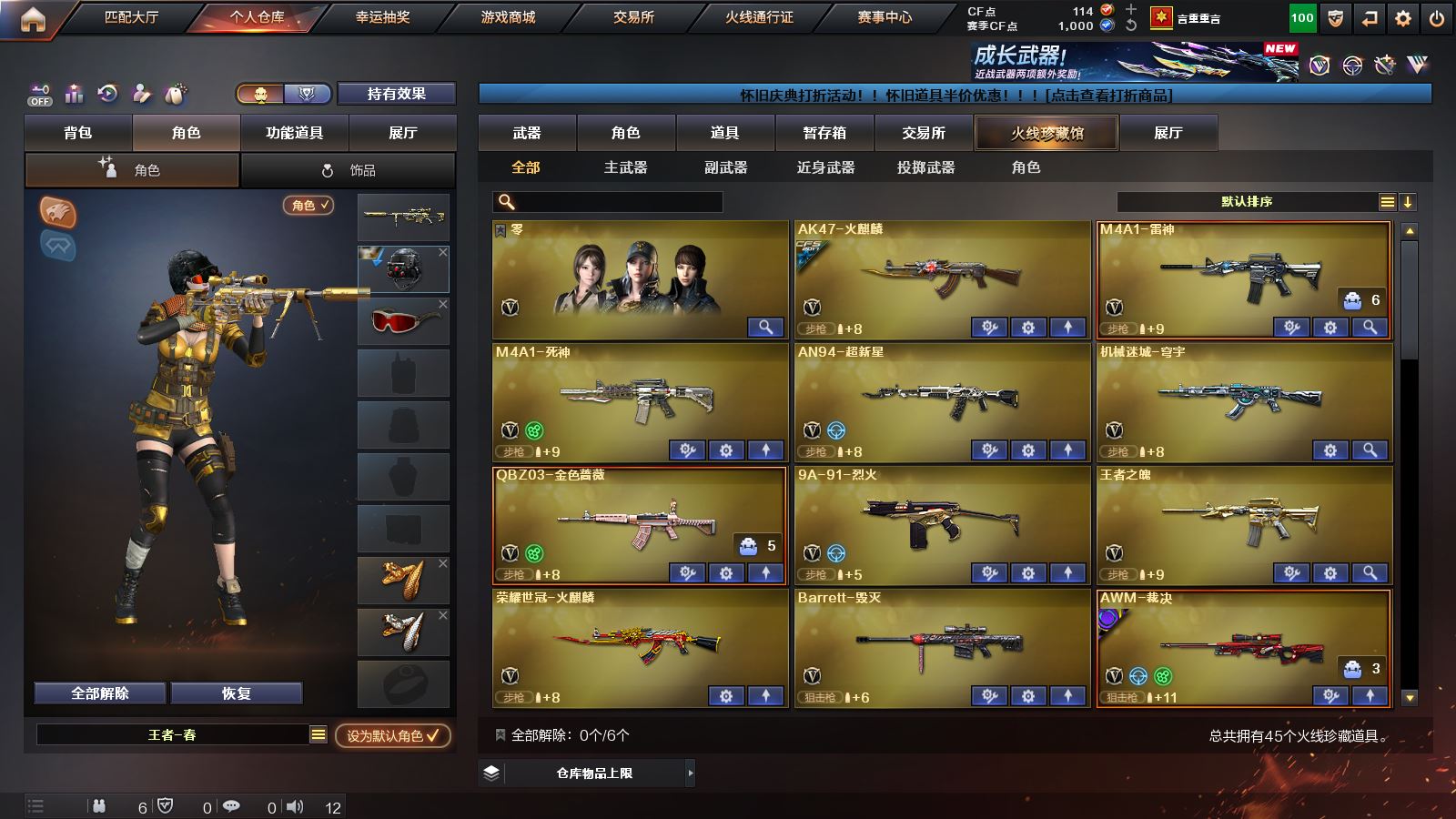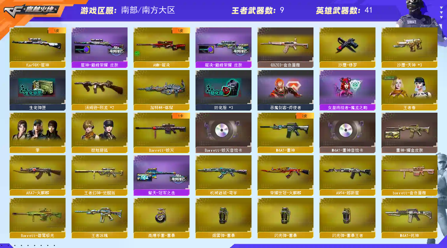 【王者幻神】【98k星神+巅峰荣耀皮肤】【qbz03金色蔷薇】【荣耀世冠火麒麟】【王者之魄 王者之城 王者之心 王者之翼 王者冰魄】【雷神+雷神音效卡】【毁灭+毁灭音效卡】【裁决+巅峰荣耀皮肤】【火麒麟 死神 超新星 穹宇 9A91烈火 巴雷特金色蔷薇 炼狱 2烈龙】——【沙鹰修罗 沙鹰天神】——【屠龙 龙啸 擎天 麒麟刺 斩神刀雷暴 马来剑夜魔 丛林匕首玄豹 王者之啸】——【雷暴投掷武器套装 夜魔投掷武器套装 玄豹投掷武器套装】——【热门武器/小人枪】【M4A1赤狱骑士 AK47竞魂无影 巴雷特碧霄极光 青龙掌上穿越火线 火麒麟零纪元 雷神小红 炫金天龙 黑桃战神】——【角色】【4防王者春】【零 零纪元 战地猎狐】
