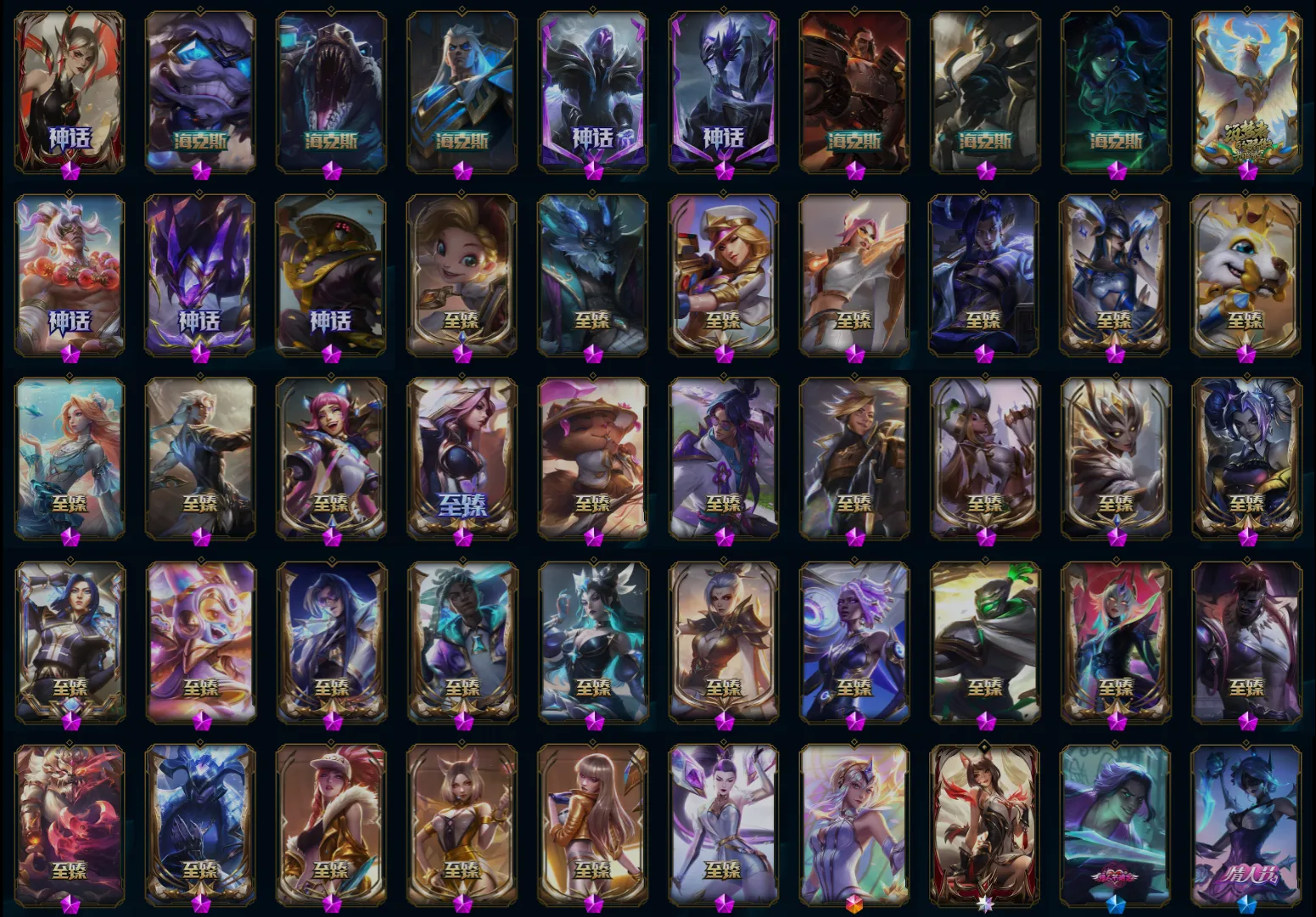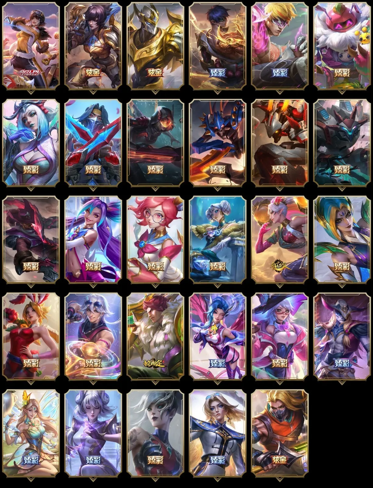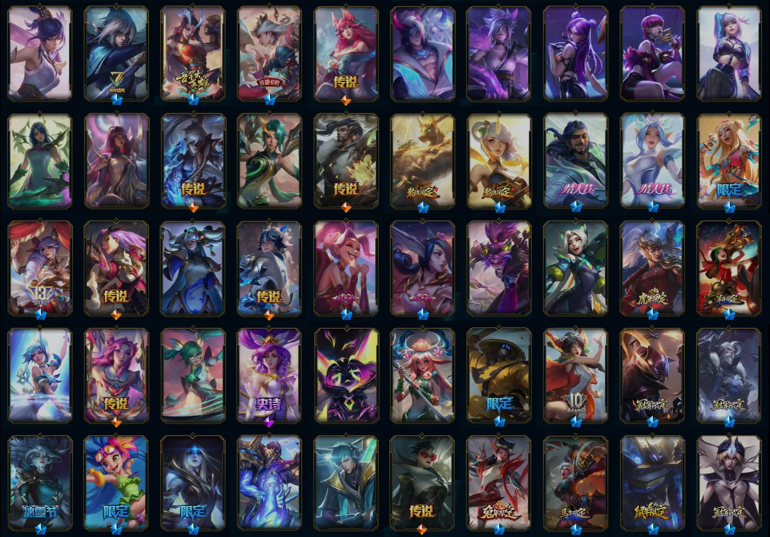 【传说皮肤】盒子猫萨科 太空律动猫猫布里和里茨 合金巨兽努努和威朗普 心之钢凯隐 钢铁之翼凯尔 偶像歌手阿狸 女帝卡特琳娜 驯龙炮手崔丝塔娜 西部天使赛娜 绝息圣堂锐雯 日蚀骑士蕾欧娜 金牌主播德莱文 女警狙击凯特琳 青花瓷伊泽瑞尔 焰尾妖狐阿狸 未来战士凯特琳 魔幻卡牌崔斯特 西部魔影大小姐蕾欧娜 上古战魂魔腾 光明哨兵格雷福斯 太空律动律动队长提莫 魔女伊芙琳 枯萎之壤泽拉斯 宇航员诺提勒斯 屠龙勇士潘森 黯晶凤凰艾尼维亚 暗星女王拉克丝 源计划泯灭雷克顿 约德尔国队长提莫 第三类接触黑默丁格 灵能特工娑娜 陆地王者4WD布里茨 日蚀骑士希维尔 战地巨兽科加斯 西部天使艾希 黎明使者永恩 黎明使者锐雯 源计划超体莫德凯撒 驯龙学者黑默丁格 暗星锤石 神龙尊者昼日真龙亚索 红色男爵库奇 死亡骑士盖伦 源计划毁灭派克 黑夜使者索拉卡 腥红之月鬼武姬阿卡丽 鬼魂新娘莫甘娜 星之守护者卡莎 暗星尊烬 耀星女神拉克丝 神龙尊者圣龙李青 恶魔男爵瑞兹 律政大亨蒙多 大天使长米迦勒凯尔 苍穹之光韦鲁斯 烈焰雄心崔丝塔娜 至尊魔女莫甘娜 灵魂莲华阿狸 源计划净化薇恩 女皇艾希 西部魔影卢锡安 丧尸布兰德 天煞劫 光明哨兵薇恩 钢铁军团盖伦 战斗学院凯特琳 真实伤害艾克 冰霜亚龙希瓦娜 战斗学院伊泽瑞尔 战场女武神凯尔 地狱之门卫士加里奥 双重冰晶艾尼维亚 霸天异形卡兹克 银河魔装机神兰博 冰霜之刃艾瑞莉娅 绅士科加斯 黯黑魔龙希瓦娜 泳池派对吉格斯 神拳李青 源计划联合艾希 符文战熊沃利贝尔 战地机甲厄加特 女校长菲奥娜 女主播迦娜 奥德赛凯隐 神王德莱厄斯 炼狱魔犬内瑟斯 最终BOSS维迦 铁哥们儿奥拉夫 地狱行者孙悟空 苹果机器人布里茨 星之守护者金克丝 提莫约德尔人的一大步 黑夜使者亚索 电玩女神娑娜 邪鸦魅影乐芙兰 星之守护者拉克丝 冰川巨兽墨菲特 灌篮高手德莱厄斯 恶魔之刃泰达米尔 源计划林易