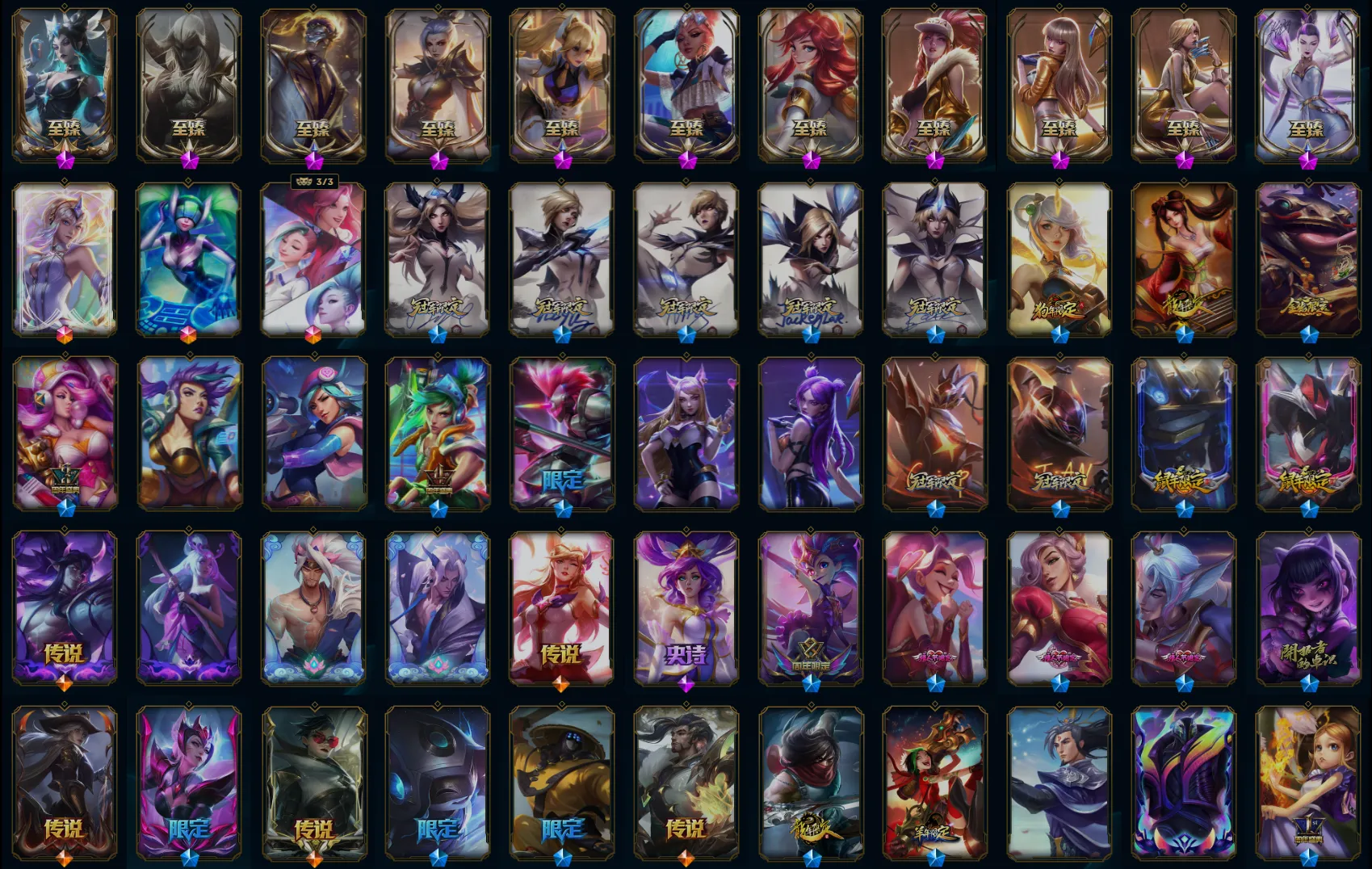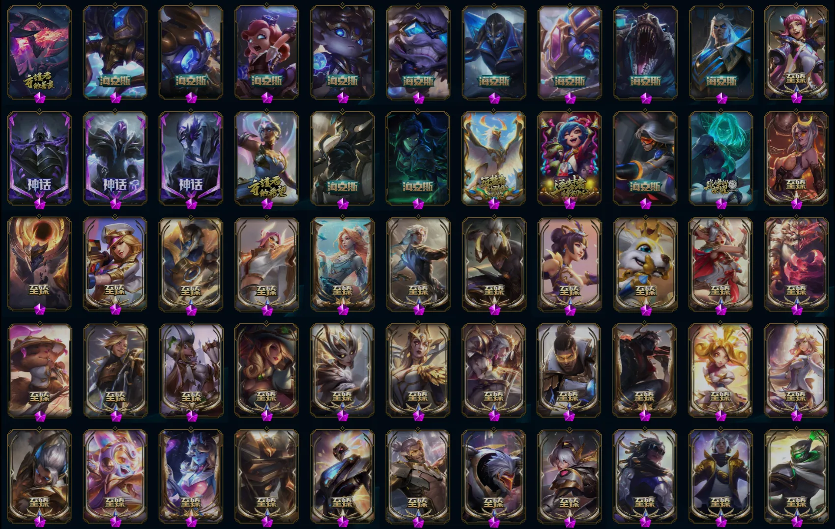 【传说皮肤】驯龙学者黑默丁格 光明哨兵格雷福斯 驯龙炮手崔丝塔娜 黎明使者永恩 源计划毁灭派克 星之守护者洛 星之守护者霞 灵魂莲华锤石 暗星锤石 真实伤害艾克 星之守护者金克丝 神龙尊者昼日真龙亚索 黑夜使者亚索 奥德赛凯隐 霸天异形卡兹克 灌篮高手德莱厄斯 金牌主播德莱文 蔷薇绅士杰斯 神王德莱厄斯 泳池派对吉格斯 女校长菲奥娜 宇航员诺提勒斯 苍穹之光韦鲁斯 星之守护者阿狸 符文战熊沃利贝尔 黯黑魔龙希瓦娜 焰尾妖狐阿狸 偶像歌手阿狸 冰霜亚龙希瓦娜 枯萎之壤泽拉斯 星之守护者拉克丝 黎明使者锐雯 钢铁军团盖伦 神王盖伦 死亡骑士盖伦 屠龙勇士潘森 银河魔装机神兰博 炼狱魔犬内瑟斯 第三类接触黑默丁格 光明哨兵薇恩 地狱行者孙悟空 丧尸布兰德 神拳李青 源计划净化薇恩 上古战魂魔腾 冰川巨兽墨菲特 陆地王者4WD布里茨 苹果机器人布里茨 女警狙击凯特琳 太空律动猫猫布里和里茨 未来战士凯特琳 最终BOSS维迦 红色男爵库奇 冰霜之刃艾瑞莉娅 女主播迦娜 电玩女神娑娜 律政大亨蒙多 黯晶凤凰艾尼维亚 双重冰晶艾尼维亚 战地巨兽科加斯 绅士科加斯 鬼魂新娘莫甘娜 源计划联合艾希 西部天使艾希 恶魔之刃泰达米尔 女皇艾希 合金巨兽努努和威朗普 约德尔国队长提莫 烈焰雄心崔丝塔娜 黎明使者索拉卡 欧米伽小队幽灵特工 提莫约德尔人的一大步 黑夜使者索拉卡 霸天零式赛恩 恶魔男爵瑞兹 源计划林易 钢铁之翼凯尔 战场女武神凯尔 大天使长米迦勒凯尔 邪鸦魅影乐芙兰 血石领主弗拉基米尔 战地机甲厄加特 魔幻卡牌崔斯特 地狱之门卫士加里奥 铁哥们儿奥拉夫