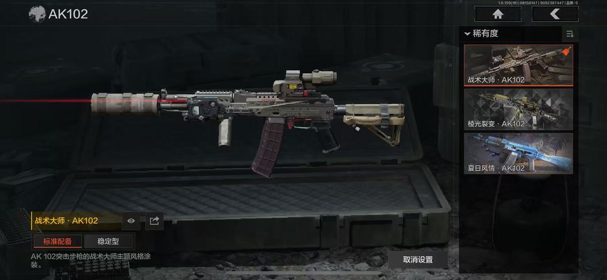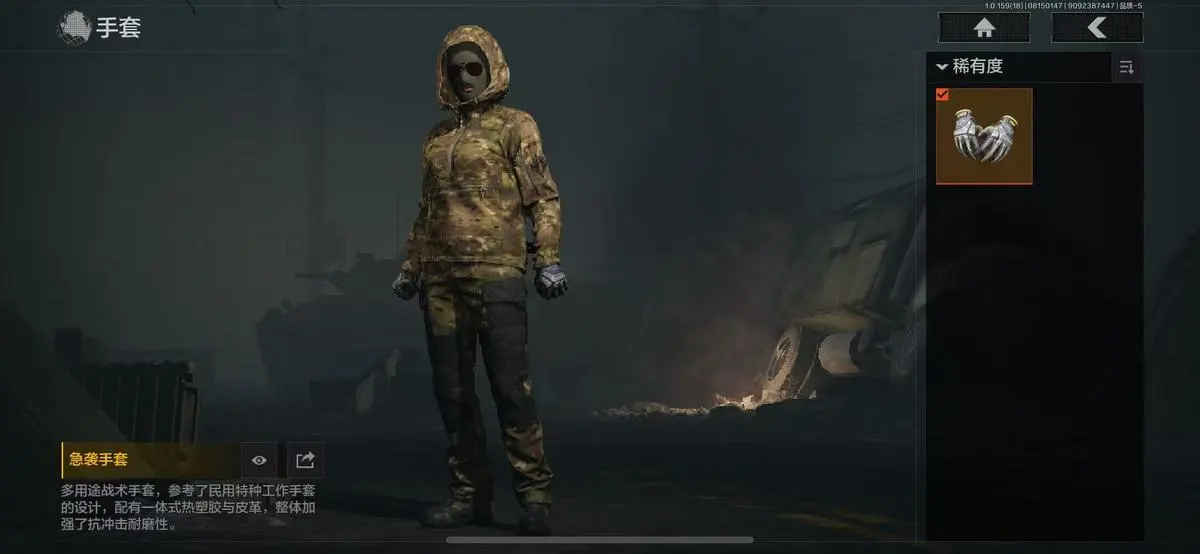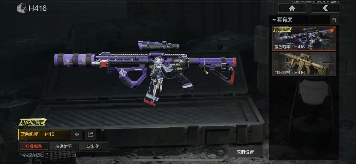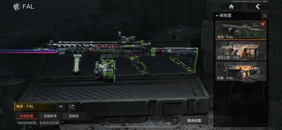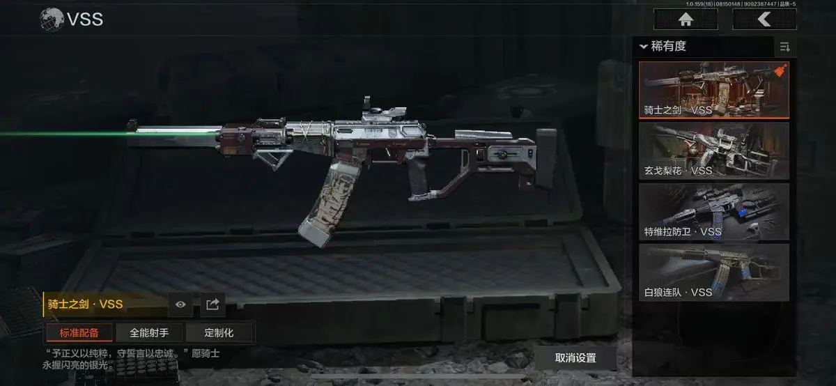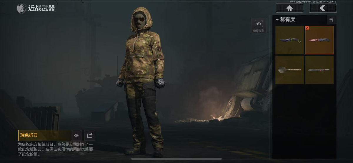 晚霞3187。近战武器:瑞兔折刀,急袭弯刀,来战开山刀,工兵铲;手套:急袭手套;枪皮:应龙Vector,蓝色咆哮H,竞技FAL,