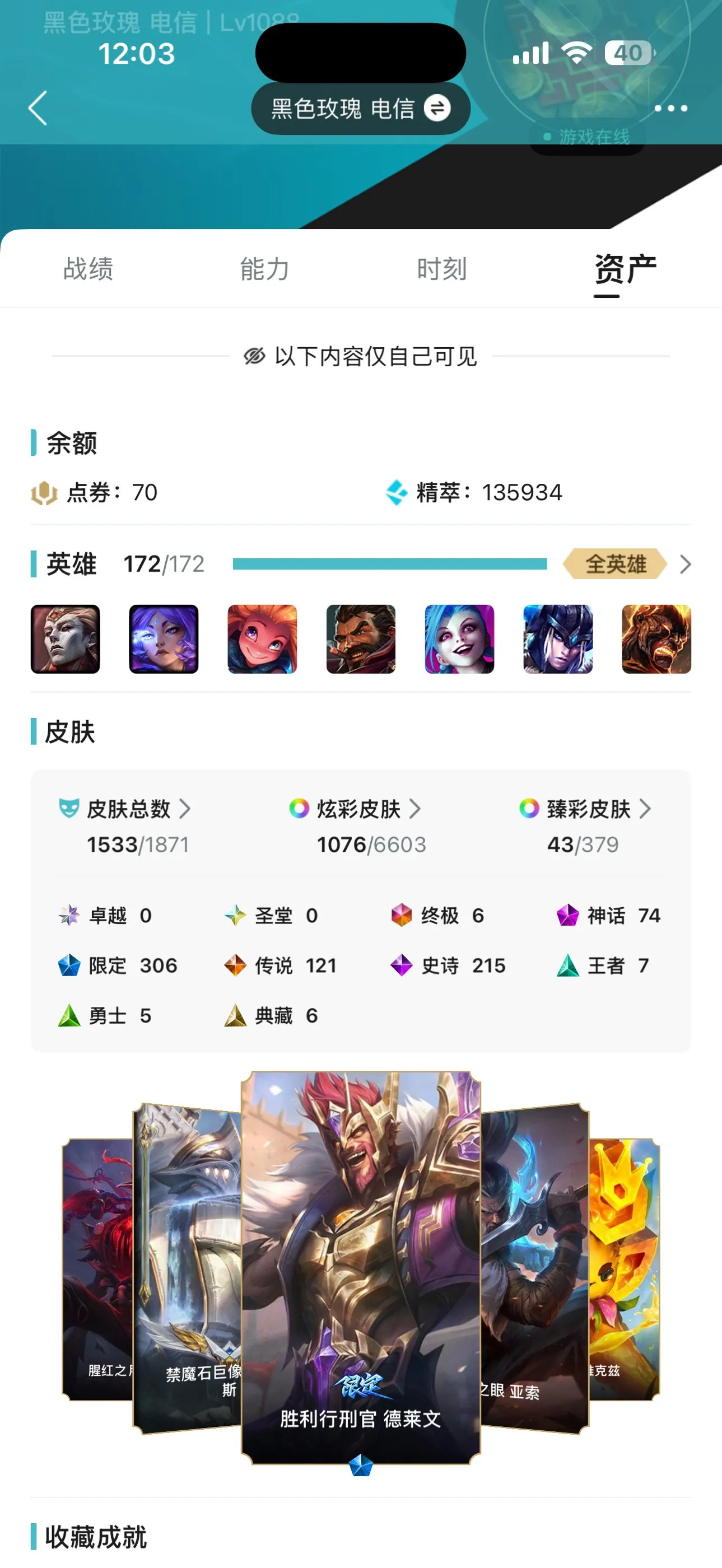 黑色2600皮肤丨1533原皮丨1060炫彩丨306限定丨74神话丨43臻彩