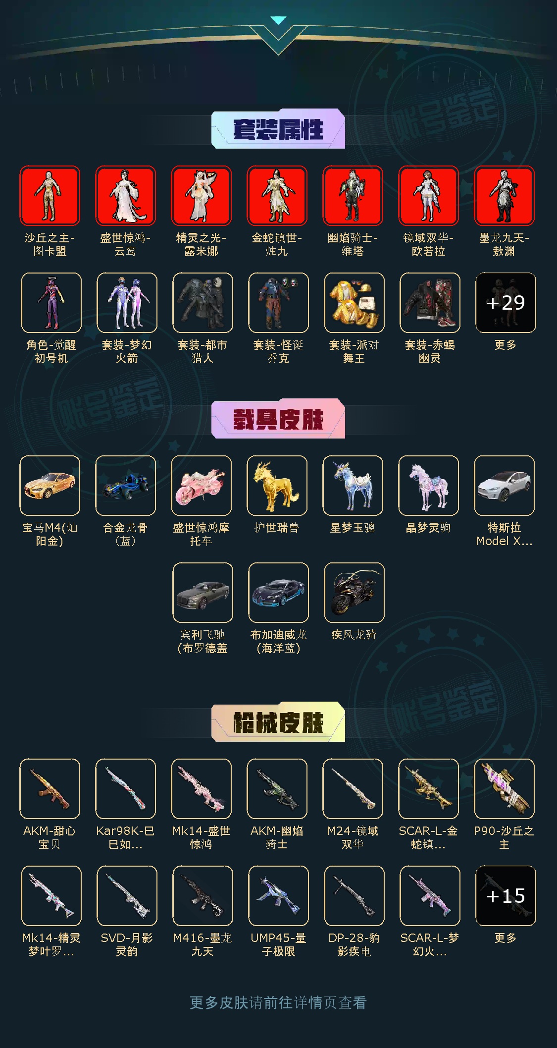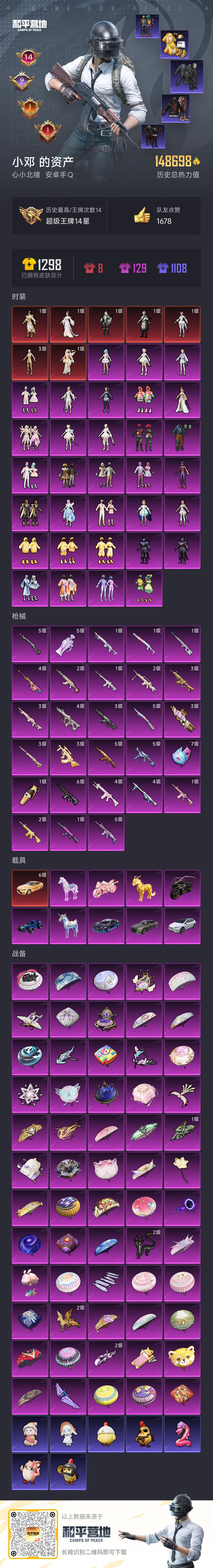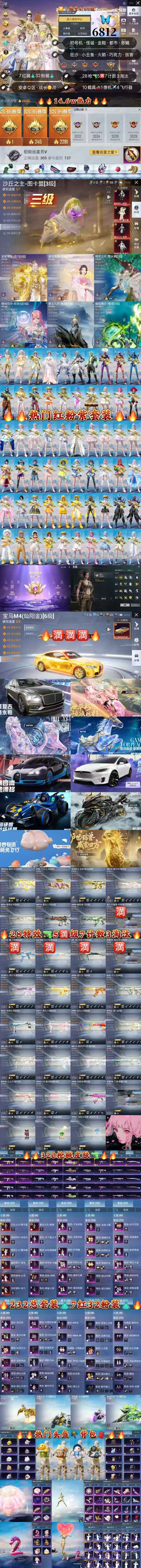 不朽星钻Ⅳ39粉,10载具,237套装,14王牌印记,超级王牌14星历史最高段,0热力值 AKM-甜心宝贝/SCAR-L-梦幻火箭/M416-暖熊萌萌/AKM-幽焰骑士/M762-鬼刀/M416-心之恋语/AKM-炫紫旋律/GROZA-精灵之光/M416-墨龙九天/AUG-许七安/SCAR-L-金蛇镇世/M16A4-晶梦幻蝶/SPAS-12-蜜语绒猫/M417-第五大道/Mk14-盛世惊鸿/Mk14-精灵梦叶罗丽/MG-36-幻梦之森/MG3-洛神天依/DP-28-豹影疾电/UMP45-量子极限/P90-沙丘之主/烟雾弹-丁香清露/烟雾弹-猫咪绅士/破片手榴弹-粉粉猫爪/Kar98K-巳巳如意/M24-镜域双华/AMR-炫光之旅/SVD-月影灵韵/宝马M4(灿阳金)/宾利飞驰(布罗德盖棕双色)/特斯拉Model X(珍珠白)/合金龙骨(蓝)/布加迪威龙(海洋蓝)/护世瑞兽/星梦玉骢/晶梦灵驹/疾风龙骑/盛世惊鸿摩托车/