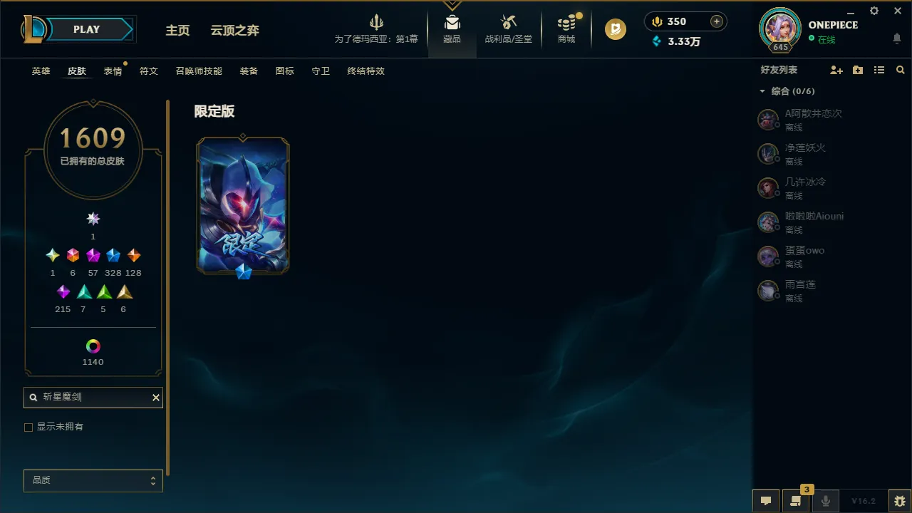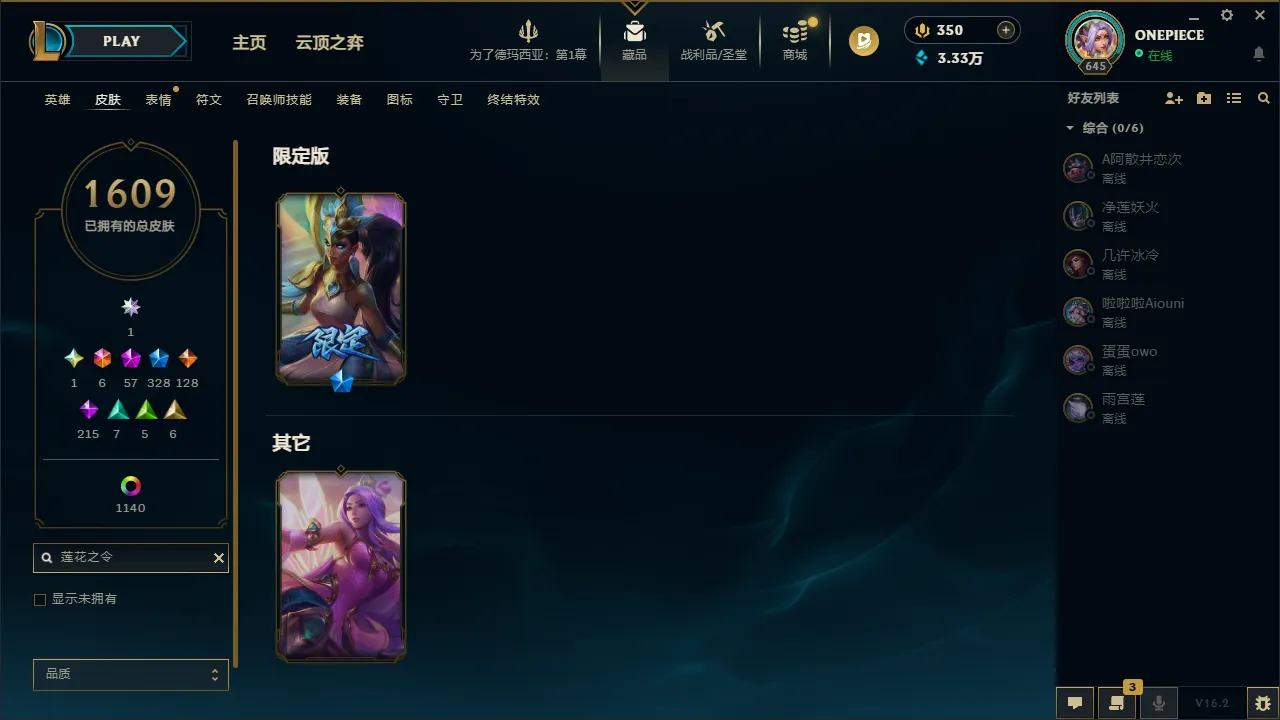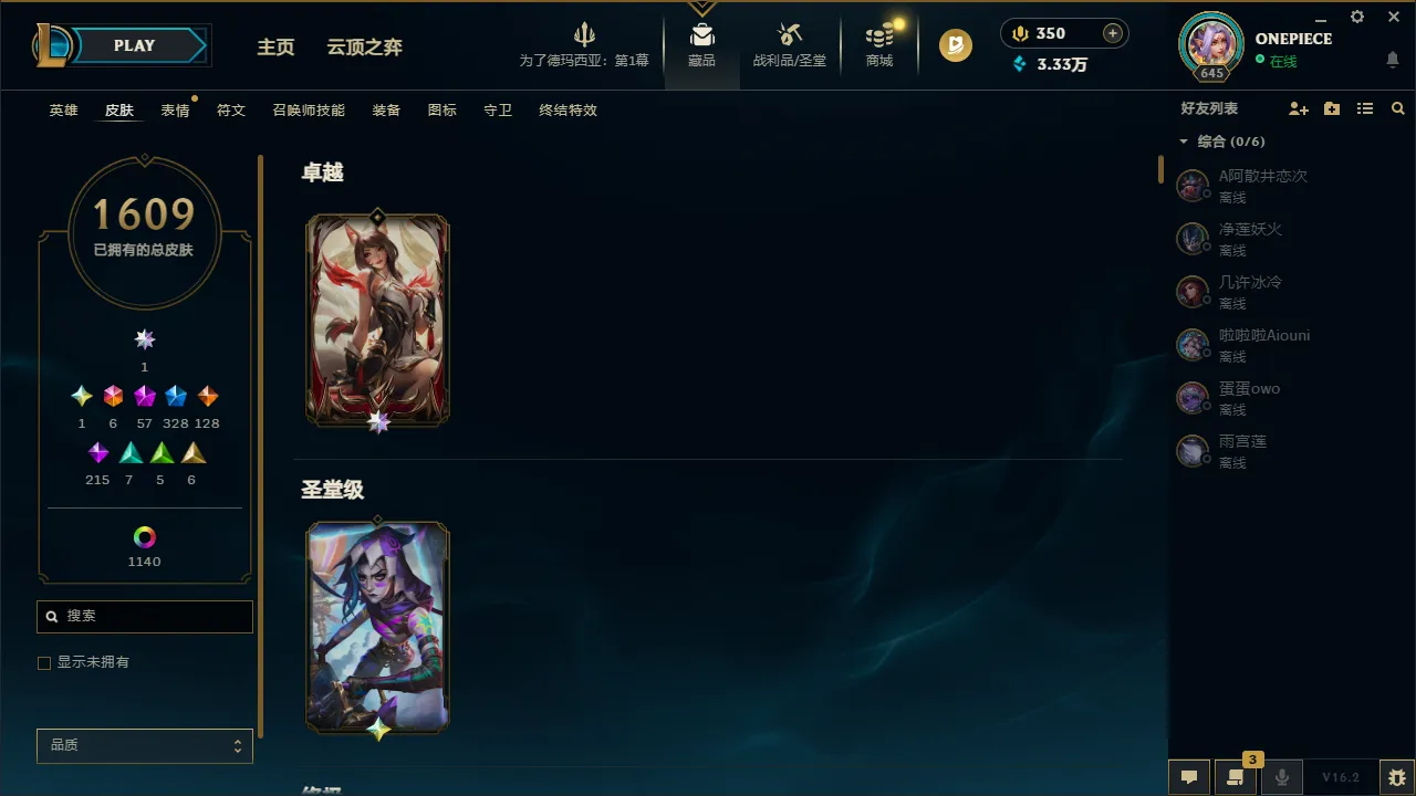 艾欧尼亚2700皮丨1609原皮丨1140炫彩丨圣堂金克斯丨328限定丨57神话丨56臻彩