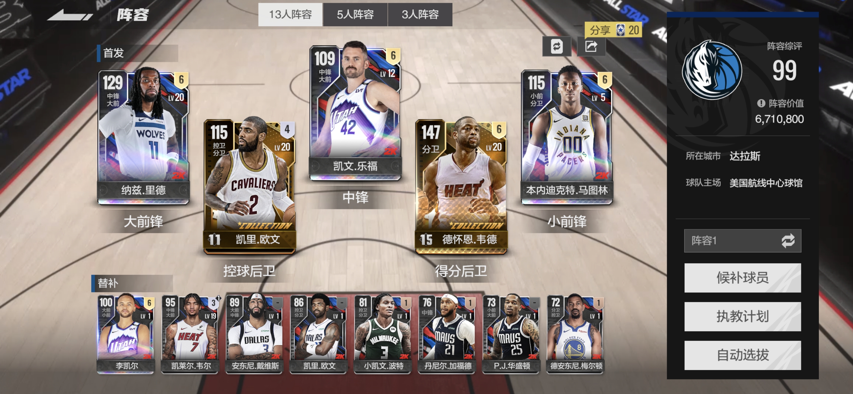 500w阵容🔥满突15韦德🔥满突纳兹里德🔥满突欧文 李凯尔 乐福 马图林