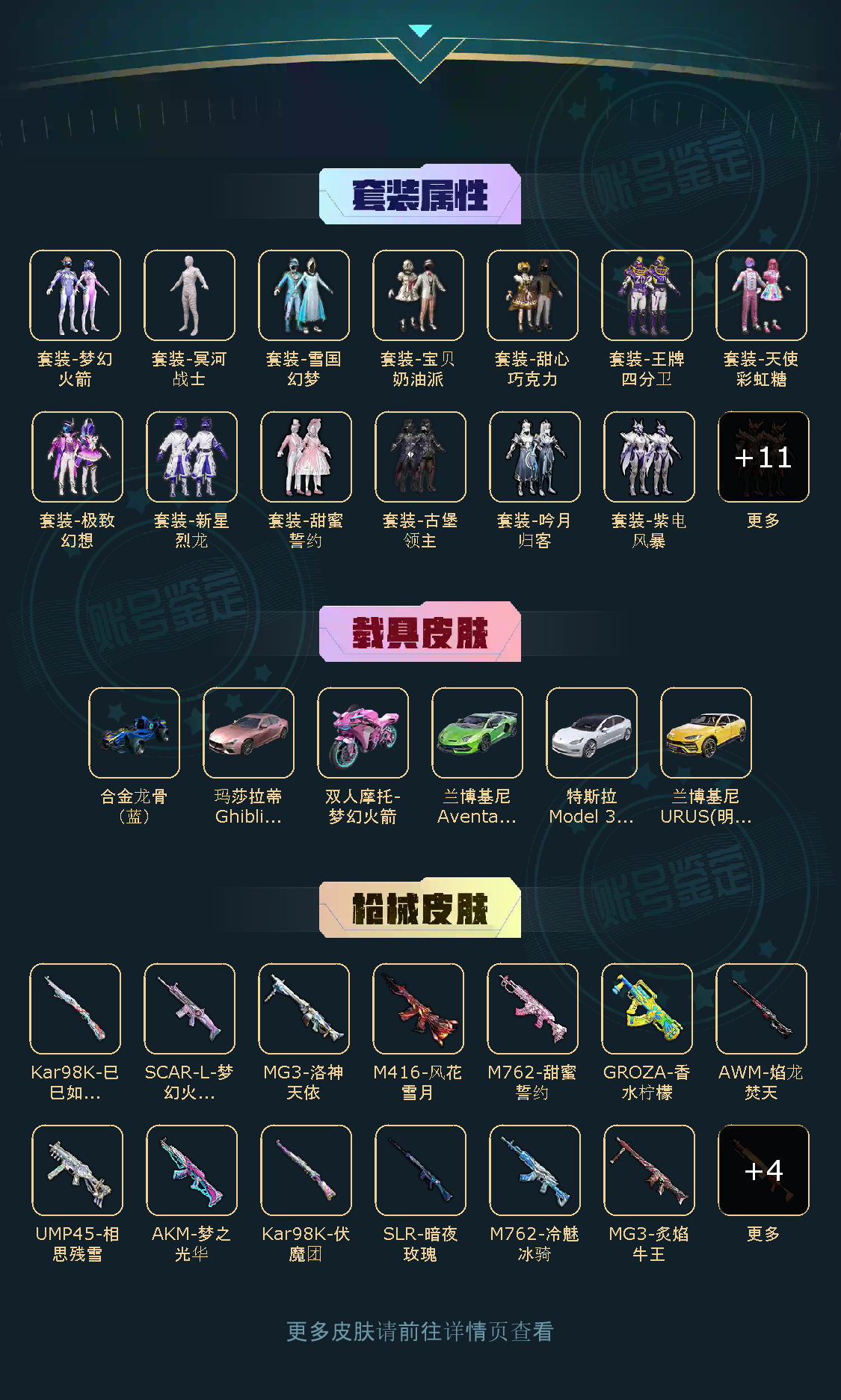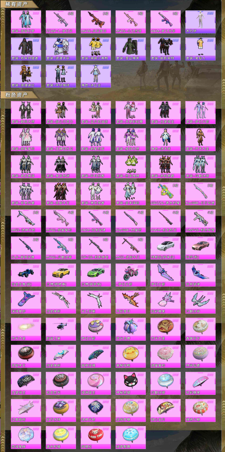【稀有资产】套装-雪国幻梦/SCAR-L-梦幻火箭/M416-风花雪月/M416-心之恋语/AKM-梦之光华/木乃伊套装/套装-奇异狩猎者/套装-浪漫天命/套装-潮萌小黄鸭/套装-雪山精英/套装-暗影哥特/套装-龟仙人/套装-浪漫波比/套装-牛仔情诗/角色-冰公主