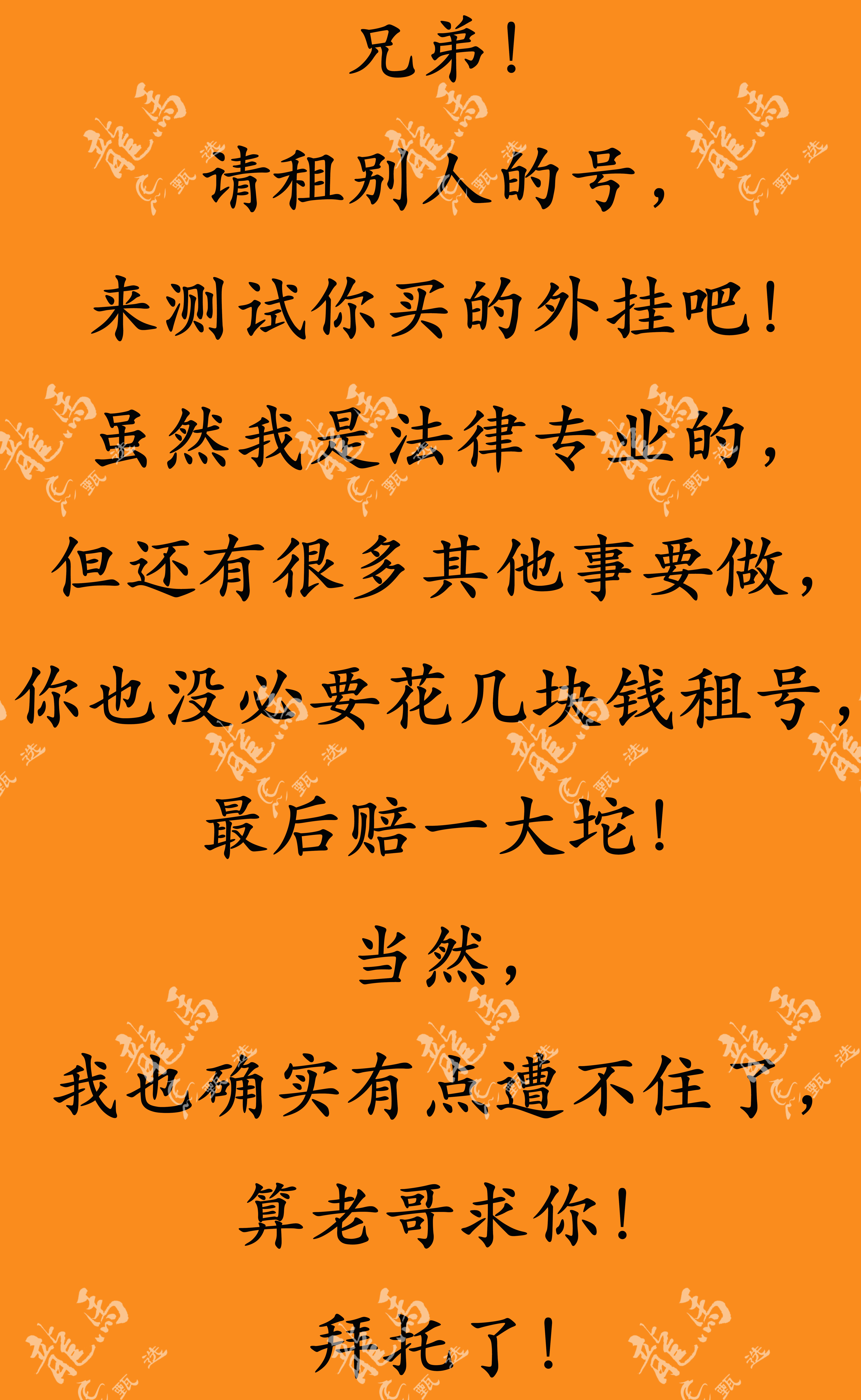 细看以上内容后,如果您还是为了寻求刺激,花几块钱租号开挂,这封号十年的代价,可能就是让您赔偿充值金额,您细算一下是否划算?话已至此,您仍然一意孤行,那现在您的行为有多无情,咱们公堂之上,牢门之间,您就有多难堪!