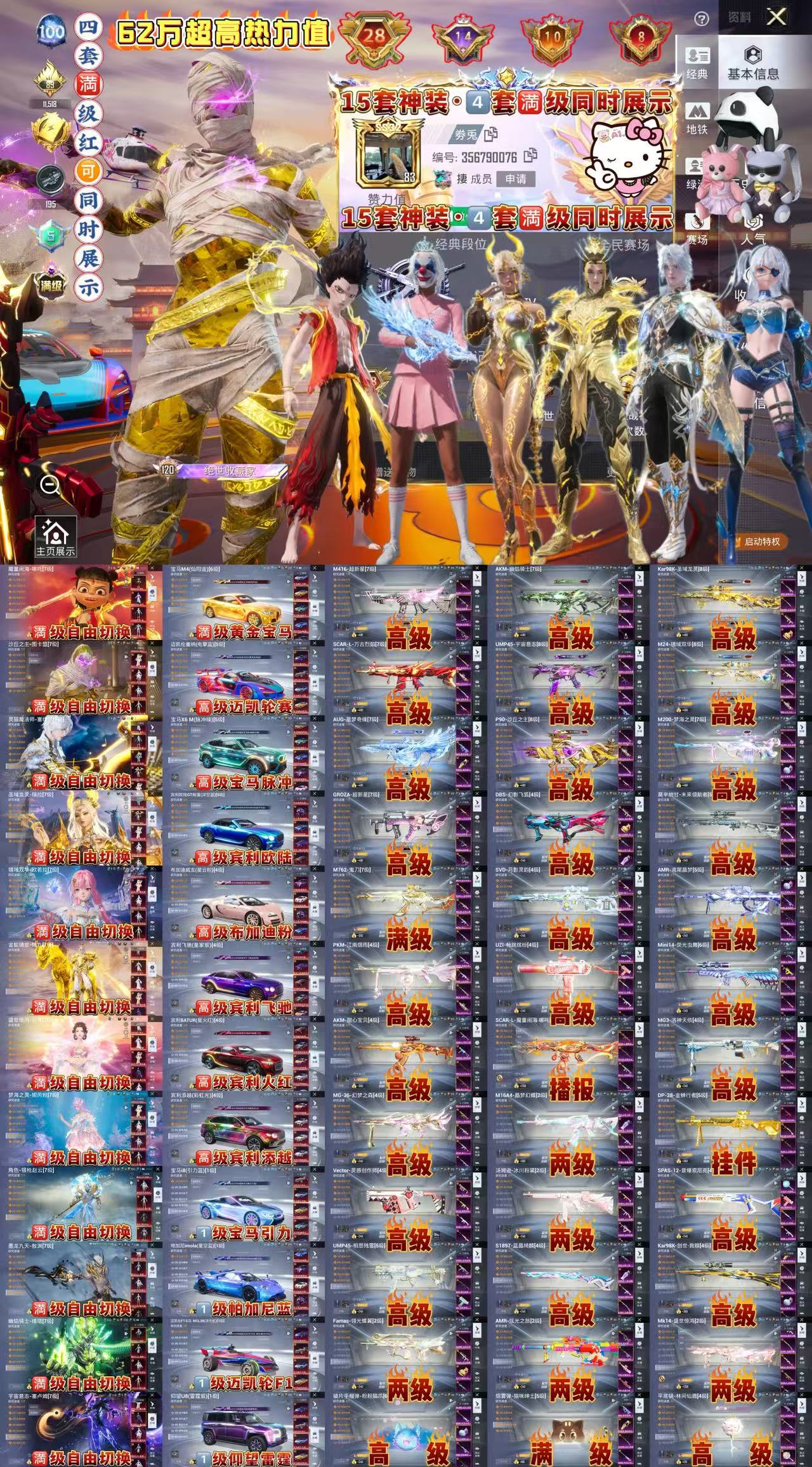 4套满级红装 12套红 满级黄金宝马 18辆升级车 15把升级枪 老101 62万热力值 满素材