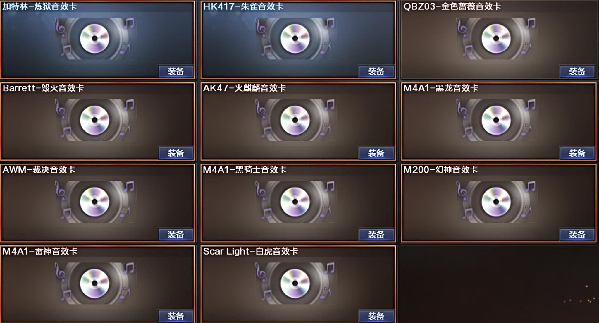 幻神音效卡,白虎音效卡,金色蔷薇音效卡,毁灭音效卡,裁决音效卡,炼狱音效卡,朱雀音效卡,火麒麟音效卡,黑龙音效卡,黑骑士音效卡,雷神音效卡