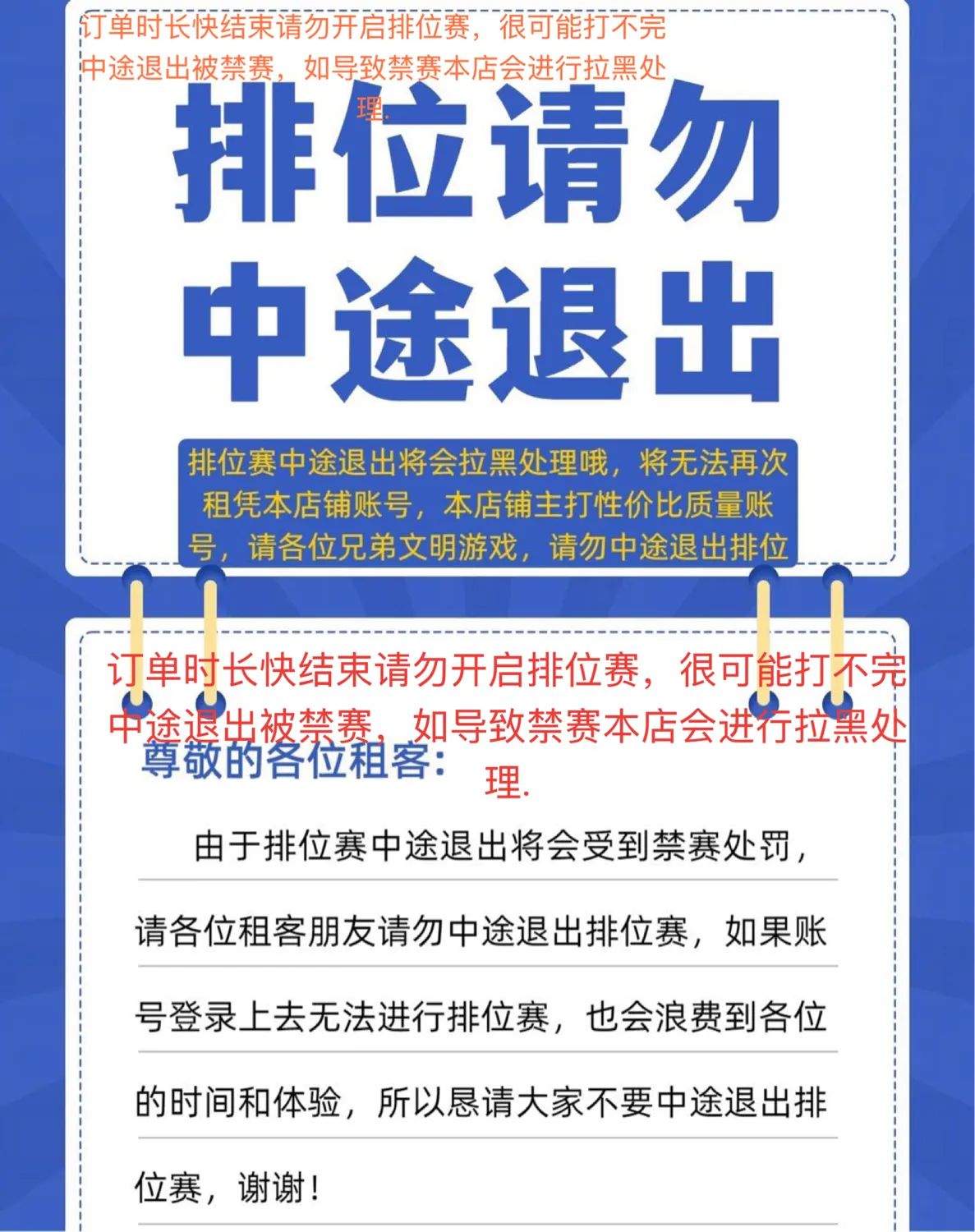 订单时长快结束请勿开启排位赛,很可能打不完中途退出被禁赛,如导致禁赛本店会进行拉黑处理.