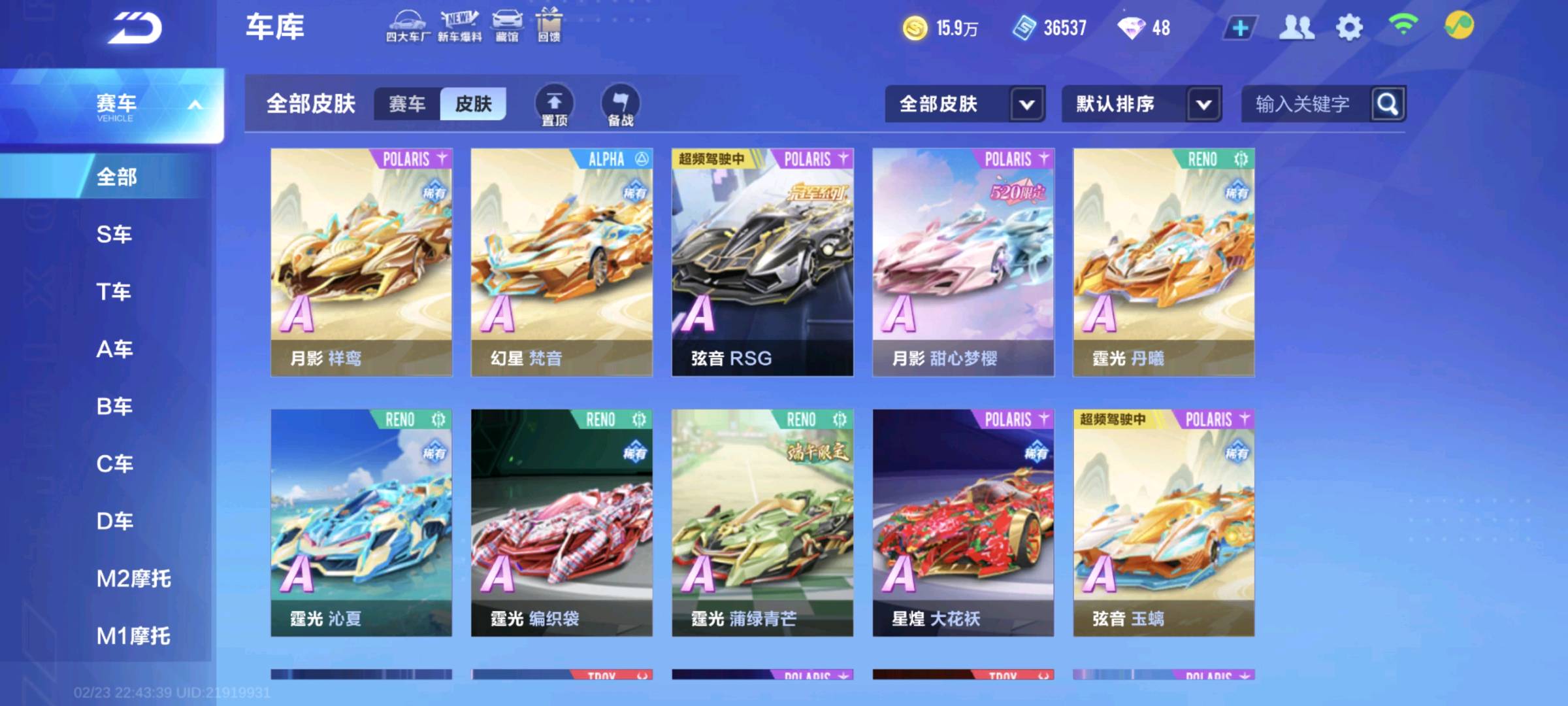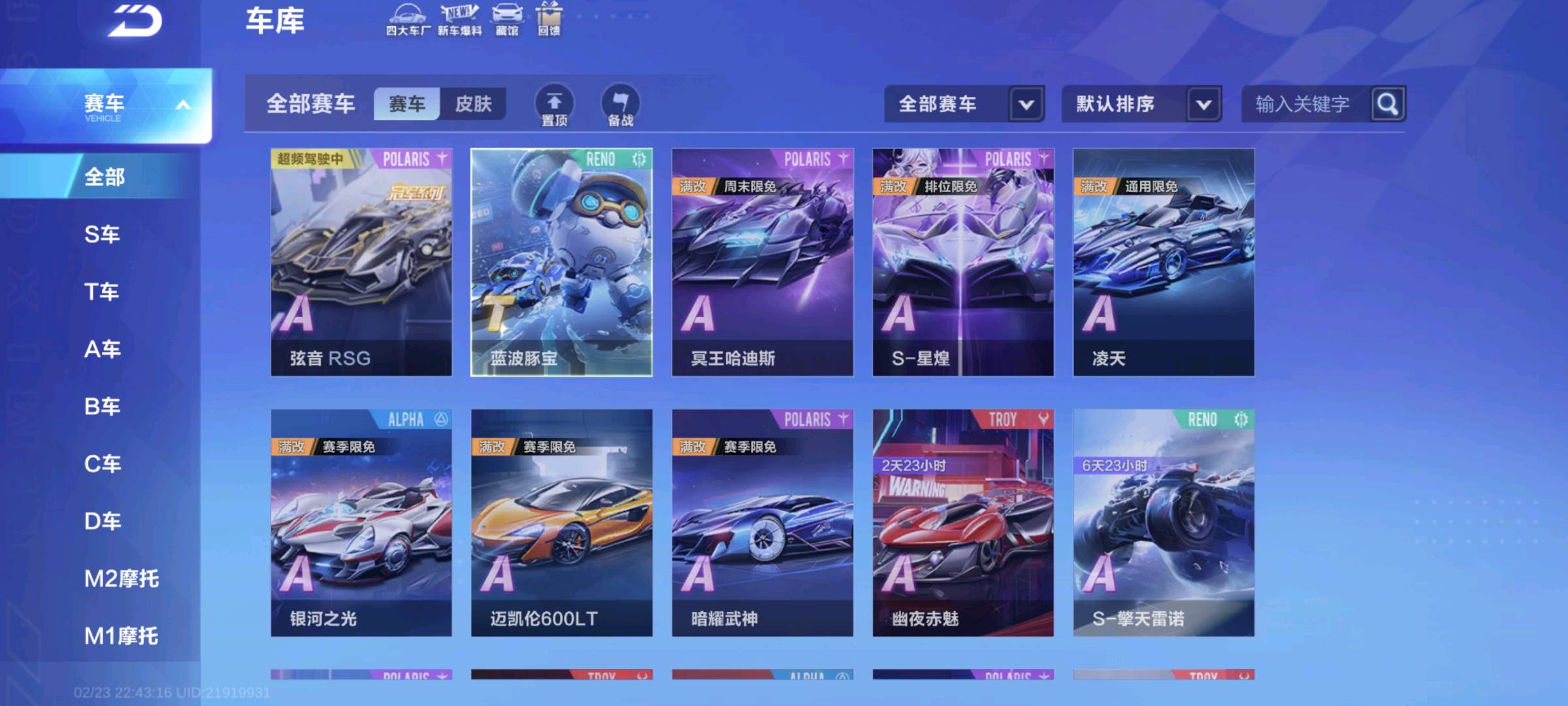 - A车:弦音RSG、冥王哈迪斯、S-星煌、凌天、银河之光、迈凯伦600LT、暗耀武神、幽夜赤魅、S-擎天雷诺