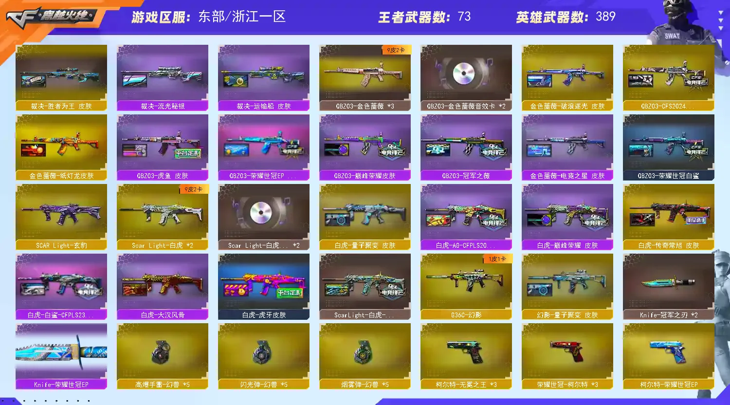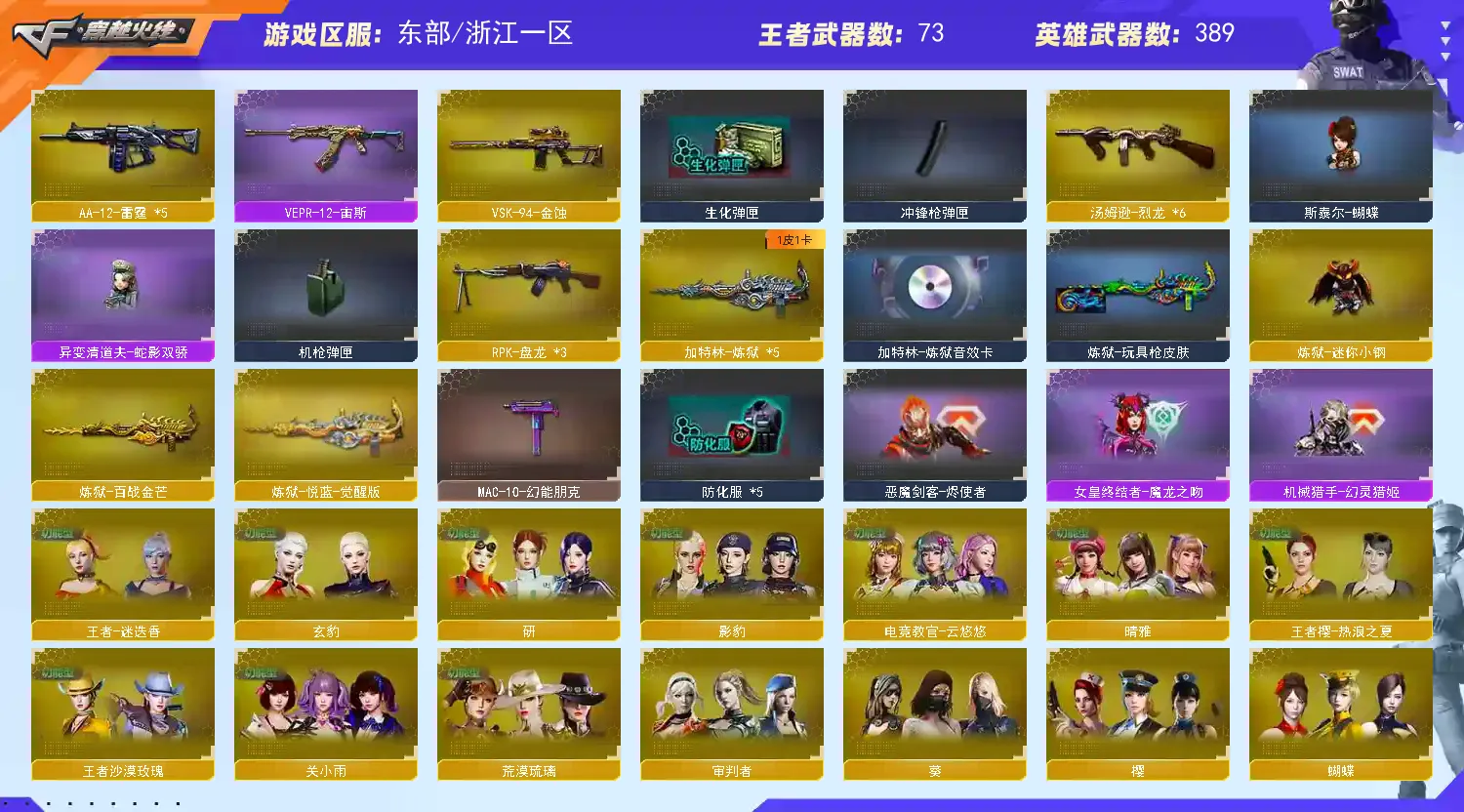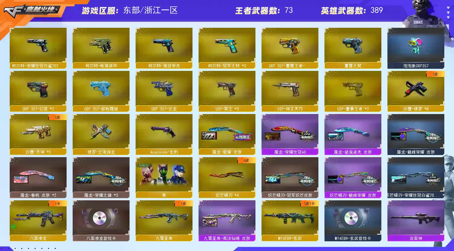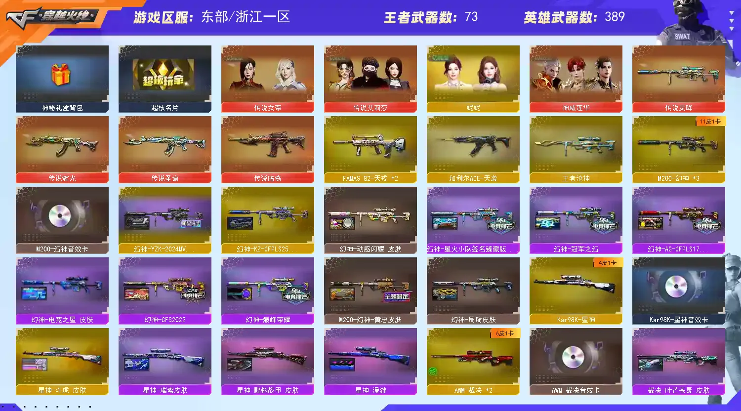 【其他重要武器】炫金骑士/炫金千变/炫金天龙/炫金修罗(2)/M4A1-再燃火线/白虎-九尾白狐(2)/AK47-再燃火线/AK47-冰龙粉碎者/末日审判者III/激光毁灭者III-白马银枪/激光毁灭者III/冰龙粉碎者-白马银枪/AK47-泰坦破坏者III/M4A1-PINK(2)/M4A1-樱/M4A1-情人节2019/AK47-肯德基/M4A1-肯德基(2)/AK-12-CFS2017纪念版(2)/M4A1-电音/黄金AK-47(5)/百城AK47(2)/百城M4A1(2)/雷神-赛博幻想/AK47-丹龙/AK47-轮回(2)/纯金AK-47/红龙AK47/M4A1-战龙/联想锋行黄金AK/9A91-赤血龙魂/AK47-破空冰刃/QBZ03-掌火萌橙/AK103-神秘黑洞/M4A1-破空冰刃/M4A1-樱花/蔷薇赤魂/神罚/AWM-S(2)/暗金M200(2)/AWM-蓝水晶(3)/M200-青帝/M200-WeGame(3)/破天狂龙(2)/巴雷特-情人节2020/AWM-A(3)/Barrett-麟龙/M82A1-夏日/FN Ballista-CFS2020纪念版/蓝色魅影(2)/M200-赤血龙魂/M200-万圣节/98K-烛龙/M200-青花瓷(2)/FN弩炮-CFS2017纪念版/AWM-圣诞2013/M200-庆典-CFS 2021/黄金AWM/AWM-Red/AWM-银月/AWM-恶棍/双面神/百城AWM/雷蛇AWM/M200-落樱/AWM-Pink(3)/末日裁决者/KAC-圣炎切割者III/M240B-卡通/KAC-情人节2021/阿梅利轻机枪-暗夜风暴/致命乱世-超越Max/死亡之眼(2)/EVO III-赤血龙魂(2)/斯泰尔-巧克力(2)/Steyr TMP-CFS2020纪念版/死亡之眼-电子连击/EVOIII-机甲核心/斯泰尔-CFS2017纪念版/CPW-动力-潘多拉/EVOⅢ-黑金传说/征服者-毁灭之王 [Lv Max]/神圣爆裂者-末日III/神圣爆裂者III/试炼破坏者III/VEPR-12-宙斯/神圣爆裂者III-蛇姬/AA-12-圣龙/阐释者III/柯尔特-百城(2)/COP357-十二生肖·羊/真的是手枪(3)/沙漠之鹰-盛典-CFS 2022/Glock-18-宙斯/COLT 1911-雷唤苍龙(2)/幻影Anaconda-枪王排位/Colt1911-彩蝶/幻影沙鹰-枪王排位/Anaconda-炽焰核心/MAC-10-幻能朋克/Knife-荣耀世冠EP/轻型军用手斧-再燃火线/金刚伞-电玩红兔/Knife-冠军之刃(2)/无畏之矛(2)/应援棒(2)/影锋刃-枪王之王/宙斯权杖/猫猫手套/招财猫-枪王排位/巧克力手杖-饼干情人/魔能镰刀/雷神之怒-机甲核心/蝴蝶刀-枪王排位/啸天/惨叫鸡手雷-惨叫迹(2)/烟雾弹-Orange-虎牙娘(2)/深渊终结者手雷/生化手雷-小钢/高爆手雷-饼干情人/惨叫鸡高爆手雷(2)/疾爆手雷-河马/幽灵宝宝手雷/高爆手雷-诺拉/生化手雷-机甲核心