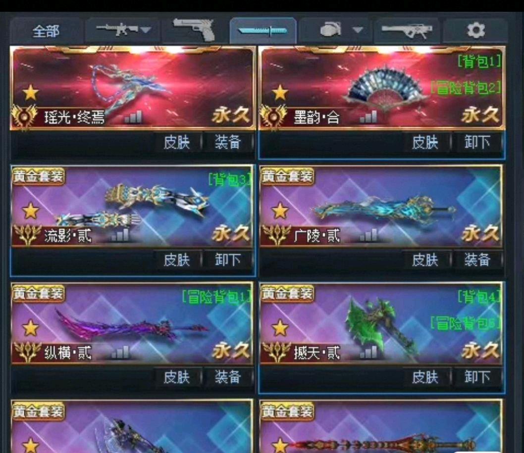 彩金武器: 天平 晶刹 巨阙 广陵 万象两仪 魅影 飞梭 纵横 枢衡雷 风神 不灭星核 双撼天 塞壬 宇宙雷 蛇舞 次元之星 裁决之炎