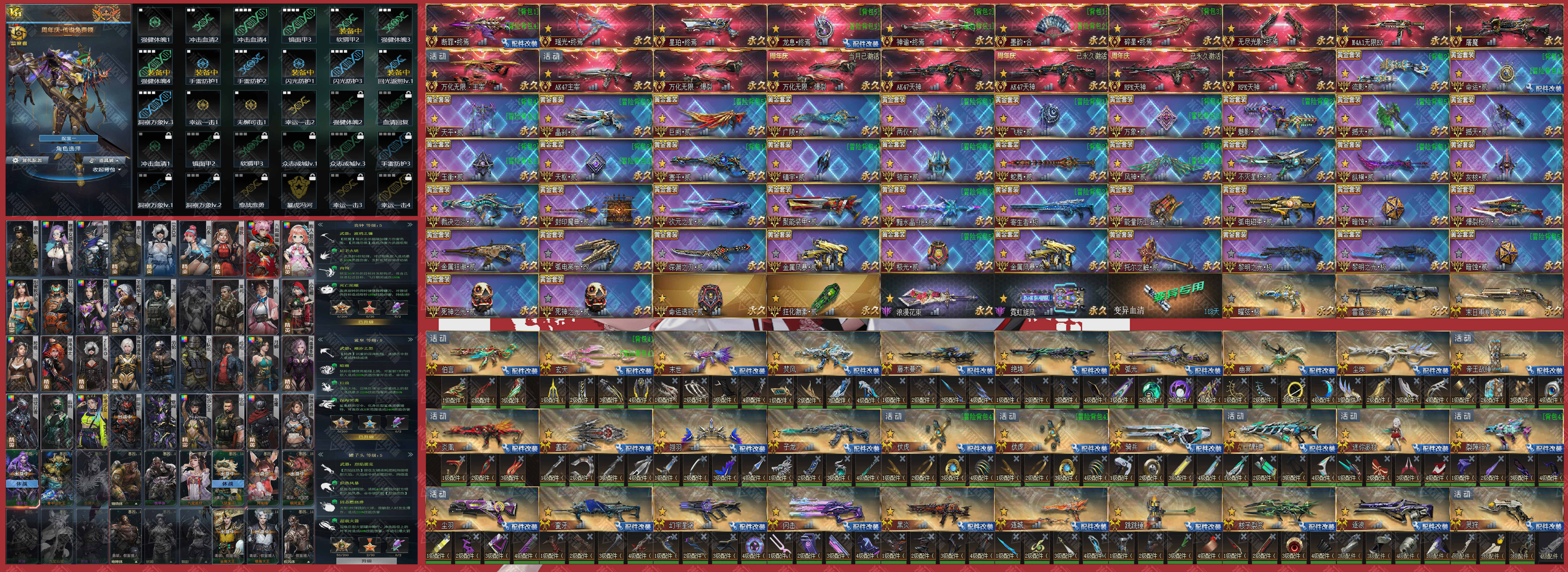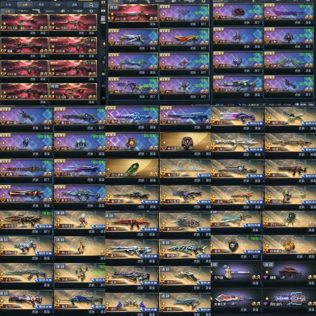 配件武器:鬼刀 藤木 闪击 末世 焚风 伏虎 幽冥 绝境 尘埃 弧光 守卫者 黑炎 连城 核子 裂隙 蛮牙 玄天 炎凰 灵狩 凝视 罗网 浪漫花束 霓虹旋风