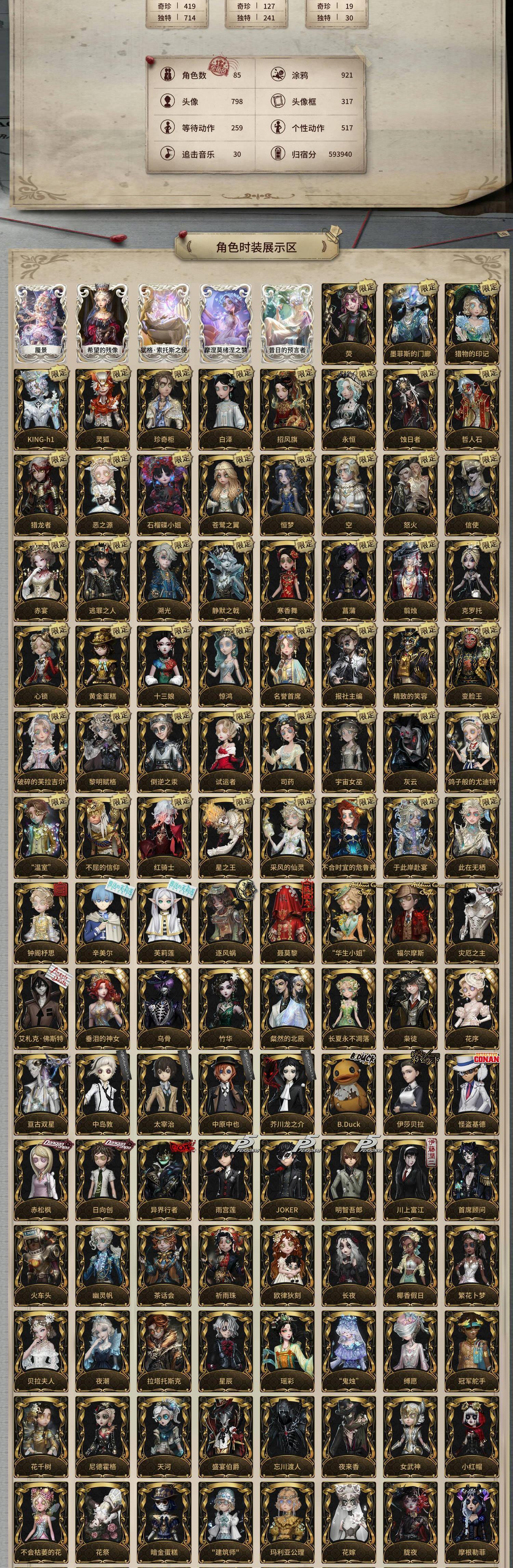 稀世135奇珍41756稀世1奇珍18434稀世64奇珍127角色数85涂鸦921头像798头像框317等待动作