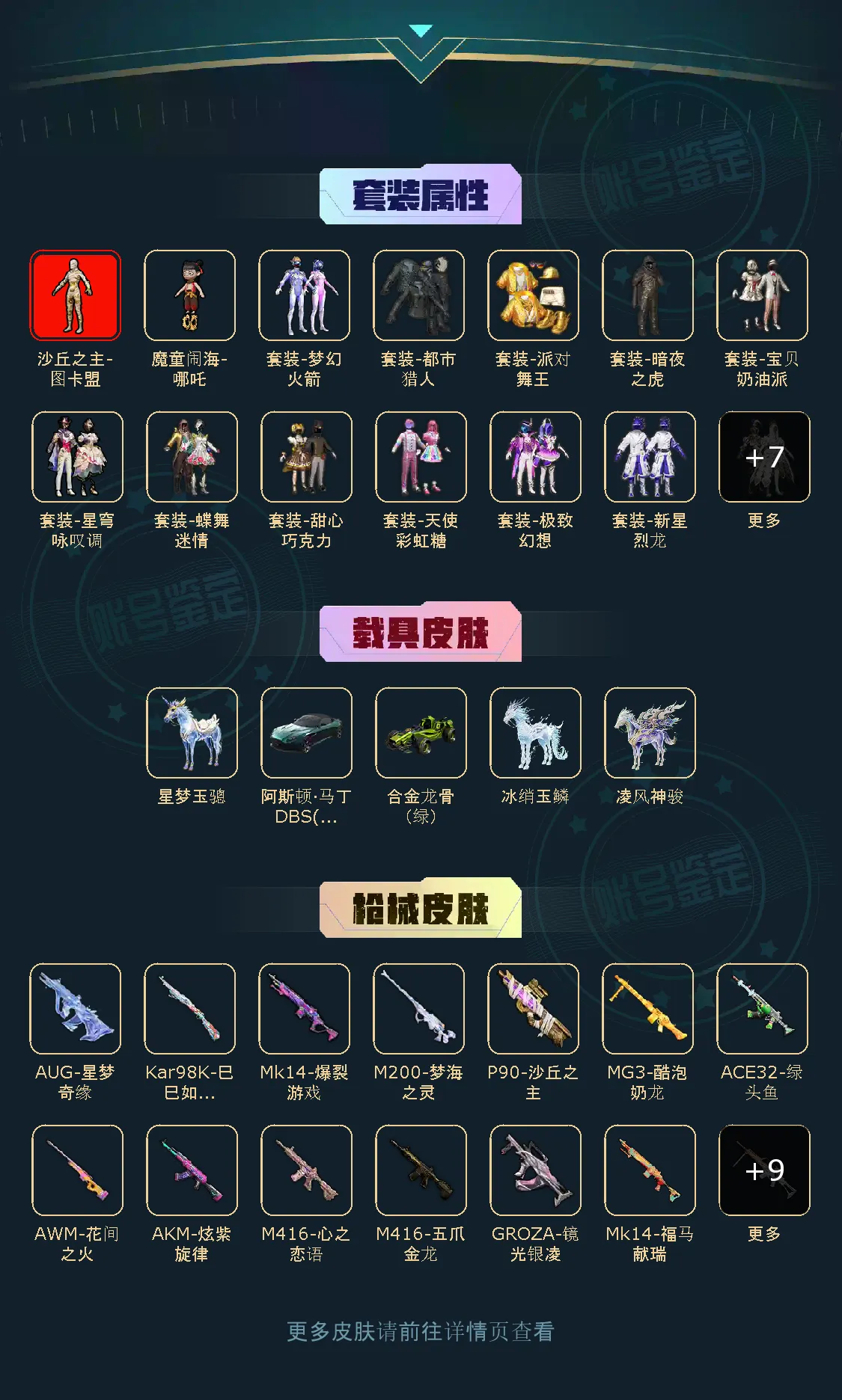 【稀有资产】沙丘之主-图卡盟[3级]/角色-魔童闹海-哪吒[1级]/AUG-星梦奇缘[9级]/M416-五爪金龙/M416-心之恋语/SCAR-L-魔童闹海 哪吒/GROZA-精灵之光/AUG-许七安/巡查员上衣/小恶魔头饰/套装-派对舞王/套装-深海小丑鱼/套装-都市猎人/套装-奇异狩猎者/套装-浪漫天命/套装-雪山精英/套装-暗影哥特/套装-龟仙人/套装-迅捷狂鲨/套装-浪漫波比/套装-纯白跃动/套装-攀登者/套装-东方飞龙/套装-时之沙漏/玩偶服-憨乐熊二/角色-粉雾星云/角色-都市丽猫/角色-许七安/角色-临安公主/角色-怀庆长公主/角色-海琴烟/套装-忍者信条/套装-浪客战士/撬棍-火尖枪