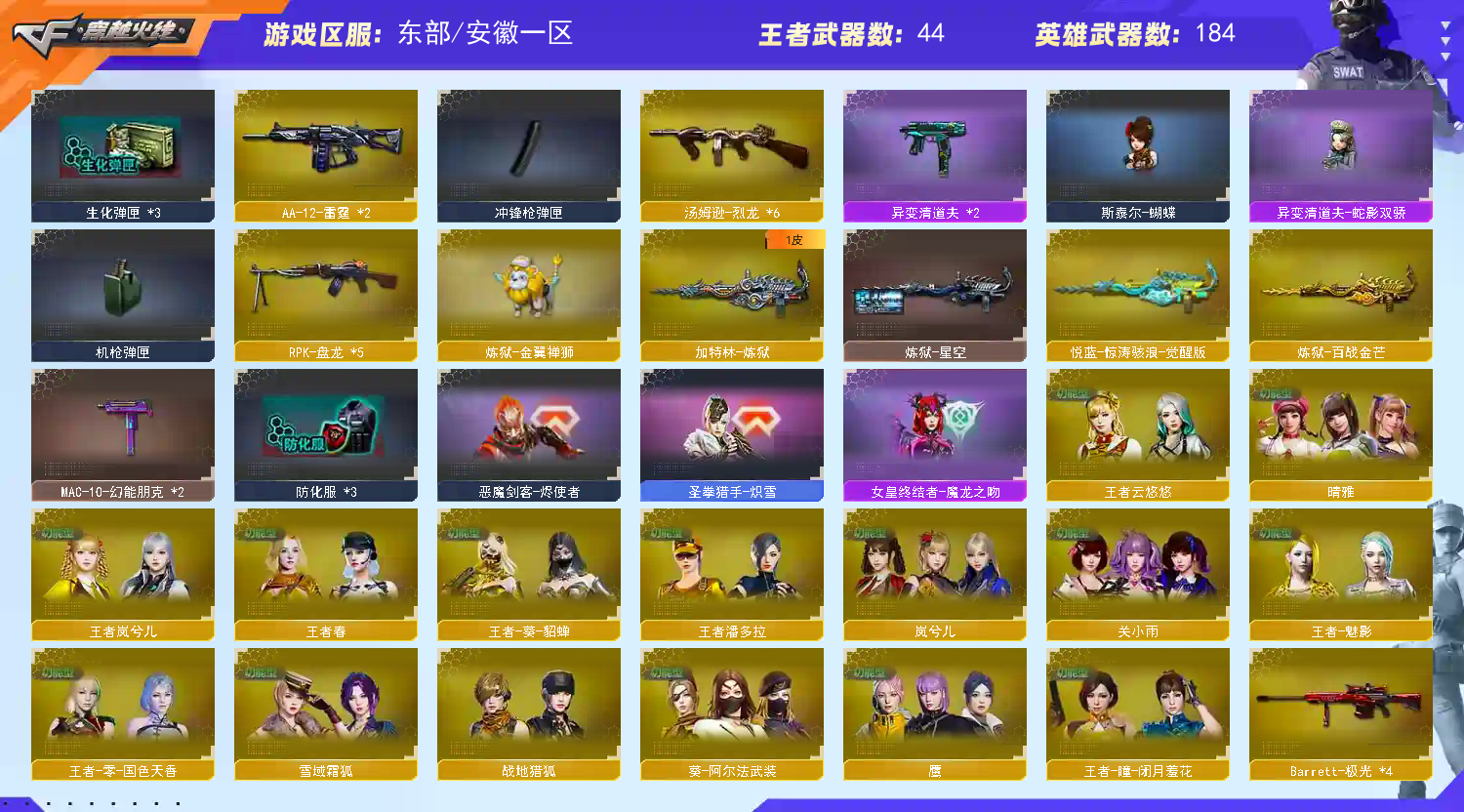 补充如下:幻神光海夜岚 幻神宠儿 幻神巅峰荣耀 爆破生化挑战天花板 全部音效卡 六烈六盘蝴蝶 五把蝴蝶刀 清道夫毒蜂 冠军薇,特,刃,二十把高质量副武器 炽芒碟刃四皮 五把炽芒碟刃 玄武王者玄武 天戎 天袭 两把G36C幻影 妮妮 裁决三件套全部音效卡