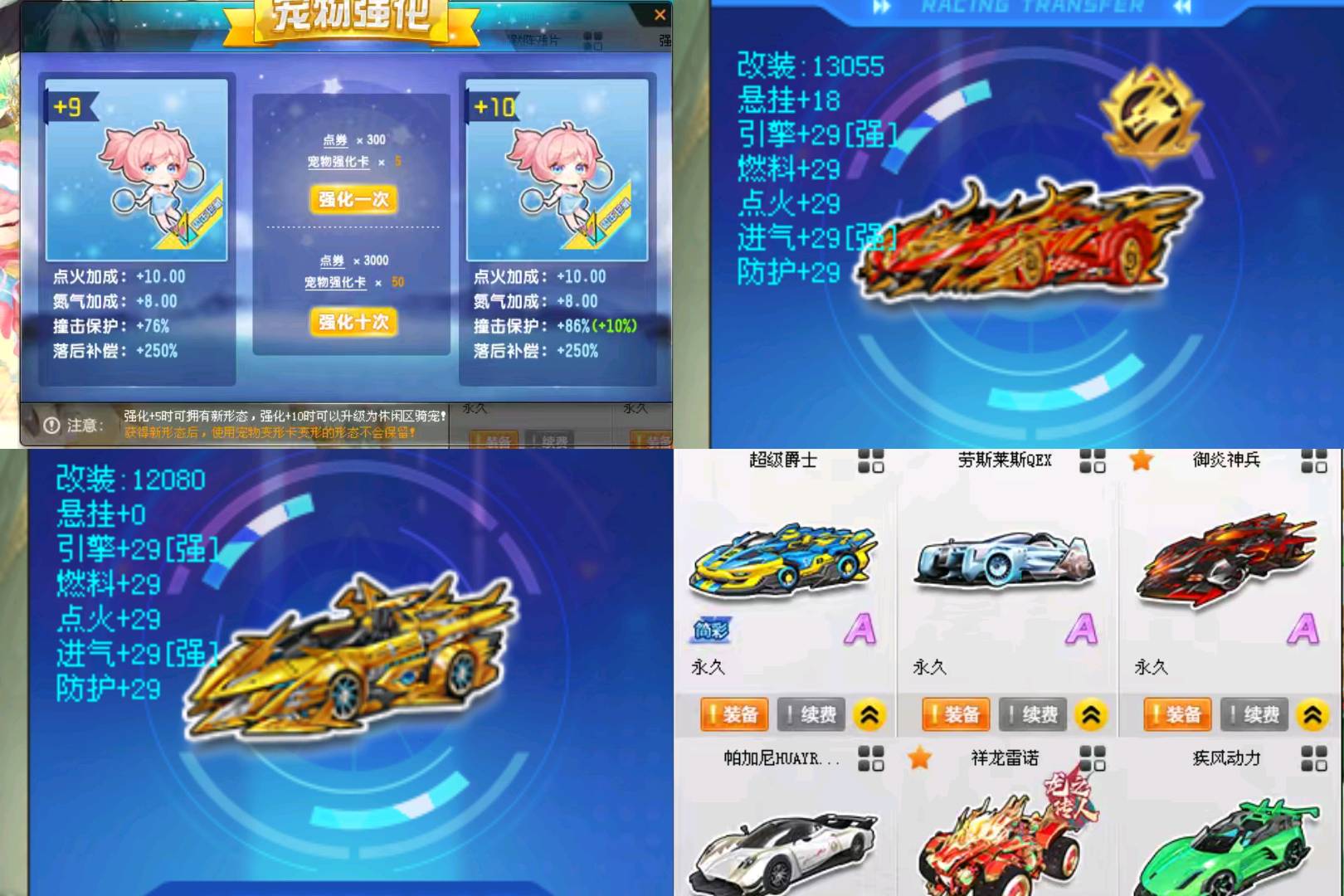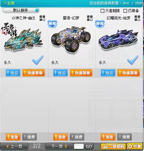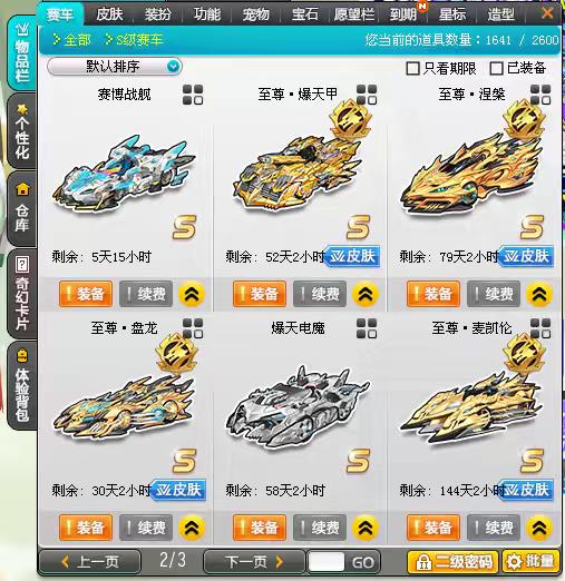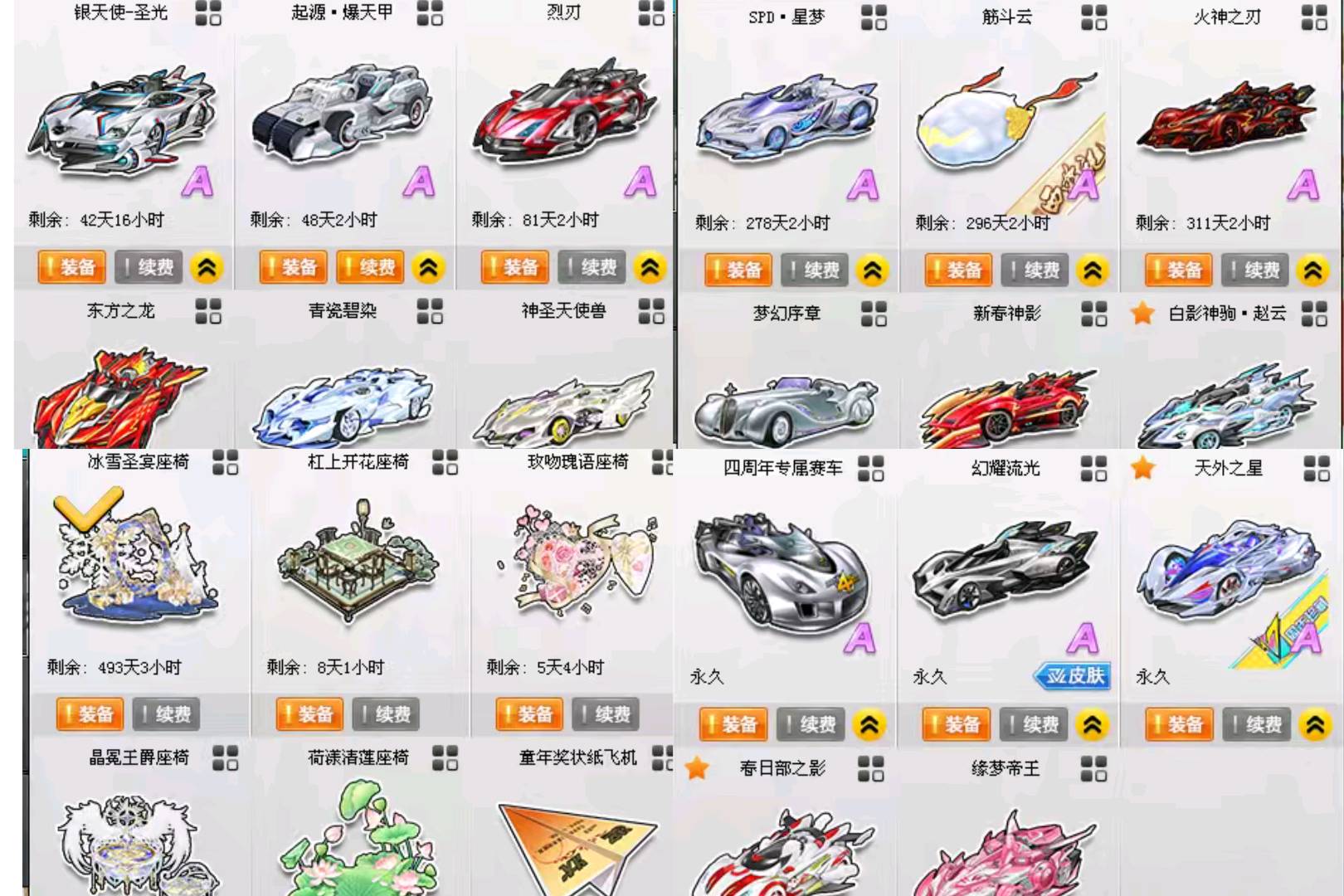 5永久S,4项+29,悬挂+18 双4级竞速宝石至尊火麒麟带年限皮肤玉如意,4项+29众神之神带幽兰皮肤和宙斯期限皮肤,期限终极迈凯伦带终极神屠龙皮肤。永久暴风战舰,超核时空战舰,极星之翼带芙蕾雅皮肤,2T2幽冥剑圣,雷霆机甲, 3T1黄河魂九鼎,星际探索者,刑天战斧,还有诸多两至三个月期限的至尊系列,爆天系列等227,226S车共3页。永久A车14张,包含祥龙雷诺,御炎神兵,绝影神驹赵云,劳斯莱斯Eqx,新春神影,天外之星,梦幻序章等热门A车。