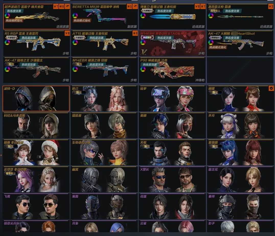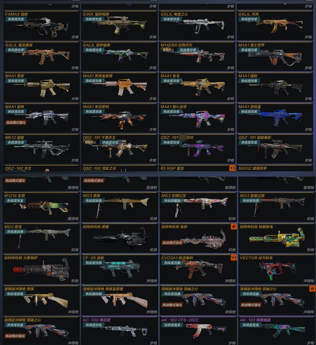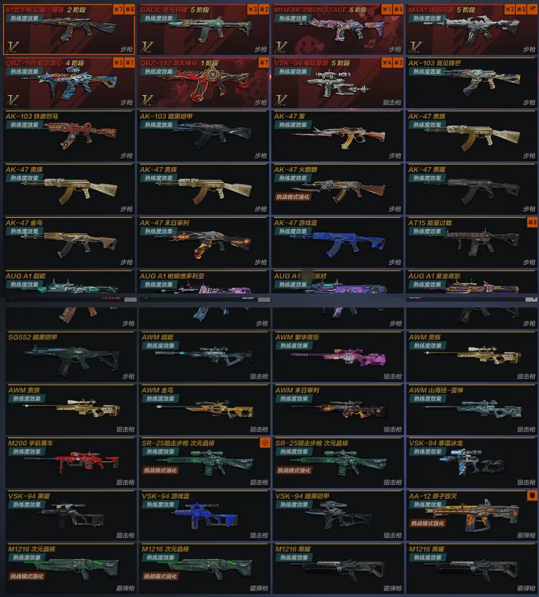限定主武:81式步枪幻翼爆音2阶段 GALIL圣光轩辕5阶段 M14EBR灵狐ONSTAGE5阶段 M4A1诗剑问道5阶段 QBZ191虹影龙心4阶段 QBZ192混天神兵1阶段 VSK94星际穿越5阶段 M14EBR白驹问天 QBZ191千面天王