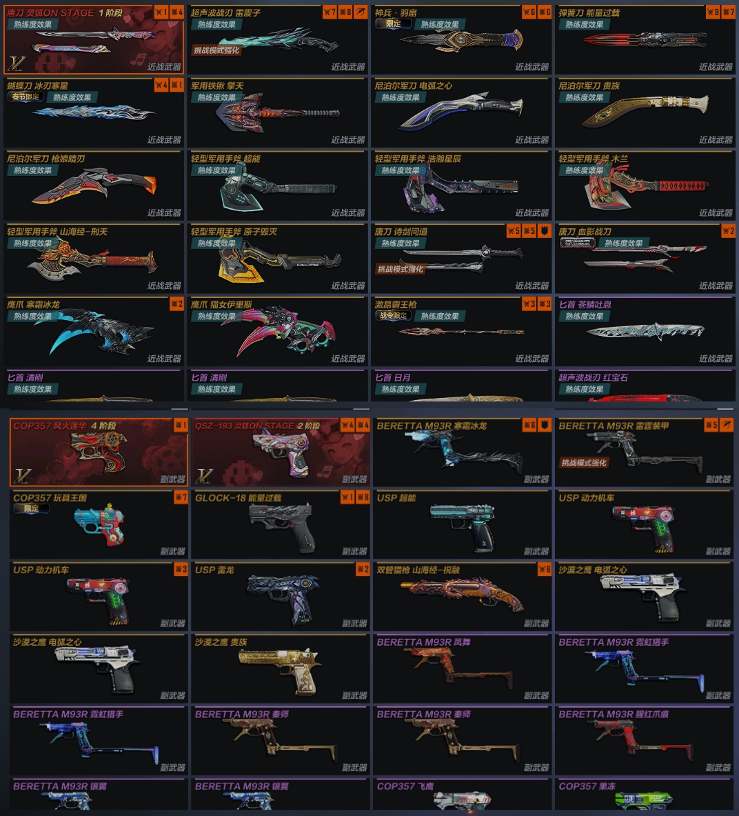 副手:COP357风火莲花4阶段 QSZ193灵狐ONSTAGE2阶段 BERETTAM93R寒霜冰龙 BERETTAM93R雷霆装甲 COP357玩具王国 GLOCK18能量过载 USP超能 USP动力机车X2 USP雷龙 双管猎枪山海经祝融 沙漠之鹰电弧之心X2 沙漠之鹰贵族