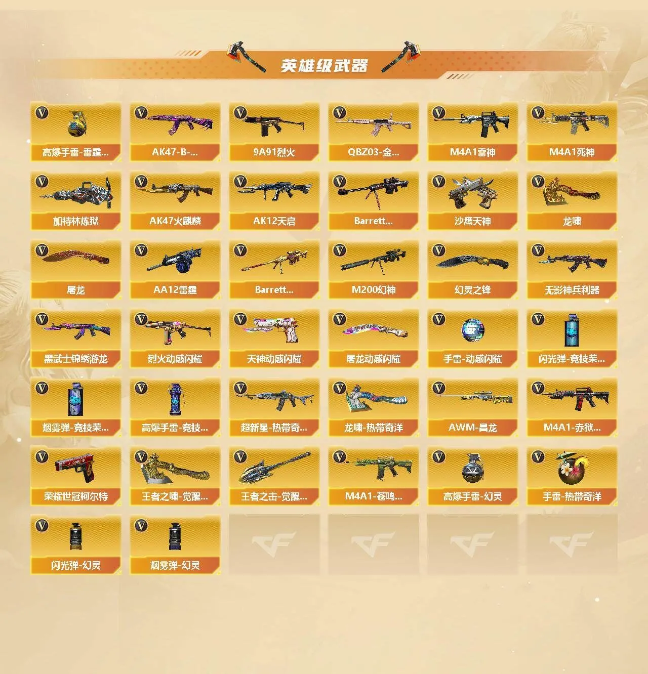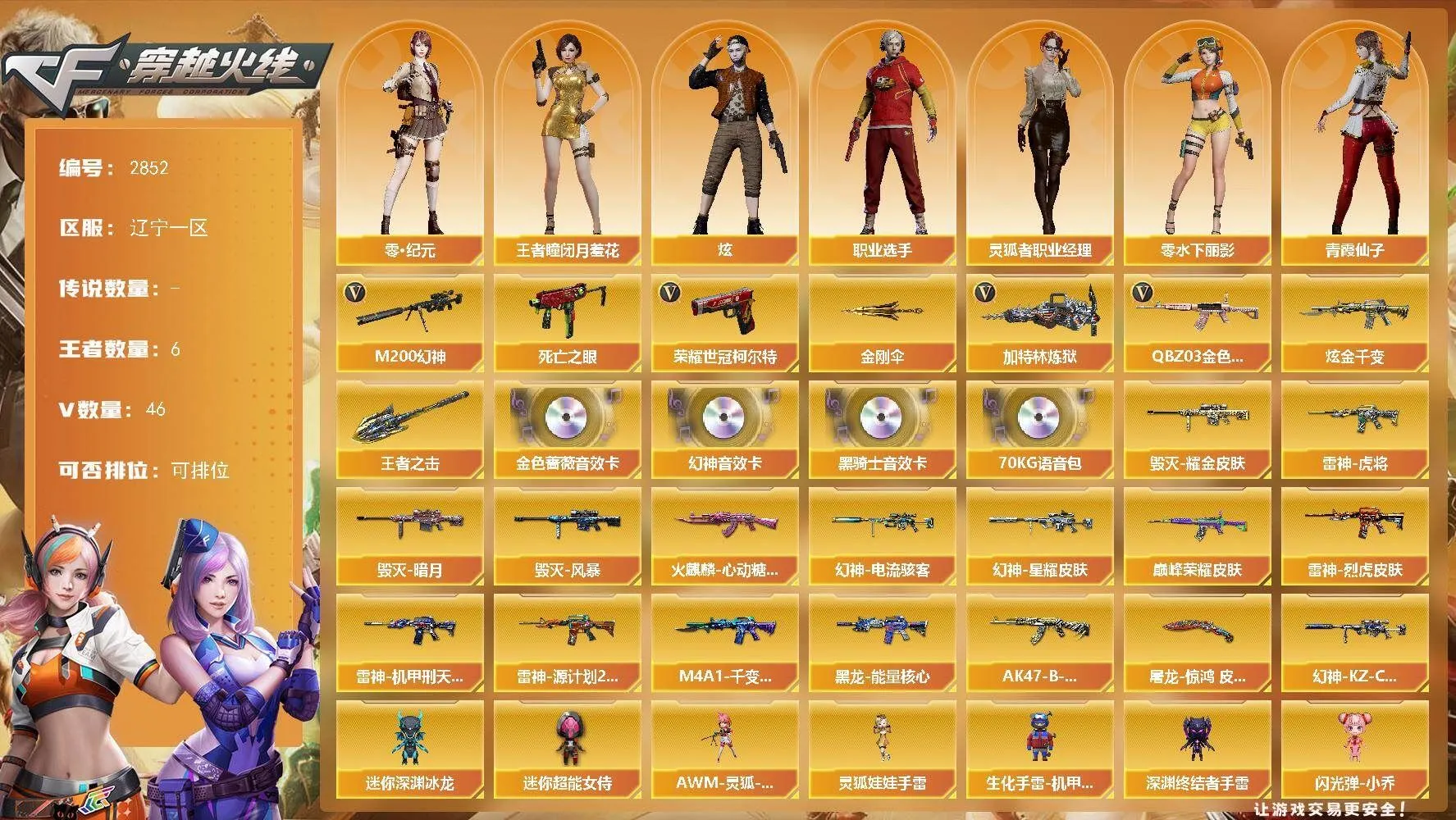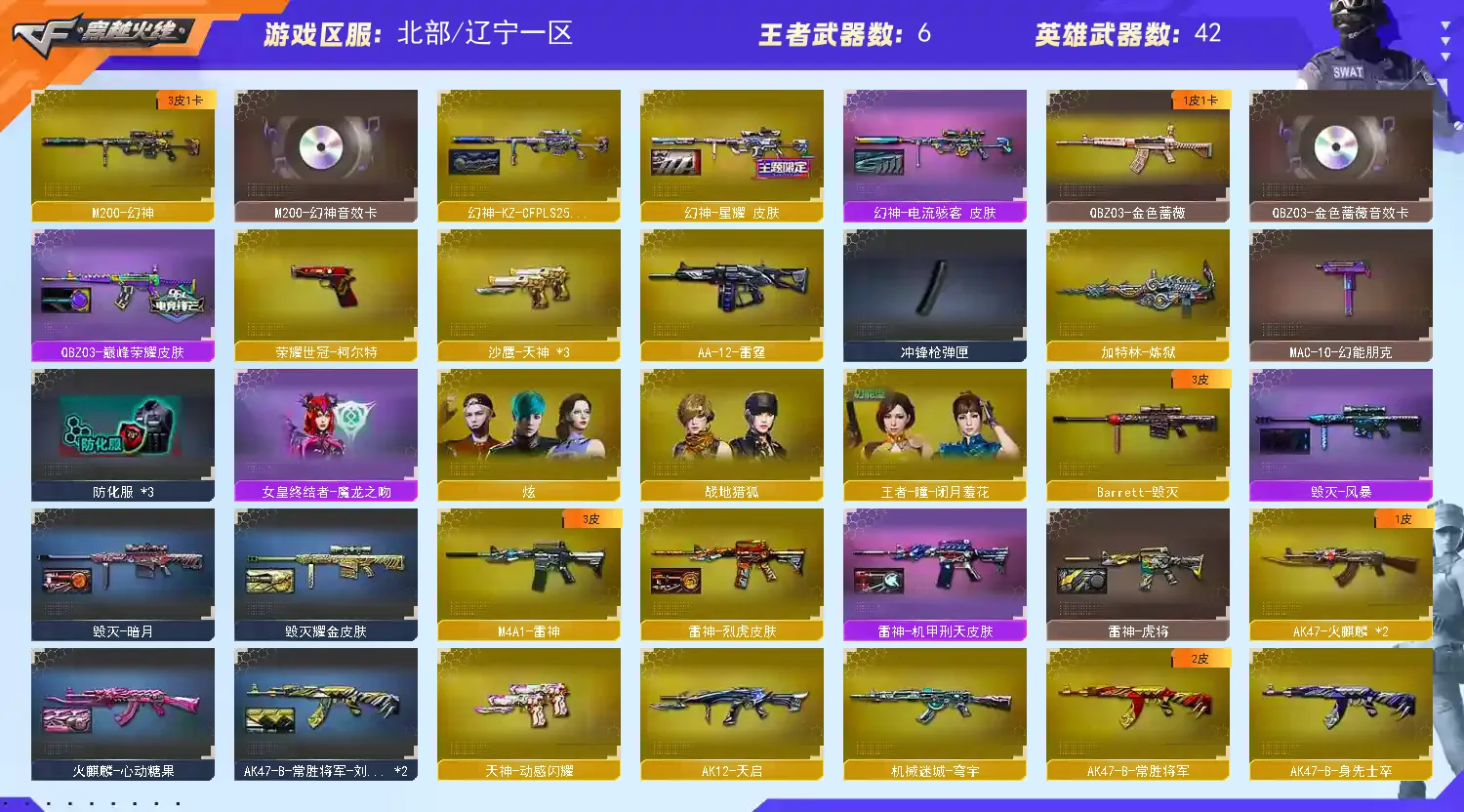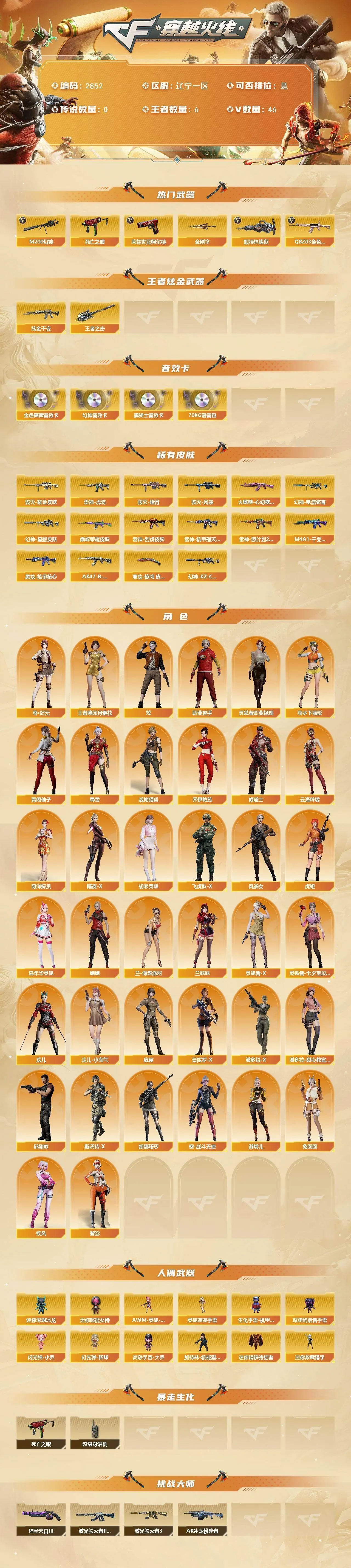 【热门武器】:QBZ03-金色蔷薇,M200-幻神,死亡之眼,荣耀世冠-柯尔特,加特林-炼狱,金刚伞【王者炫金武器】:王者之击,炫金千变【音效卡】:M200-幻神音效卡,M4A1-黑骑士音效卡,QBZ03-金色蔷薇音效卡,70KG语音包【皮肤】:幻神-星耀 皮肤,幻神-电流骇客 皮肤,幻神-KZ-CFPLS25冠军 皮肤,QBZ03-巅峰荣耀皮肤,雷神-虎将,雷神-烈虎皮肤,雷神-机甲刑天皮肤,雷神-源计划2.0专属 皮肤,火麒麟-心动糖果,毁灭-暗月,毁灭耀金皮肤,毁灭-风暴,M4A1-千变-孔明皮肤,黑龙-能量核心,AK47-B-常胜将军-刘备*2,屠龙-惊鸿 皮肤【角色】:炫,零·纪元,战地猎狐,王者-瞳-闭月羞花,奇洋探员,乔伊教练,修道士,云海玲珑,暗夜-X,初恋灵狐,飞虎队-X,风暴女,虎妞,嘉年华灵狐,疾风,娟娟,兰-海滩派对,兰妹妹,零-水下丽影,灵狐者-X,灵狐者-七夕宝贝,4防灵狐者-职业经理,龙儿,龙儿-小淘气,麻雀,曼陀罗-X,潘多拉-X,潘多拉-甜心教官,邱刚敖,青霞仙子,斯沃特-X,蜀雪,兔囡囡,新娜塔莎,樱-战斗天使,游珑儿,职业选手,智影【人偶武器】:迷你钢铁终结者,迷你救赎猎手,加特林-机械猎手,AWM-灵狐-15周年嘉年华*2,迷你深渊冰龙,生化手雷-机甲核心,深渊终结者手雷,闪光弹-小乔,闪光弹-貂蝉,高爆手雷-大乔,迷你超能女侍,灵狐娃娃手雷【暴走生化】:死亡之眼,超级对讲机【挑战大师】:AK47-冰龙粉碎者,激光毁灭者III-白马银枪,激光毁灭者III,神圣爆裂者-末日III*2【英雄级武器】:AK47-火麒麟*2,M4A1-雷神,M4A1-死神,AK12-天启,无影-神兵利器,黑武士-锦绣游龙,超新星-热带奇洋,QBZ03-金色蔷薇,9A91-烈火,烈火-动感闪耀,AK47-B-常胜将军,机械迷城-穹宇,Barrett-毁灭,M200-幻神,Barrett-朱雀,加特林-炼狱,AA-12-雷霆,沙鹰-天神*3,荣耀世冠-柯尔特,天神-动感闪耀,屠龙*2,龙啸,幻灵之锋,屠龙-动感闪耀,龙啸-热带奇洋,王者之啸-觉醒版,王者之击-觉醒版,高爆手雷-幻灵,高爆手雷-竞技荣光,手雷-动感闪耀,手雷-热带奇洋,高爆手雷-雷霆王者-觉醒版,闪光弹-幻灵,闪光弹-竞技荣光*2,烟雾弹-幻灵,烟雾弹-竞技荣光,M4A1-赤狱骑士,M4A1-苍鸣雷神,AWM-昌龙【道具】:BS战队炫彩背包,云山科技背包,亚洲杯纪念炫彩背包,奇洋探员-海龟背包,炫彩背包,热带奇洋炫彩背包,背包-洛丽塔,超级背包,女皇终结者-魔龙之吻,救世主-黑桃战神,黄金生化钩,绿色巨人,灵魂忍者*2,变异宝贝,迷雾幽灵*2,夺命之镰,防化服*3,金色流光-枪王排位*2,星辰流光-枪王排位,巅峰赛先锋-金色流光,流光-鎏金之域,流光-再燃火线,枪王排位28赛季金色流光,枪王排位29赛季金色流光,电玩兔兔表情,热带奇洋表情,动感闪耀表情,云海游龙表情,防弹头盔*3,防弹衣*4,C4工具钳*4,手雷包*4【特殊枪械】:1炼狱