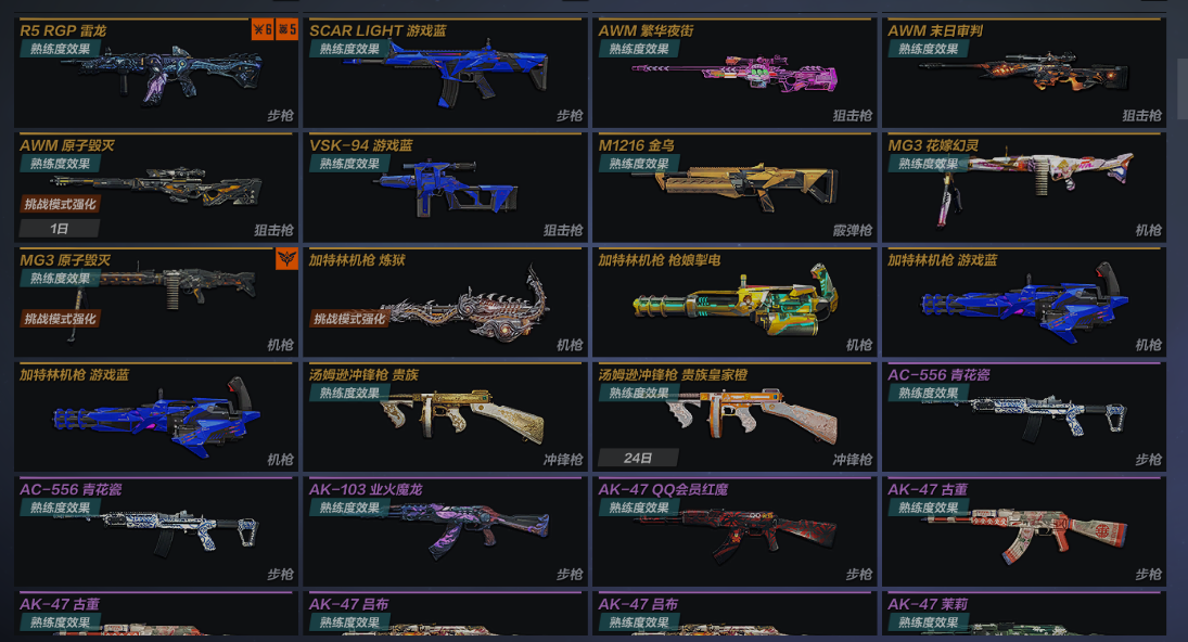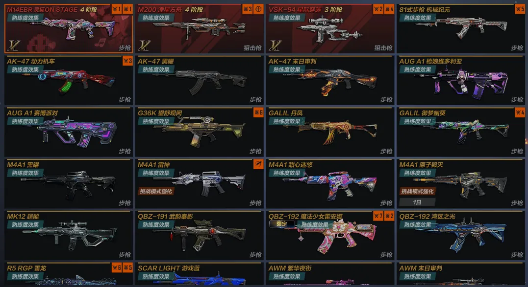 主武:M14EBR灵狐ONSEAGE 4阶段 M200湮星方舟4阶段 VSK94星际穿越3阶段 81式步枪机械纪元 AK47动力机车 AK47黑曜 AK47末日审判 AUGA1枪娘维多利亚 AUGA1赛博派对 G36K望舒观澜 GALIL丹凤 GALIL御梦幽葵 M4A1黑曜 M4A1雷神 M4A1甜心迷悠 MK12超能 QBZ191武韵秦影 QBZ192魔法少女蕾安娜 QBZ192湾区之光 R5RGP雷龙 SCARLIGHT游戏蓝 AWM繁华夜街 AWM末日审判 VSK94游戏蓝 M1216金乌 MG3花嫁幻灵 MG3原子毁灭 加特林机枪炼狱 加特林机枪枪娘掣电 加特林机枪游戏蓝X2 汤姆逊冲锋枪贵族
