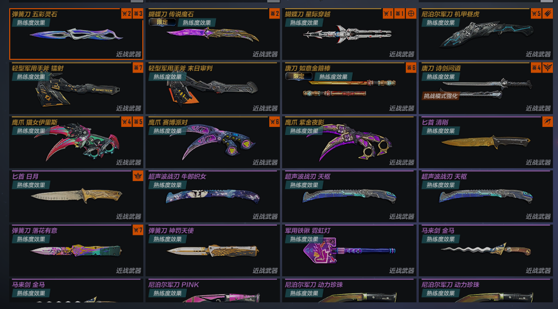 近战:弹簧刀五彩灵石 蝴蝶刀传说魔石 蝴蝶刀星际穿越 尼泊尔军刀机甲昼虎 轻型军用手斧镭射 轻型军用手斧末日审判 唐刀如意金箍棒 唐刀诗剑问道 鹰爪猫女伊里斯 鹰爪赛博派对 鹰爪紫金夜影