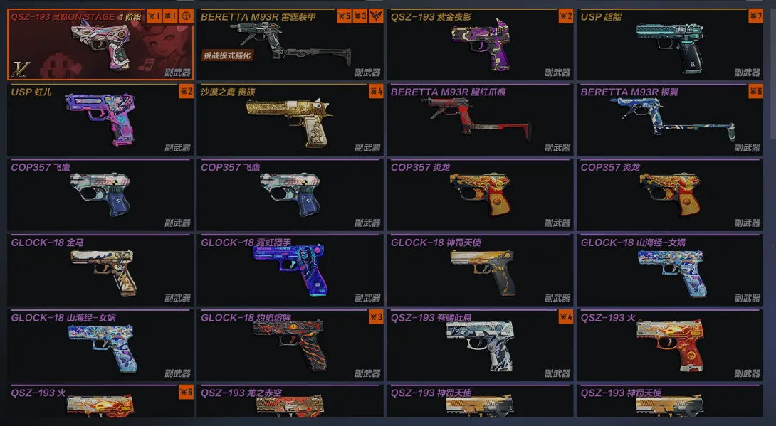 副手:QSZ193灵狐ONSRAGE1阶段 BERETTAM93R雷霆装甲 QSZ193紫金夜影 USP超能 USP虹儿 沙漠之鹰贵族
