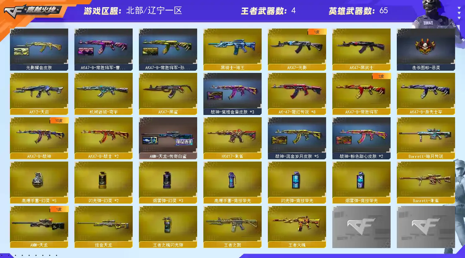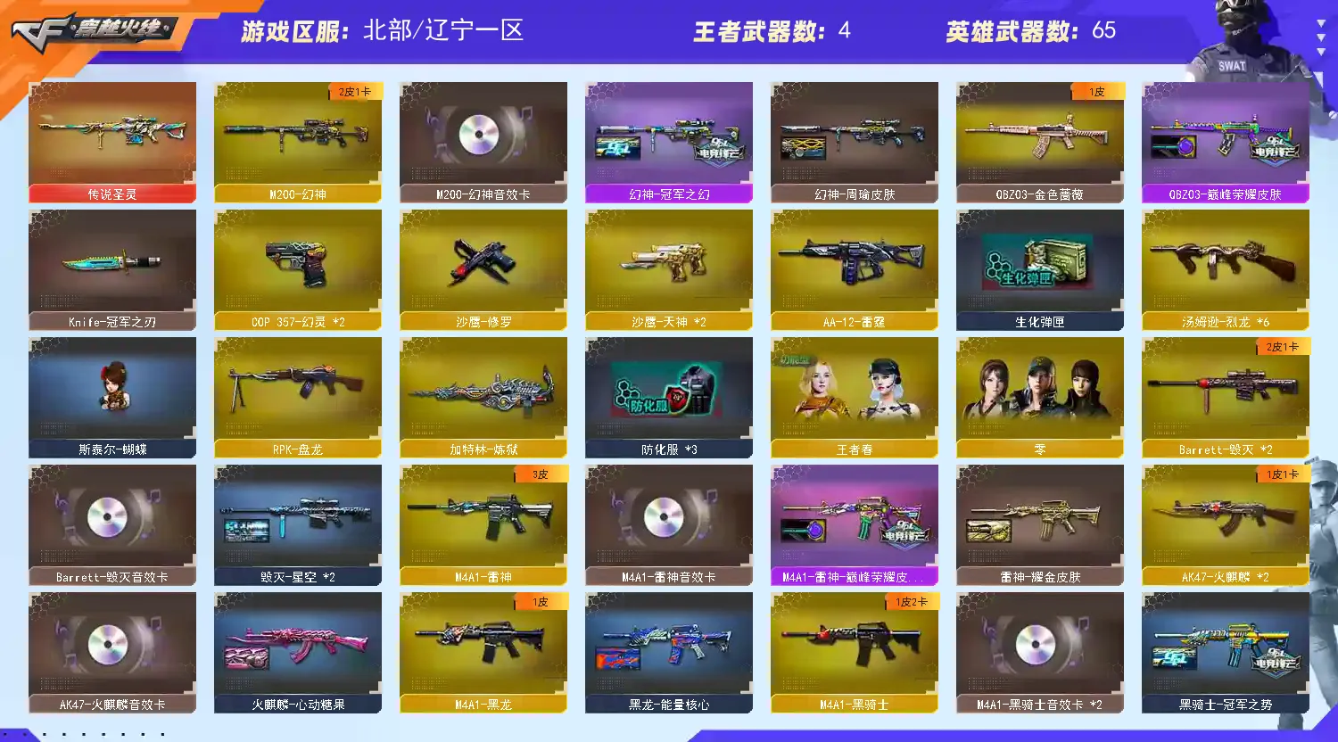 幻神三件套+Knife-冠军之刃】【M200-幻神+音效卡+幻神-冠军之幻+幻神-周瑜】【传说圣灵】【QBZ03-金色蔷薇+巅峰荣耀】【生化 盘龙 炼狱 6烈龙 蝴蝶 】【Barrett-毁灭+音效卡】【qbz银翼】【AK47-火麒麟+音效卡】【黑龙】【M4A1-雷神+音效卡+巅峰荣耀】【黑骑士+音效卡+黑骑士-冠军之势】【无影 黑武士 天启 黑鲨 hk417-朱雀 烈火】【5手枪 修罗 天神*2 cop幻灵*2】【4近战 屠龙*2 擎天 王者之锋】【手雷 幻灵雷 竞技荣光】【四防 王者春 我职业经理】【幻神音效卡 AK47-火麒麟音效卡 Barrett-毁灭音效卡 黑骑士音效卡