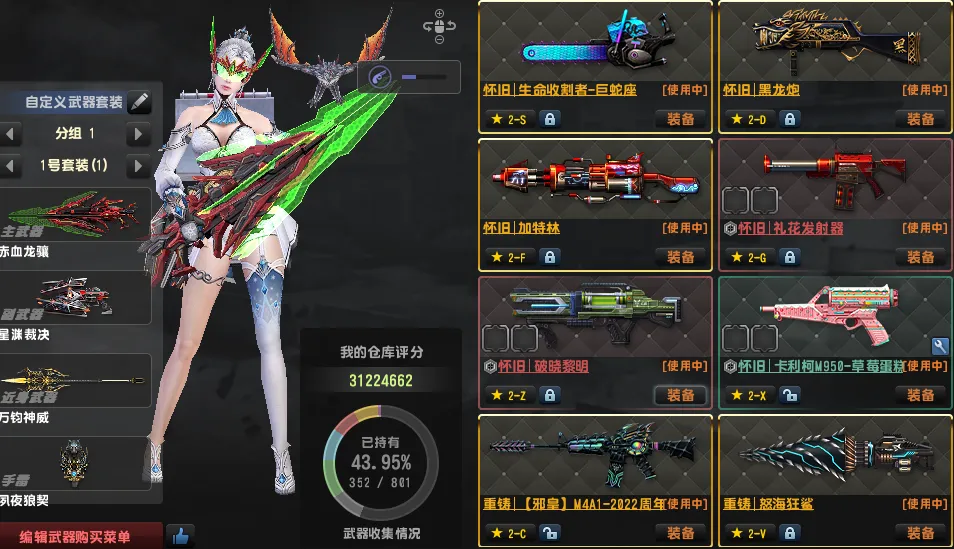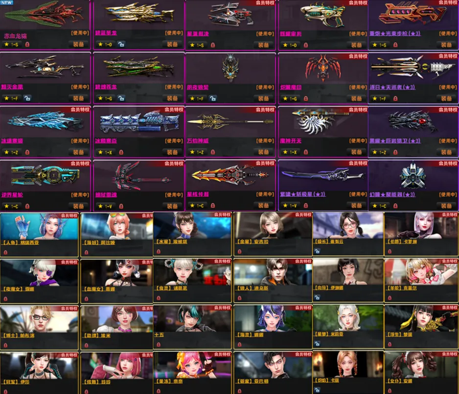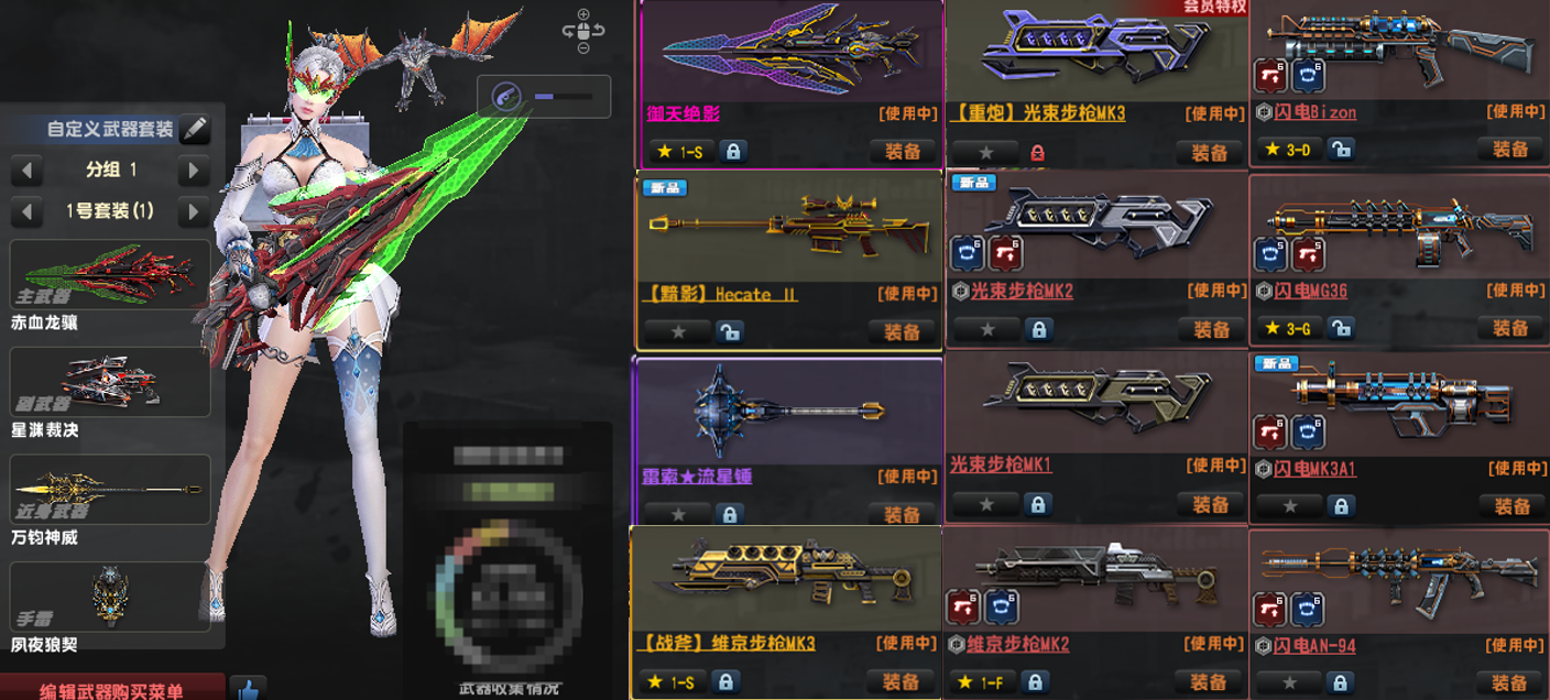 3.紫钻之外武器:特典狙黯影,特典流星锤,御天绝影,光束套,维京套,闪电全套,赛季有第12(期限)和第24赛季!强化全满,配件最少5阶~已去黑雾!