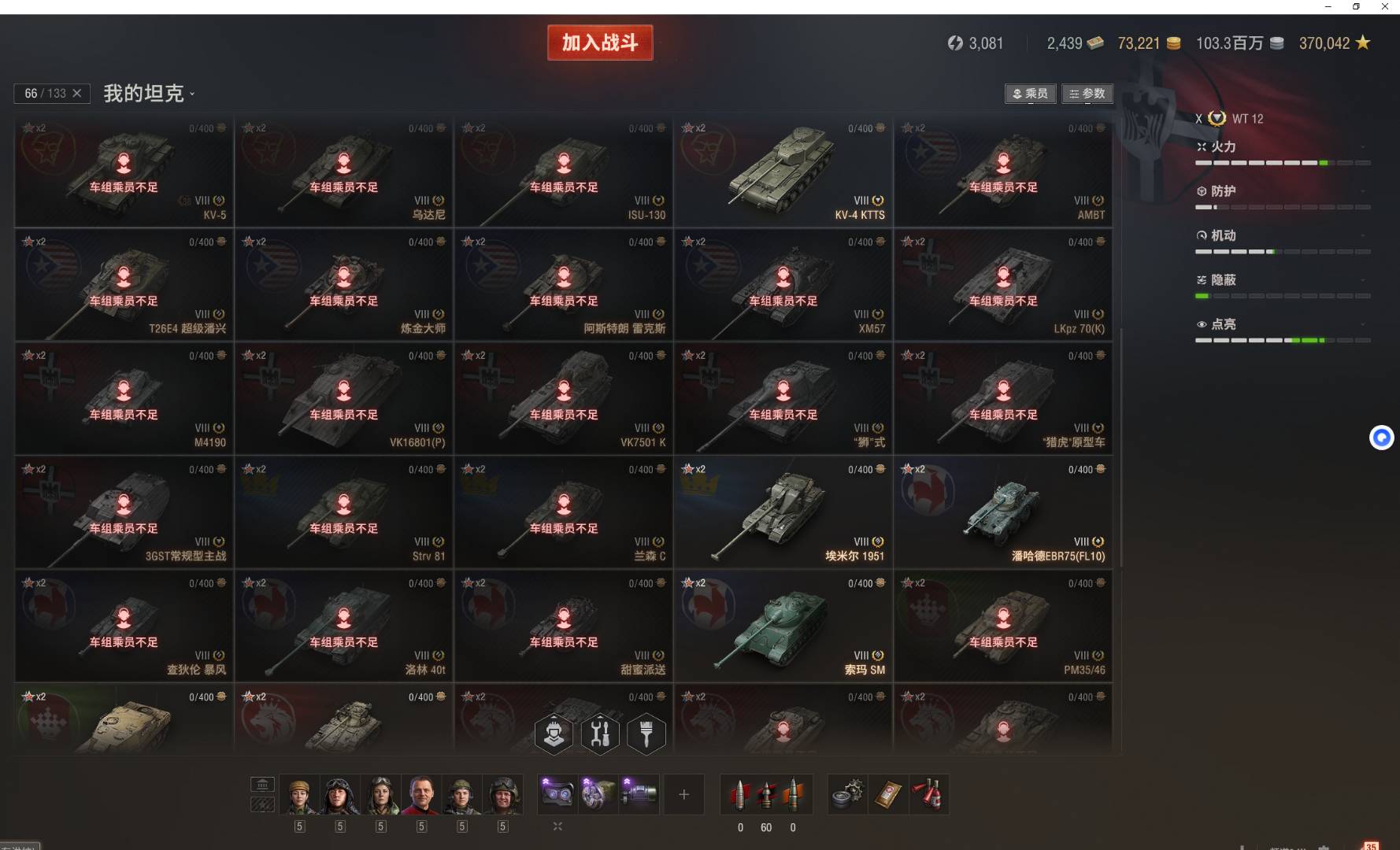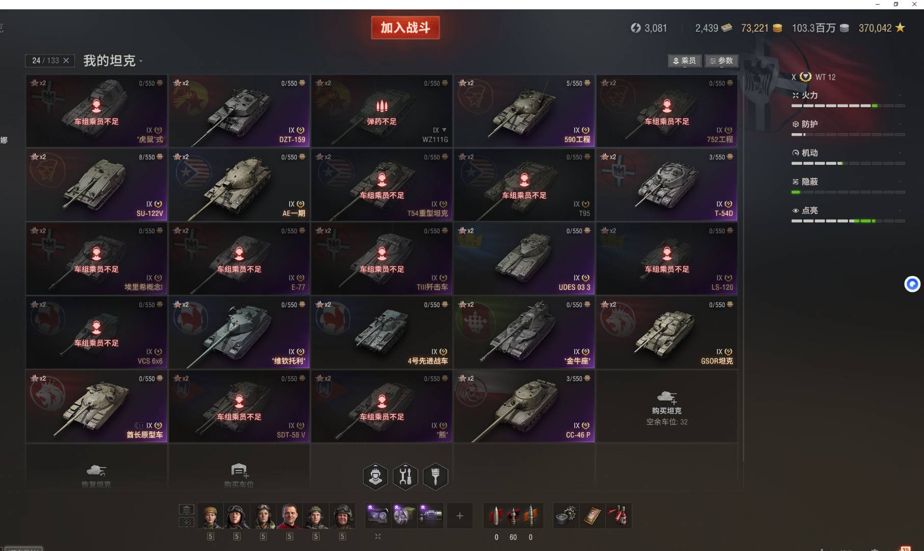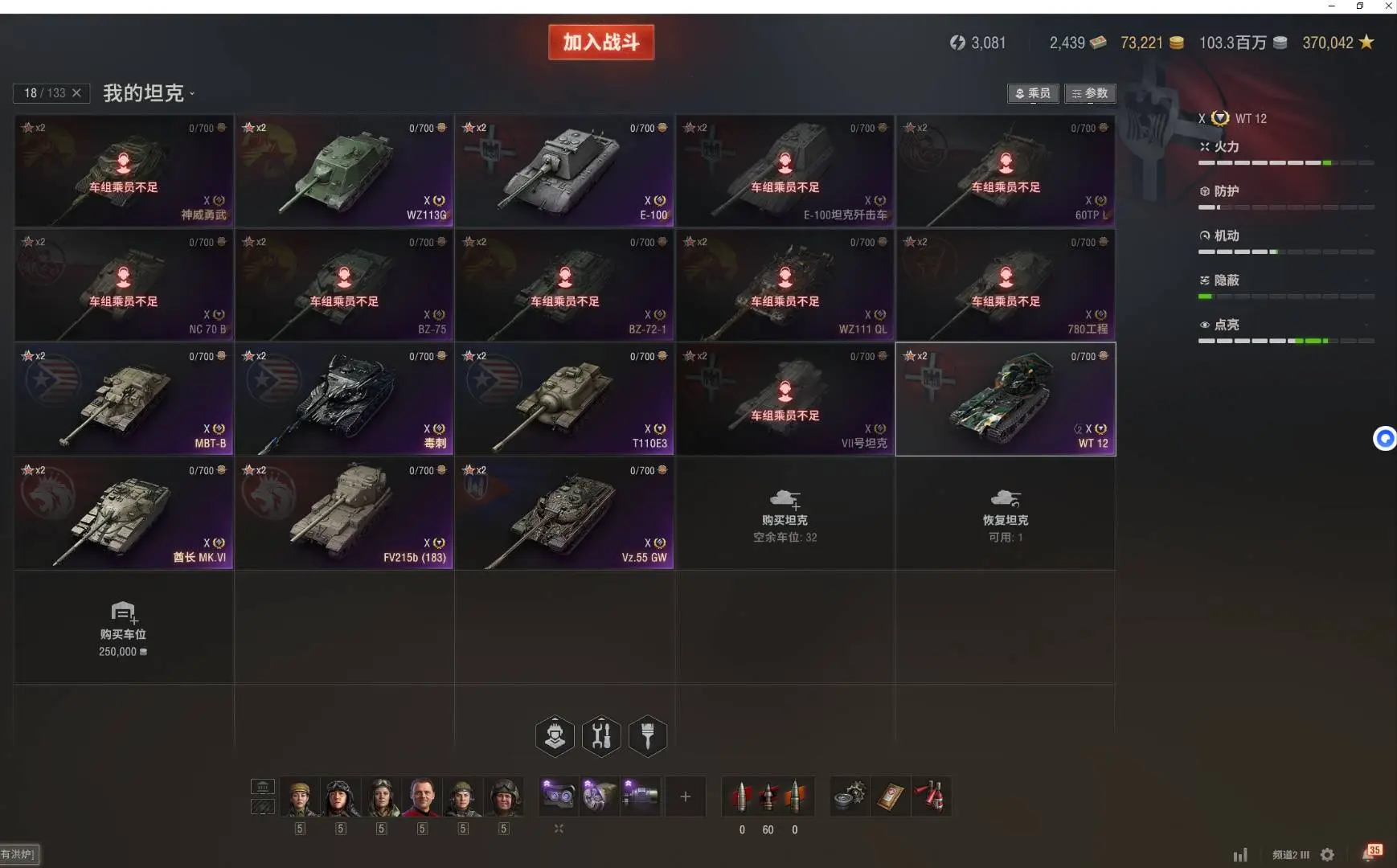 注意事项:1,进入游戏后,如果车辆情况不符。那是因为前面的玩家筛选了自己玩的坦克,其他的隐藏了。坦克显示栏,左下角小坦克标志,点进去把所有系别和级别选上,坦克就全部出来了。