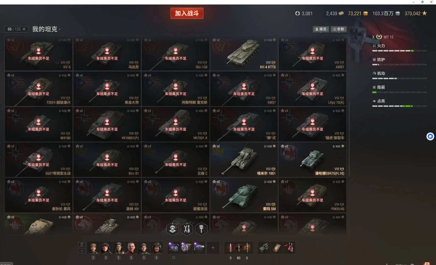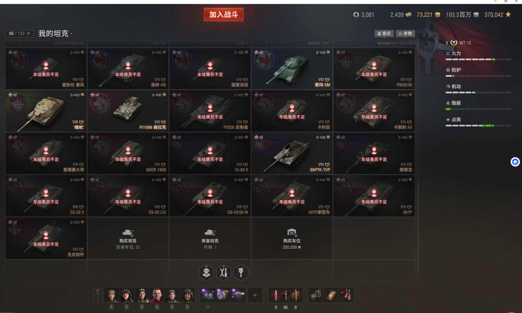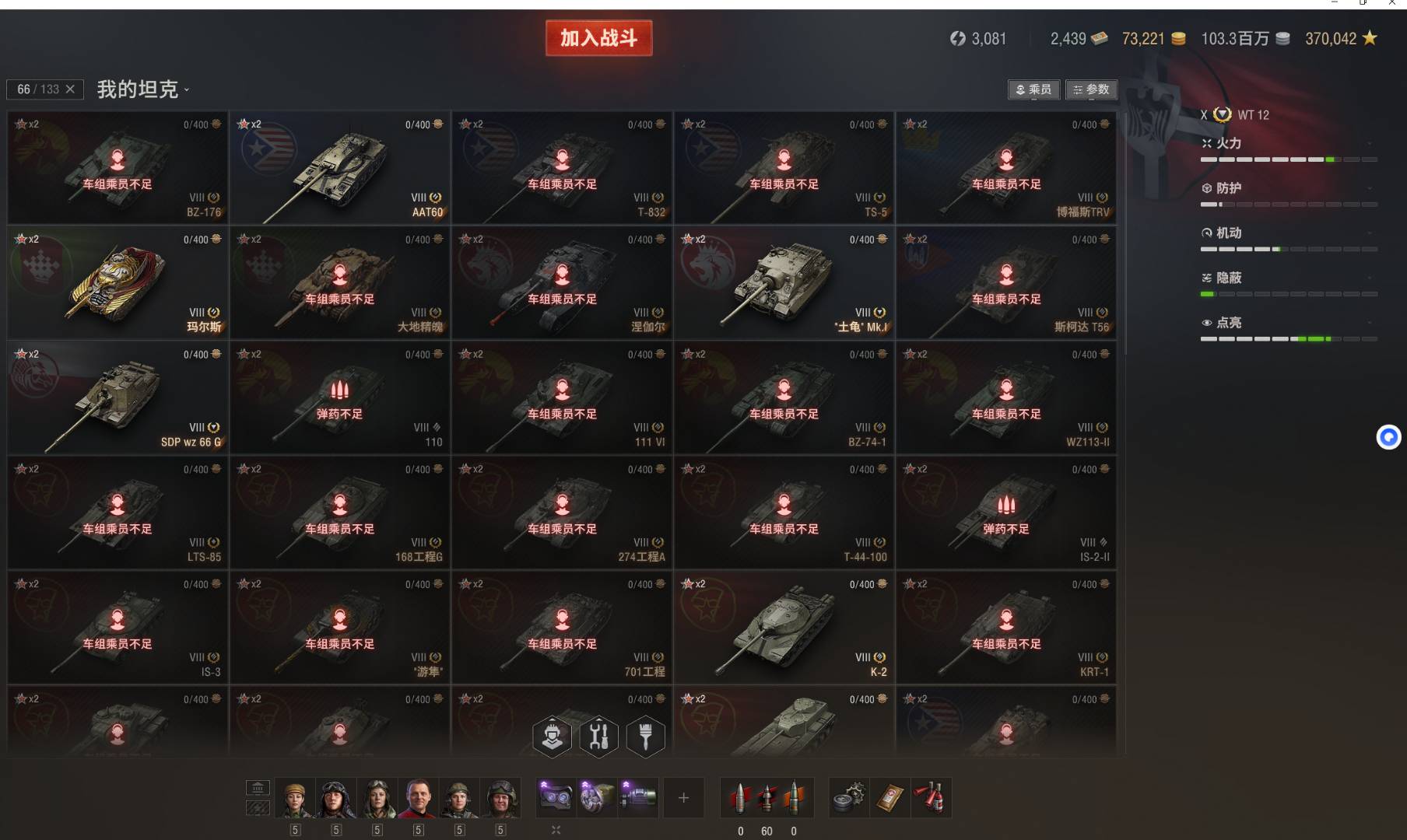 注意事项:1,进入游戏后,如果车辆情况不符。那是因为前面的玩家筛选了自己玩的坦克,其他的隐藏了。坦克显示栏,左下角小坦克标志,点进去把所有系别和级别选上,坦克就全部出来了。