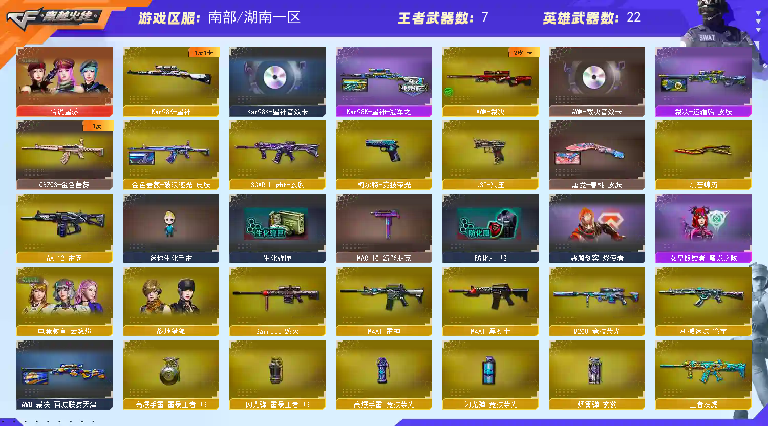 Kar98K-星神三件套 裁决三件套】【四防传说星骇】【M200-竞技荣光+四防云悠悠】【Kar98K-星神+音效卡+Kar98K星神冠军之星】【玄豹】【王者凌虎】【QBZ03-金色蔷薇+破浪逐光】【裁决+音效卡+运输船】【Barrett-毁灭】【M4A1-雷神+heartshot】【黑骑士】【3手枪 竞技荣光 usp冥王】【5近战 屠龙*2 擎天 炽芒蝶刃蝴蝶刀】【角色 战地猎狐