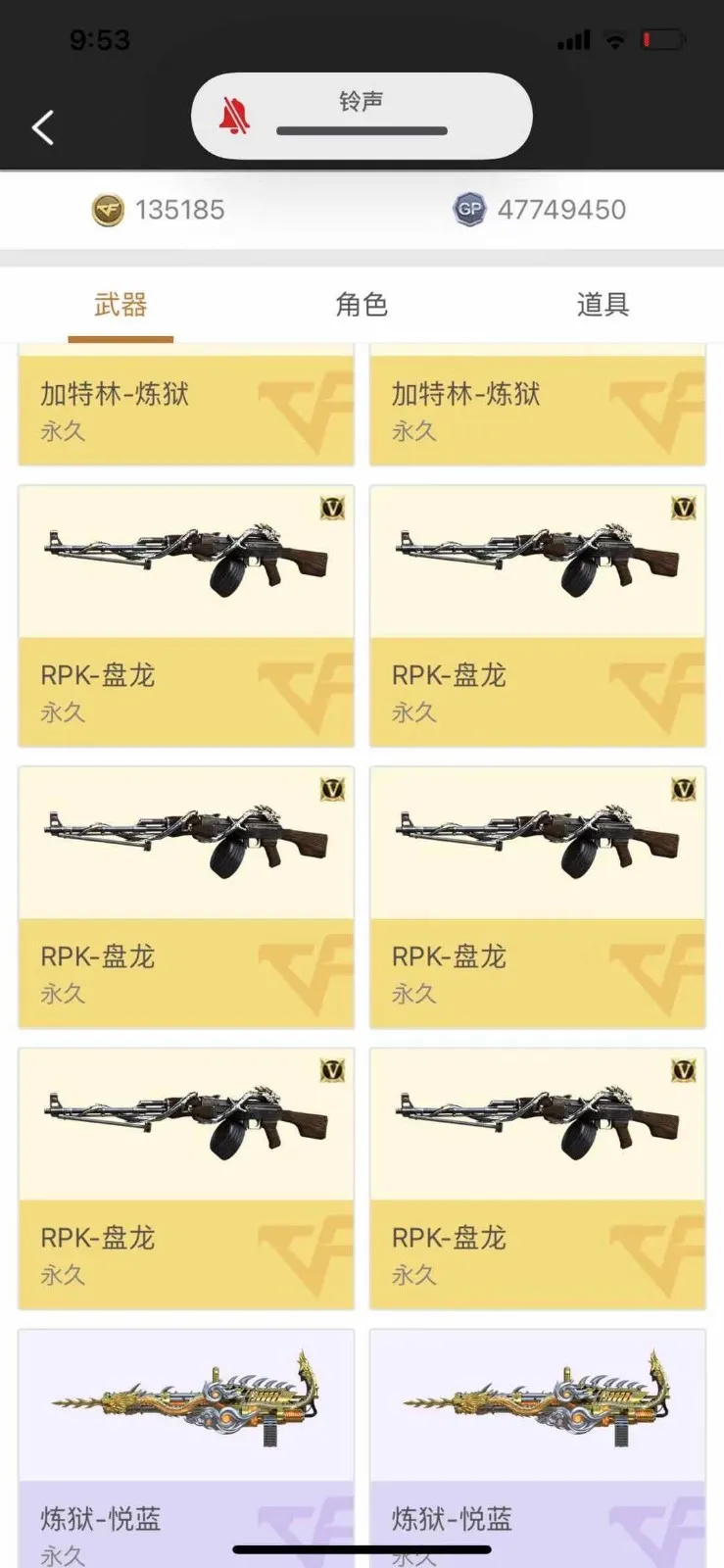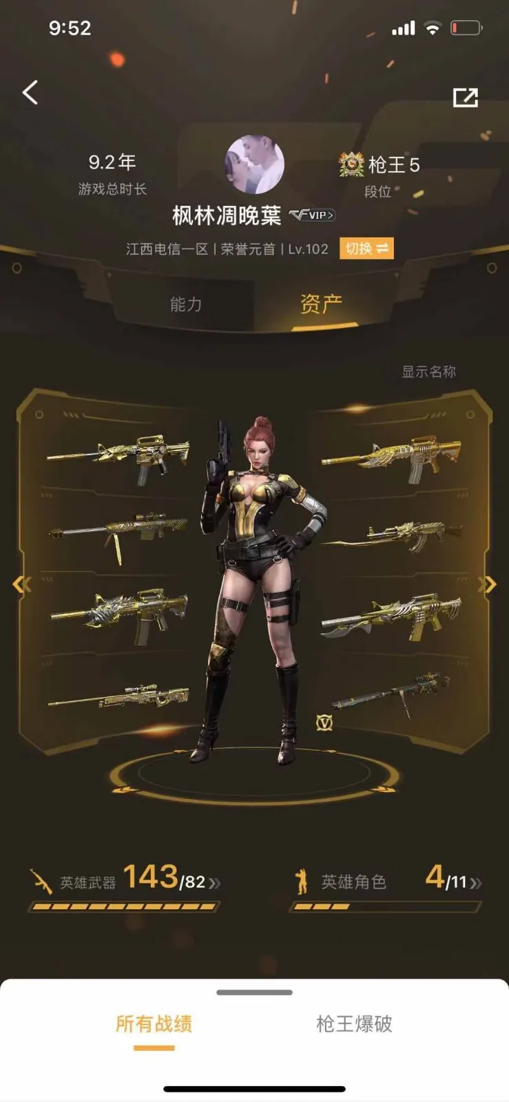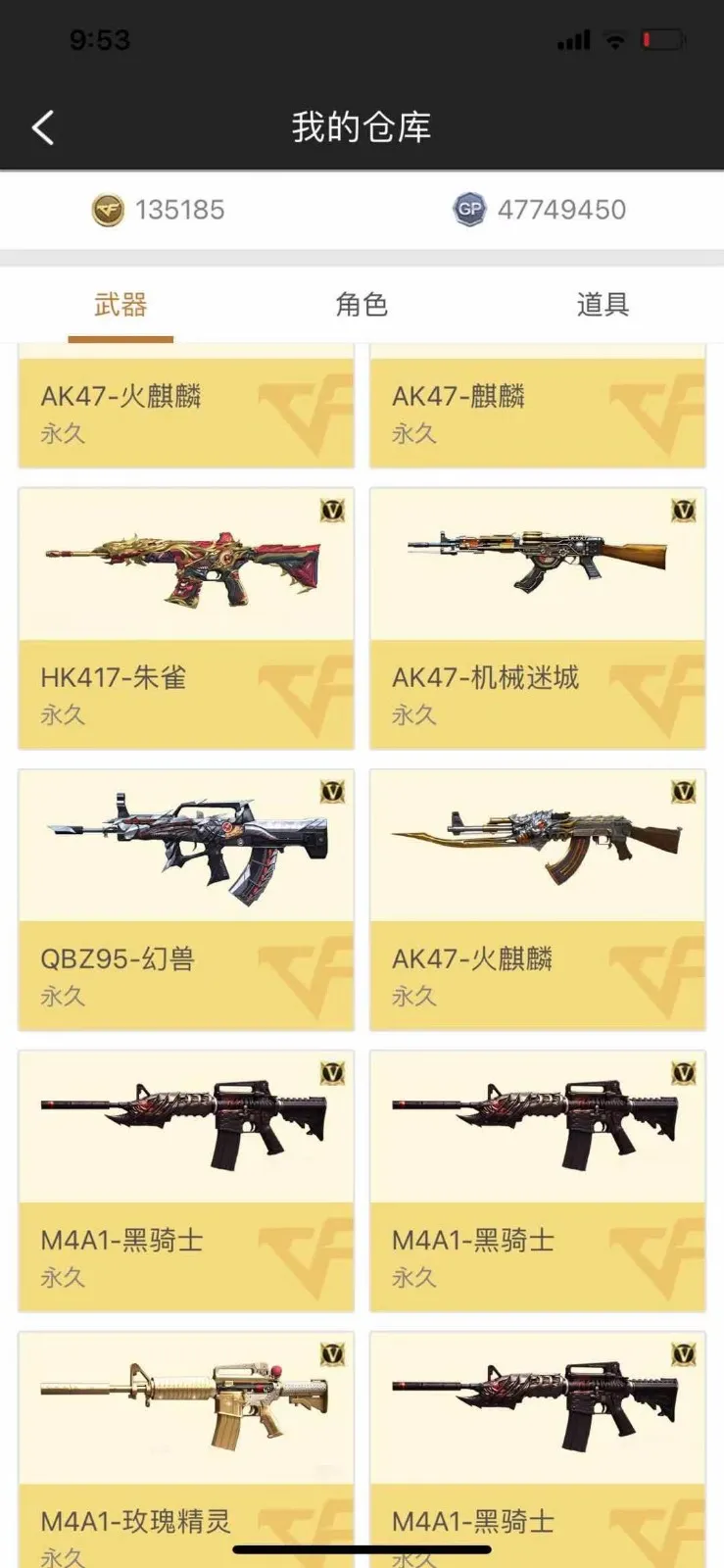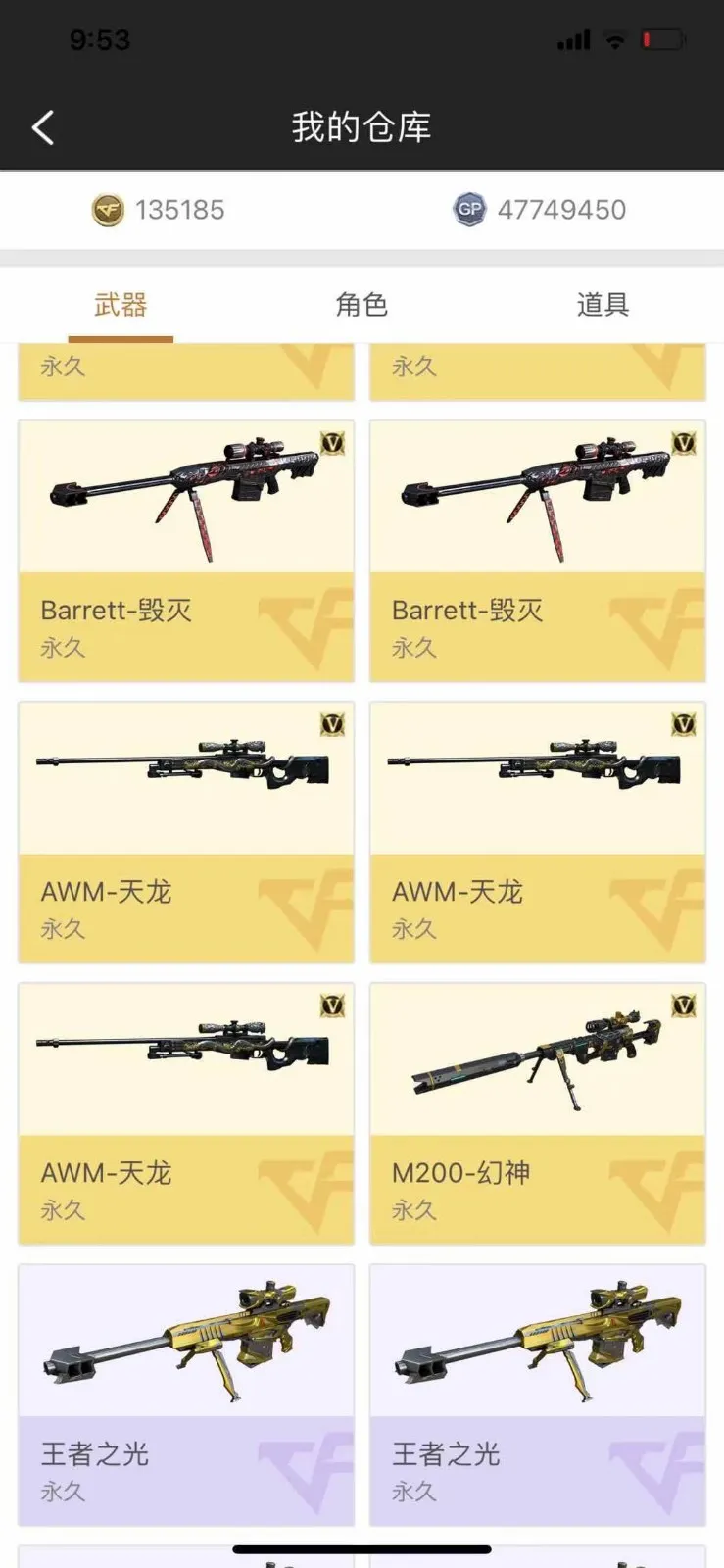 【主 枪】:星神、王者之心·觉醒、王者之势·w觉醒、王者之鲨、M200幻神、HK417、黑鲨、王者之光、王者之力、炫金毁灭x3、炫金天龙、王者之魄、炫金雷神、王者之心、王者之势、王者之武、炫金黑龙、炫金天龙、悦蓝x2、悦智、千变、火麒麟(万化、CFS)x5、黑龙(暗月)、雷神(能量核心、暗月、CFPL)x3、黑骑士(暗月)x2、无影(暗月、能量核心)x3、死神(秘银)x3、黑武士、机械迷城、幻兽、qbz03-金色蔷薇x4、猎神、天龙(秘银CFS)x3、毁灭(cfpl)x2、极光(能量核心)x6、巴雷特-金色蔷薇x7、盘龙、炼狱x2、烈龙x6、黑武士暗月x3、火麒麟-暗月x3、火麒麟-能量核心x2、麒麟、激光毁灭者lll、泰坦破坏者ll、乱世、征服者