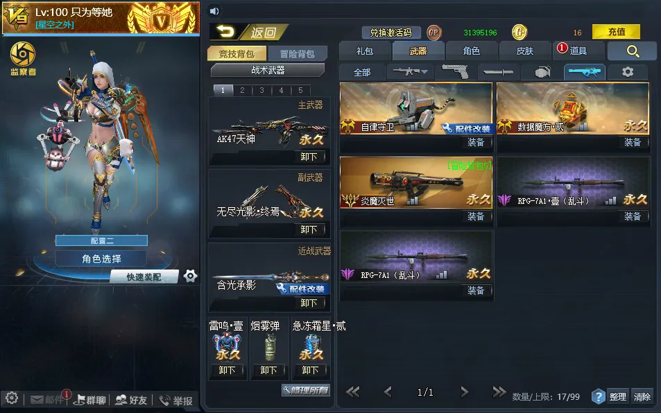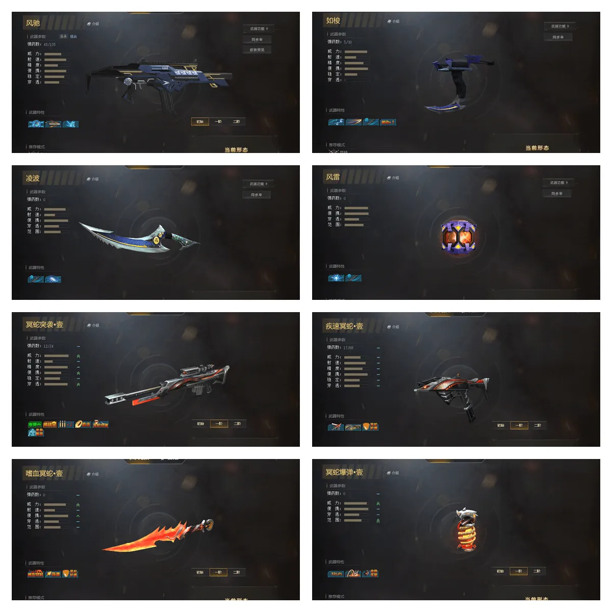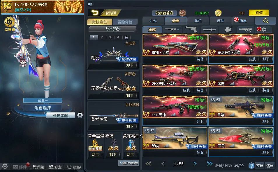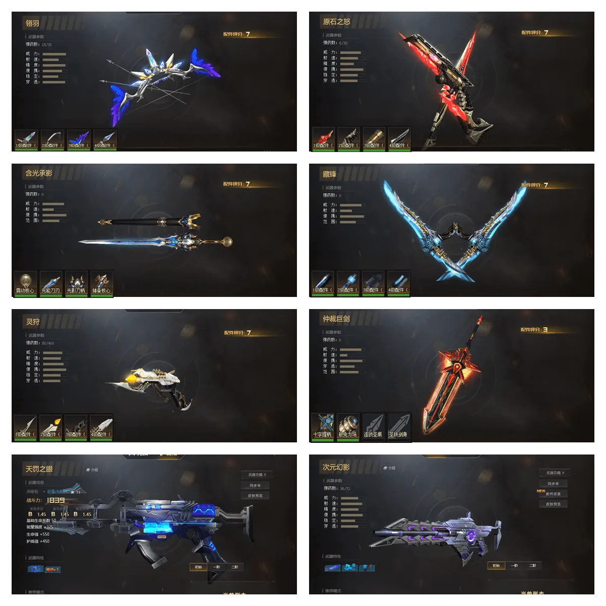 其它武器:【满配翎羽】【满配原石】【满配含光承影】【满配藏锋】【仲裁巨剑12配】【双持加特林贰】【数据魔方贰】【风驰套】【满配霜雪】【急冻霜星贰】【冥蛇套壹】【天罚之眼白板】【深渊之刃贰】【死神之光贰】【金属风暴贰】