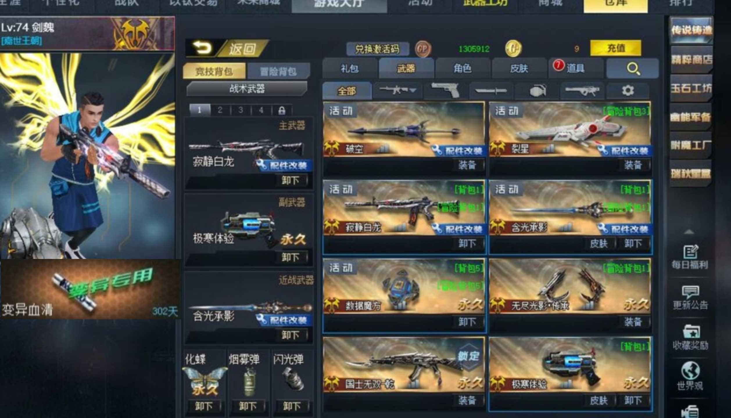 电信6区+极品血清+含光承影满配(技能范围伤害并造成秒杀)寂静白龙准满配(变异伤害爆炸)极寒体验(变异冻住僵尸)无限GT(爆破神器)数据魔方(增加伤害)破空!裂星+配件!无尽光影传承(可转圈圈)花海(刀战神器)圣手壹(加血)
