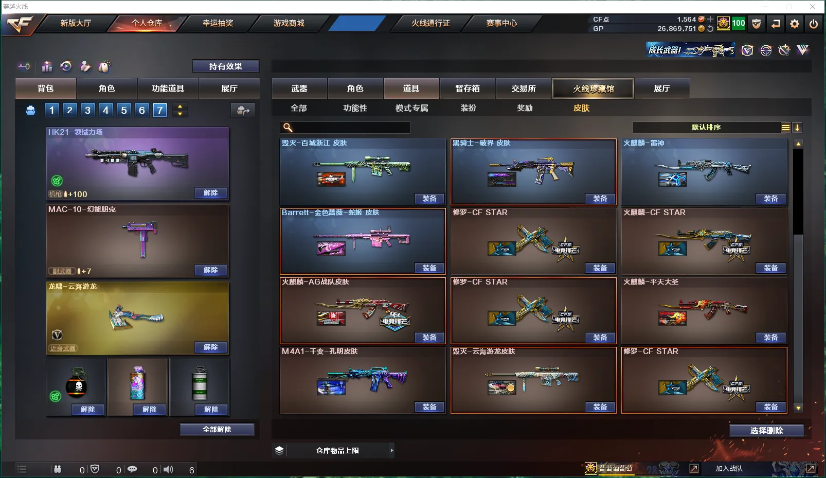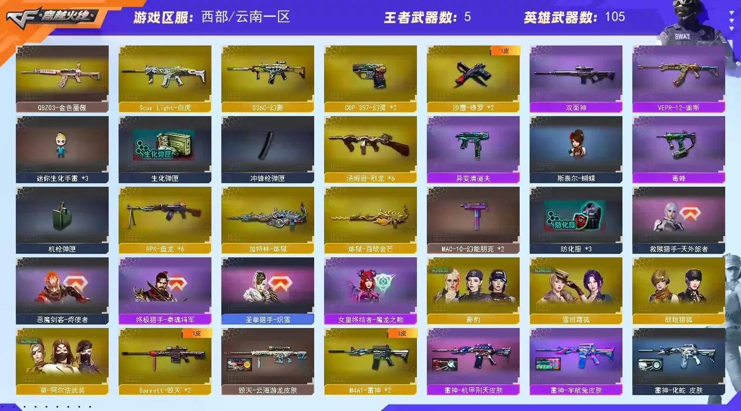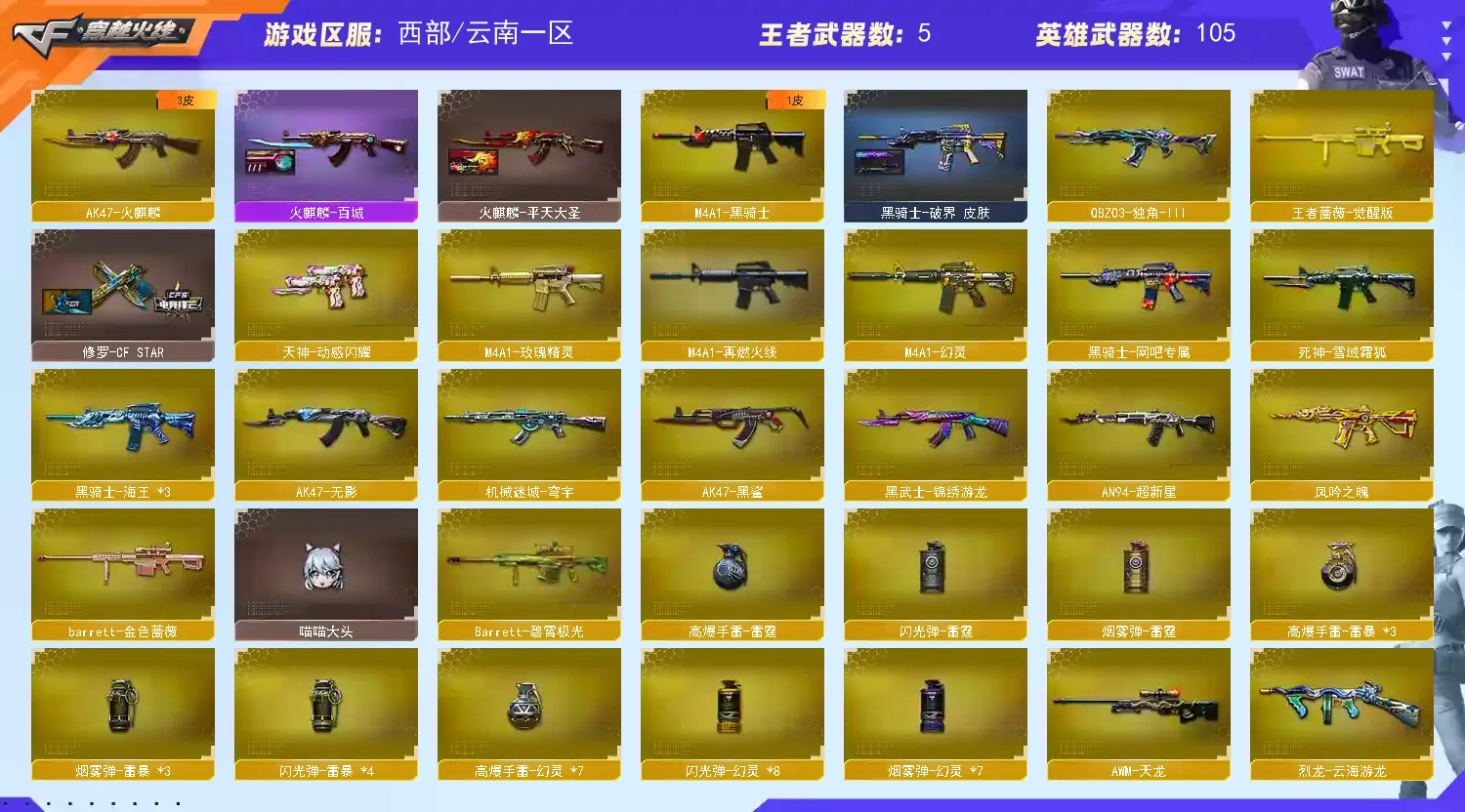 【皮肤】:龙啸-蛇姬皮肤、雷神-机甲刑天皮肤、雷神-源计划2.0专属皮肤、炼狱-电子连击皮肤、火麒麟-百城、雷神-宇航兔皮肤、毁灭-百城浙江皮肤、Barrett-金色蔷薇-蛇姬皮肤、雷神-化蛇皮肤、火麒麟-雷神、黑骑士-破界皮肤、毁灭-云海游龙皮肤、火麒麟-平天大圣、M4A1-千变-孔明皮肤、火麒麟-AG战队皮肤、火麒麟-CFSTAR、修罗-CFSTAR、