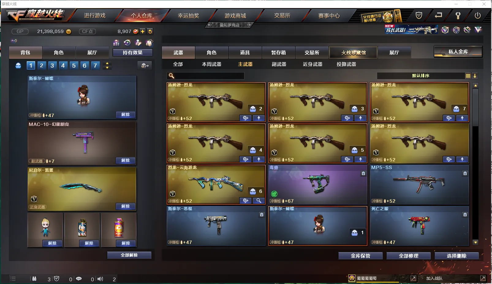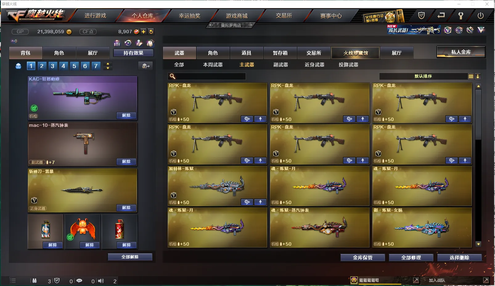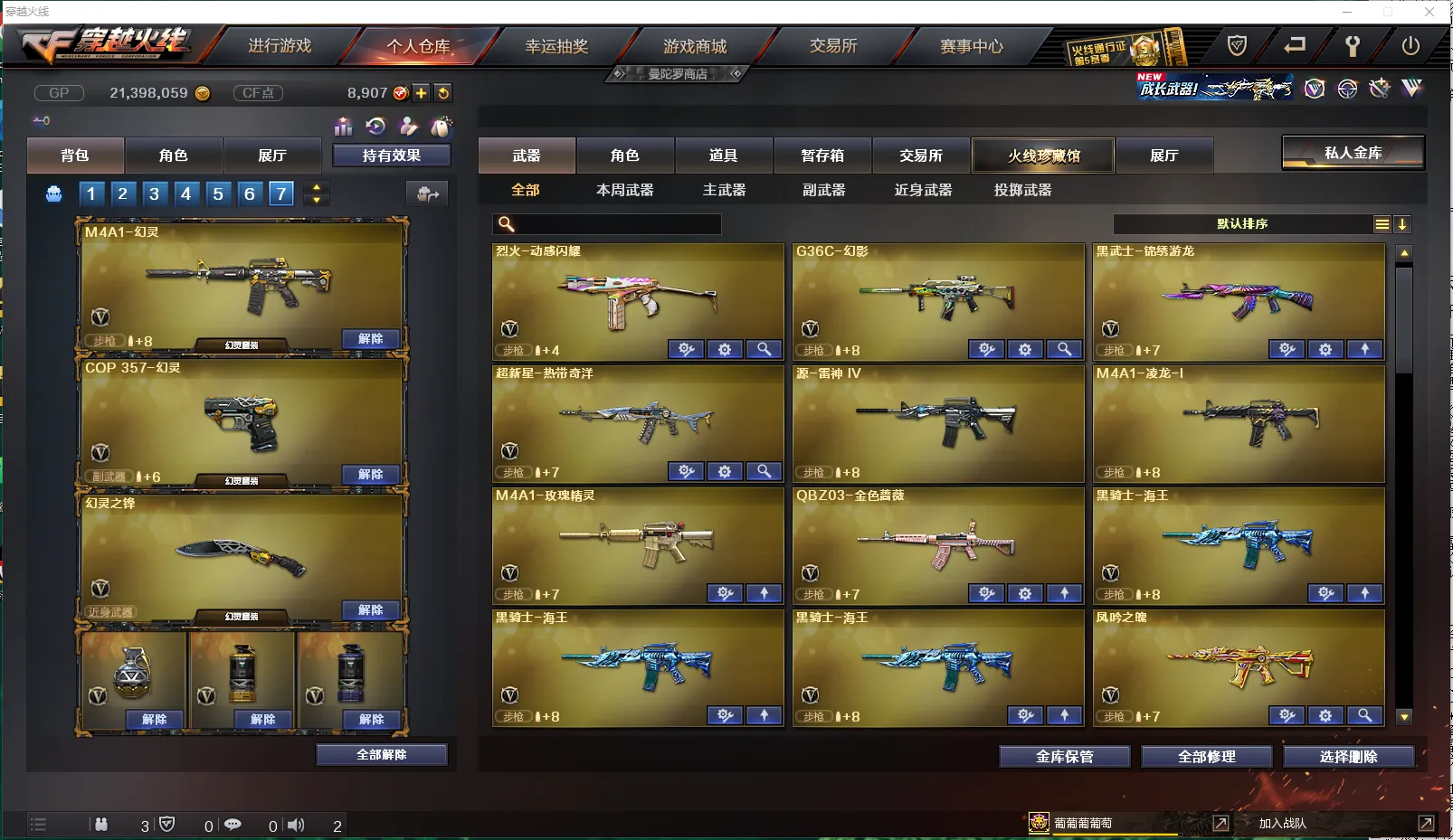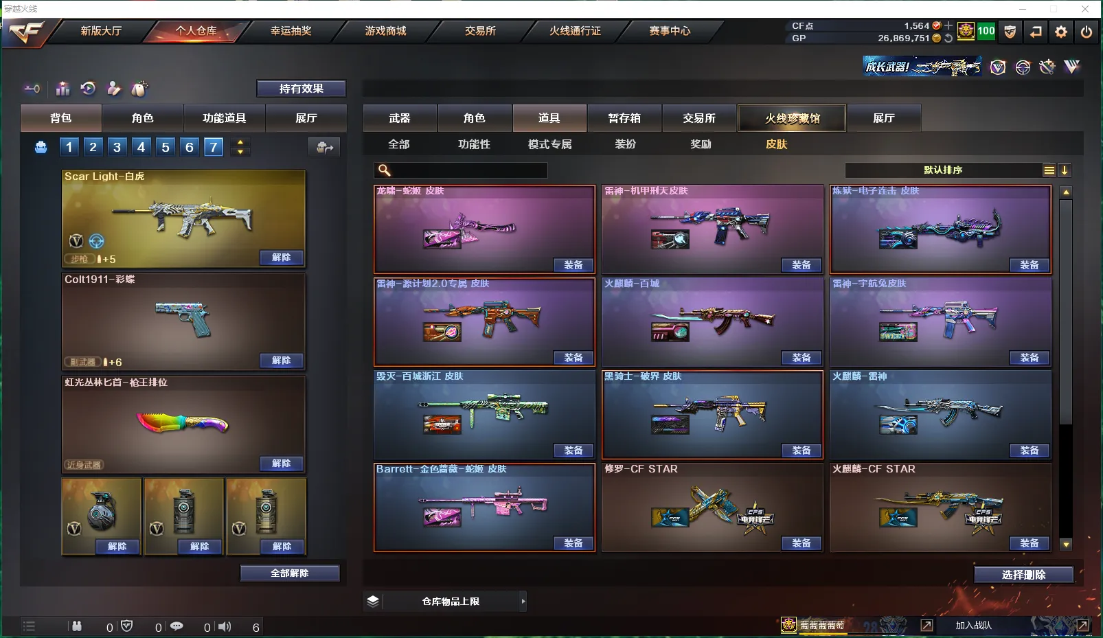 【皮肤】:龙啸-蛇姬皮肤、雷神-机甲刑天皮肤、雷神-源计划2.0专属皮肤、炼狱-电子连击皮肤、火麒麟-百城、雷神-宇航兔皮肤、毁灭-百城浙江皮肤、Barrett-金色蔷薇-蛇姬皮肤、雷神-化蛇皮肤、火麒麟-雷神、黑骑士-破界皮肤、毁灭-云海游龙皮肤、火麒麟-平天大圣、M4A1-千变-孔明皮肤、火麒麟-AG战队皮肤、火麒麟-CFSTAR、修罗-CFSTAR、