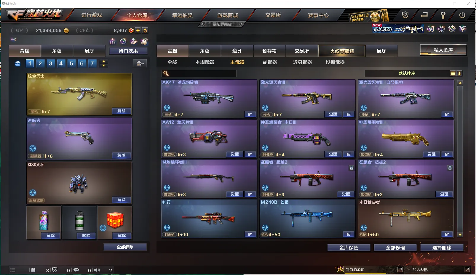 【挑战】:《主武器》:AA12-擎天柱Ⅲ、试练破坏者Ⅲ、AK47-冰龙粉碎者、激光毁灭者Ⅲ、激光毁灭者Ⅲ-白马银枪、神圣爆裂者-末日Ⅲ、征服者-超越2、末日裁决者、《副武》:巡航者、《近武》:等离切割者、末日之拳、破天斩魔剑、双龙、斩神刀、夺魂、海斯博士双刃、克洛诺斯的凝视、迷你牛牛、迷你深渊冰龙、魔能环、唐刀-盛世荣耀、唐刀-盛世太平、特工之刃、虚空之槌、《投掷》:反应堆手榴弹、深渊终结者手雷、
