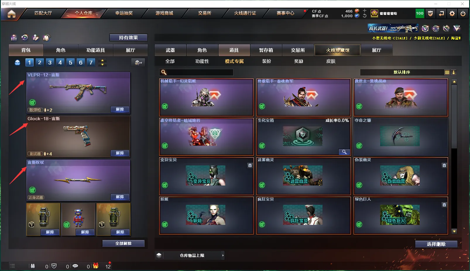 【生化】:异变清道夫、斯泰尔-蝴蝶🦋、毒蜂、双面神、HK21-领域力场、KAC-狂怒咆哮、死亡之眼、(VEPR-12-宙斯、Glock-18-宙斯、宙斯权杖)、轻型军用手斧-镜、