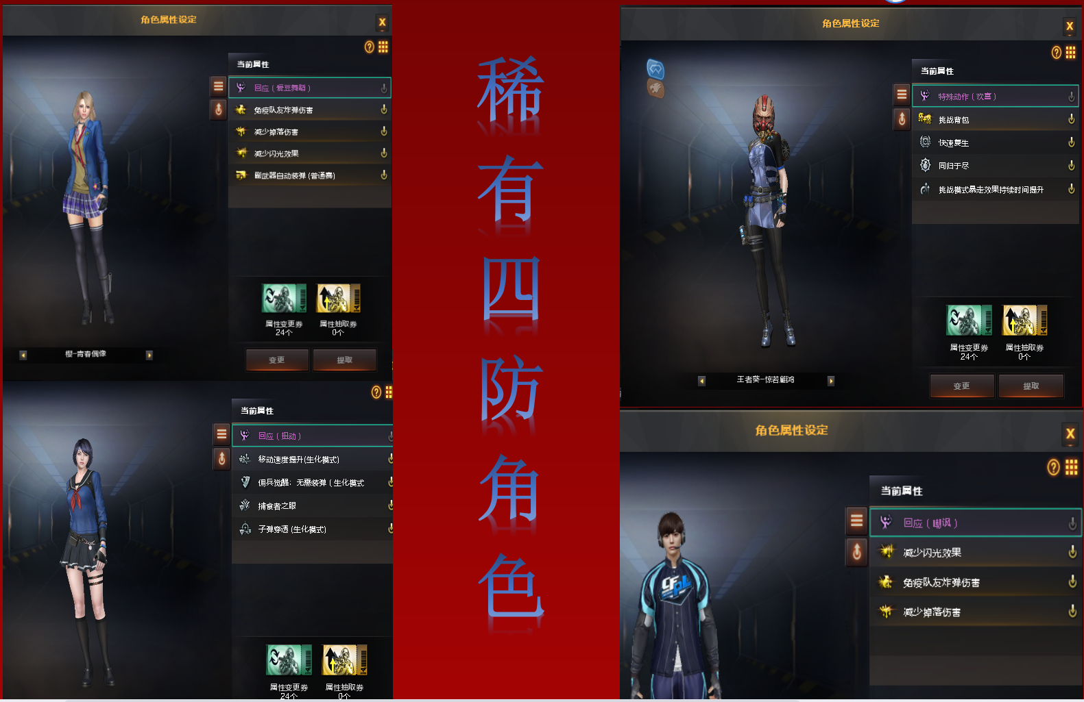 生化套装:4防稀有角色:零-热舞青春(不换弹+捕食者之眼+速度提升+子弹穿透)+ 6烈龙+5盘龙+2炼狱+觉醒乱世+蝴蝶斯太尔+觉醒征服者+防化服+生化弹夹+生化钩子。
