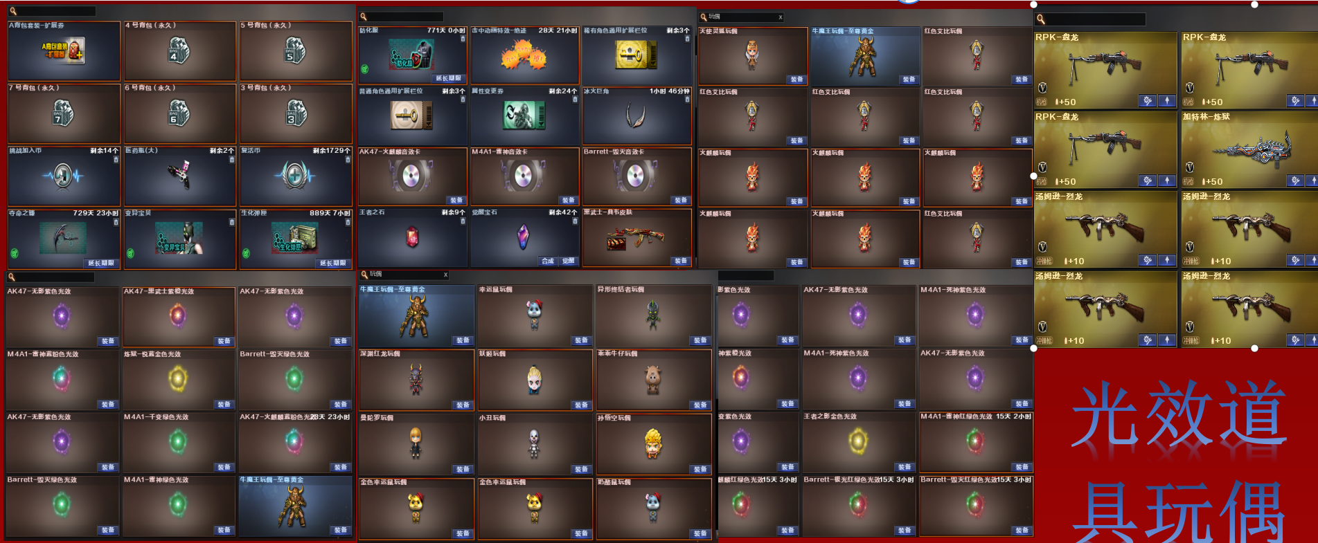 此号全部装备太多截不了太多图 普通CF点武器也是上百个 就不截图了 重要武器 全部在图上 (满背包 满道具各位武器应有尽有 多个玩偶主流武器全有光效)十 请老板清楚再下单,谢谢老板。