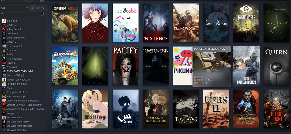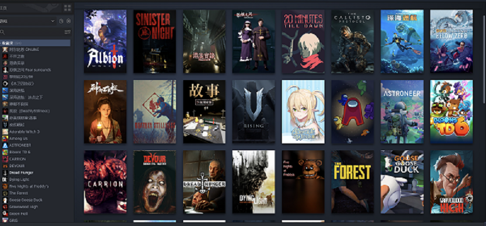 千禧梦、鲁特里一家死了(The Roottrees are Dead)、奥伯拉丁的回归(Return of the Obra Dinn)、道具夜/道具之夜(Propnight)、生化危机4 (Resident Evil 4 )、逃生2 (ououtlast2)、吞噬 (Devour)、安抚 (Pacify)、在我们之间/太空狼人杀 (Among Us)、寂静 (In Silence)、恐惧之间 (Fear surround)、恐鬼症/幽灵恐怖(phasmophobia)、小小噩梦/小小梦魇 (Little Nightmares)、我们永远在这里( We Were Here Forever)、我们一起在这里(We Were Here Together)、我们也在这里( We Were Here Too)、我们在这里( We Were Here)、迷失森林(The Forest)、异星探险家(ASTRONEER)、丛林地狱/绿色地狱(Green Hell)、深海迷航(Subnautica)、深海迷航冰点之下( Subnautica: Below Zero)、胡闹厨房2/分手厨房2/烹糊了2(Overcooked! 2)、红怪(Carrion)、塔洛斯的法则(The Talos Principle)、气球塔防6(Bloons TD 6)、苍磨岛不朽之念(Quern - Undying Thoughts)、奇异园艺(Strange Horticulture)、孙美琪疑案故事、迷宫中翻滚(Rolling in the Maze)、可爱的女巫3(Adorable Witch 3)、最后一间房(Last Room)、反乌托邦解密游戏《Seen》、艺术气息游戏《GRIS》、野餐大冒险(Pikuniku)、字谜游戏《Wordle》、艾波与欧波豪华版(ibb & obb - Deluxe Edition)、史诗战争模拟器2(Ultimate Epic Battle Simulator 2)、史丹利的寓言超豪华版(The Stanley Parable: Ultra Deluxe)、神都不良探完整版( 神都不良探 Underdog Detective-1至5回, 神都不良探 Underdog Detective -6至17回)、狼奔豕突(Oxenfree)、玩具熊的午夜后宫/玩具熊的五夜惊魂(Five Nights at Freddy's)、不详之夜(Sinister Night)、吸血鬼(Vampyr)、杀戮空间2/杀地板2(Killing Floor 2)、吸血鬼生存者/吸血鬼幸存者(Vampire Survivors)、黎明前20分钟(20 Minutes Till Dawn)、吸血鬼崛起/夜族崛起(V Rising)、《消逝的光芒》决定版、鹅鸭杀
