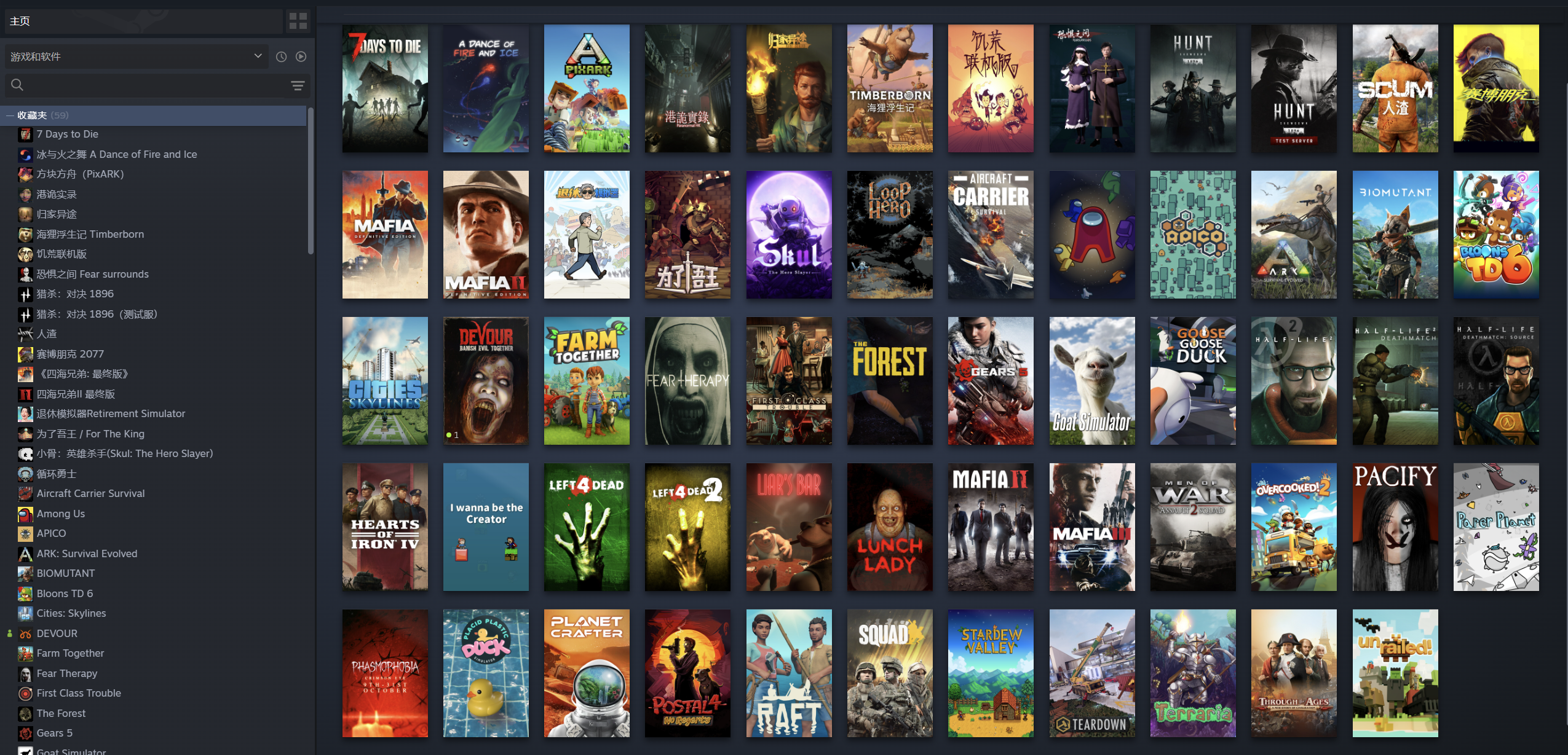 骗子酒吧、恐惧饥饿(Dread Hunger)、赛博朋克2077(Cyberpunk 2077)、《赛博朋克2077往日之影》、战术小队(Squad)、恐鬼症/幽灵恐怖(Phasmophobia)、吞噬(DEVOUR)、安抚(Pacify)、迷失森林(The Forest)、7日杀/七日杀(7 Days to Die)、生存木筏(Raft)、求生之路1(Left 4 Dead)、求生之路2(Left 4 Dead 2)、冰与火之舞(A Dance of Fire and Ice)、为了吾王/为了国王(For The King)、生化变种(BIOMUTANT)、方舟生存进化(ARK: Survival Evolved)、方块方舟(PixARK)、泰拉瑞亚(Terraria)、小骨:英雄杀手(Skul: The Hero Slayer)、一起开火车(Unrailed!)、归家异途(Home Behind)、循环勇士/循环英雄 (loop hero)、饥荒联机版(Don't Starve Together)、星球木匠(The Planet Crafter)、城市天际线/都市天际线(Cities: Skylines)、钢铁雄心4(Hearts of Iron IV)、喋血街头4(POSTAL 4)、气球塔防6(Bloons TD 6)、一起农场(Farm Together)、海狸浮生记/木架(Timberborn)、航母生存模拟(Aircraft Carrier Survival)、拆迁模拟器(Teardown)、退休模拟器、佳慧、鹅鸭杀、绝地求生大逃杀、战争机器5(Gears 5)、星露谷物语(Stardew Valley)、胡闹厨房2(Overcooked! 2)、半条命2(Half-Life 2)、四海兄弟最终版、四海兄弟II最终版、四海兄弟III最终版、丧命公司/致命公司(Lethal Company)、战争之人突击小队2(Men of War: Assault Squad 2)、头等舱危机(First Class Trouble)、模拟山羊(Goat Simulator)、恐惧疗法(Fear Therapy)、古往今来(Through the Ages)、小黄鸭模拟器(Placid Plastic Duck Simulator)、蜂语真(APICO)、午餐女士(Lunch Lady)、纸弹星球(Paper Planet)、我想成为创造者(I wanna be the Creator)