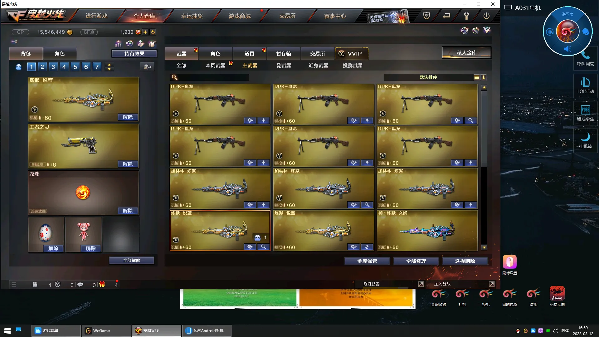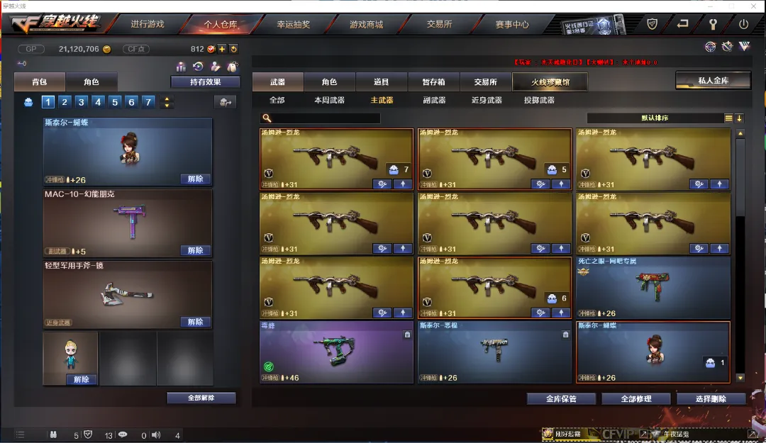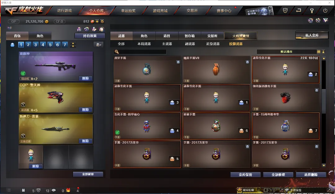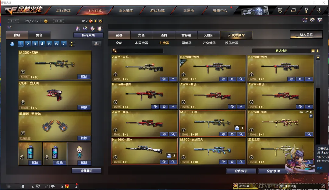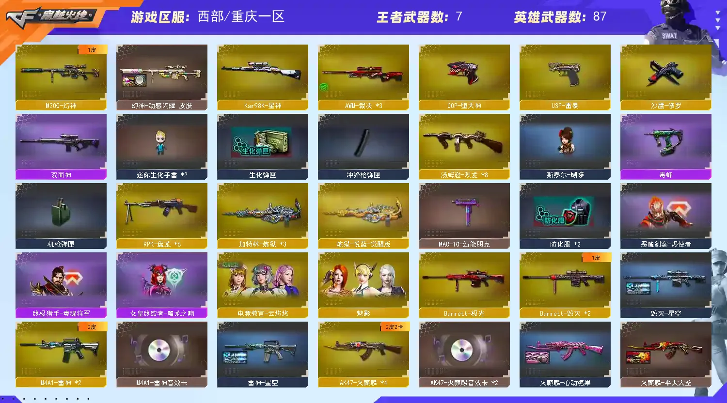 武器:M200-幻神 98K星神 六盘龙 六烈龙 斯泰尔-蝴蝶 加特林-炼狱 毒峰 双面神 COP-堕天神 猫猫手套 M200-竞技荣光 MAC-10-涂鸦 轻用军型手斧-镜 迷你生化手雷,水晶 龙珠 COP-旗袍