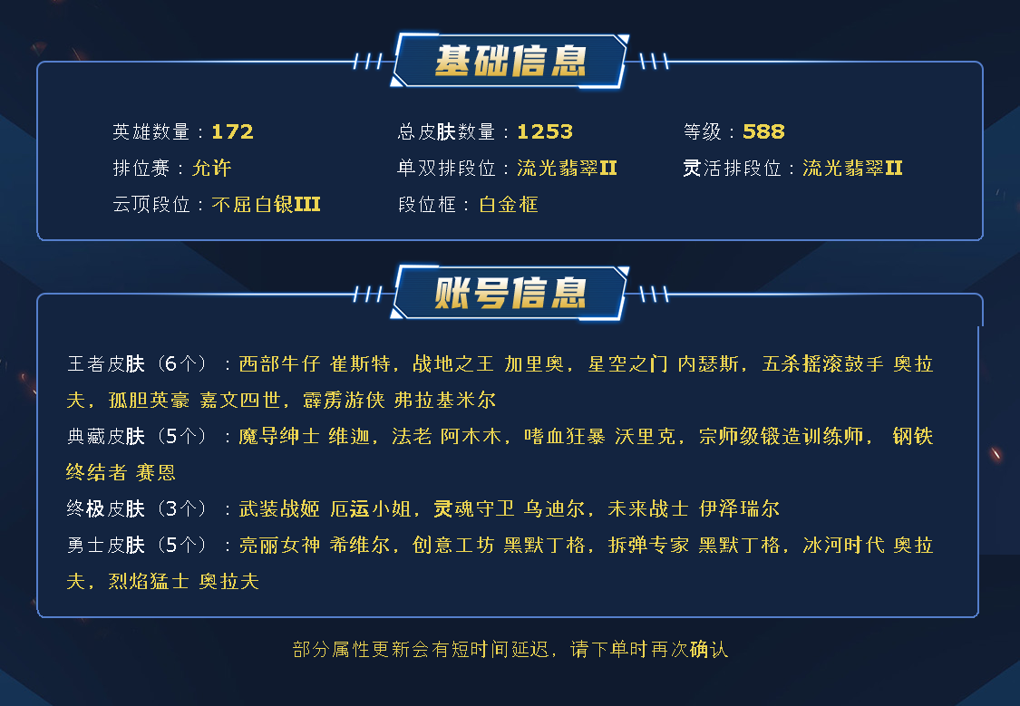 【723原皮肤178炫彩皮肤】至臻瞎子、摄魂VN、恐惧新星诺手、海克斯乌鸦、海克斯人马、海克斯龙龟、海克斯安妮、鼠年贾克斯、鼠年瑟提、鼠年德莱文、龙瞎、星守EZ、玉剑传说男刀、牛年诺手、灵能特工易、司马懿、勇敢的心诺手、狗年狗头、狗年狼人、蛇年蛇女、蛇年火女、电玩女枪、羊年金克丝、花木兰、张辽、猴年莫甘娜、黎明使者永恩、泳池瑟提、情人节乌鸦、生化领主蛮王、泳池女警、泳池船长、征服者卡尔玛、征服者韦鲁斯、暗星尊烬、神龙尊者瞎子、战斗学院EZ、真实伤害艾克、神龙尊者狗熊、太空律动狗头、破败军团德莱文、灵魂莲华VN、灵魂莲华永恩、女帝风女、屠龙勇士奥拉夫、灵能特工莎弥拉、武装战姬、未来战士EZ、灵魂守卫、冰雪节剑圣、大魔王提莫、地底世界、电玩人马、冠军掠夺者、冠军之隐、克格汪、送披萨的小姐姐、冰雪节老鼠、觅心之翼、破空枪骑、万圣节维克托、甜心之羽、卧虎藏龙、万圣节人马、勇者豹女、制胜金靴、暗星锤石、奥德赛凯隐、黑夜亚索、黎明锐雯、神拳、神王盖伦、神王诺手、天煞劫、屠龙勇士潘森、西部卢锡安、西部寒冰、星守金克丝、星守洛、星守霞、源计划派克、源计划VN、源计划寒冰、黑夜使者凯隐、黯晶巨鳄、奥德赛亚索、貂蝉、德玛西亚警官盖伦、关羽、黎明使者豹女、吕布、魔女卡蜜尔、糖果大战基兰、糖果大战寡妇、未来战士锤石、未来战士卢锡安、未来战士慎、武神、西部锤石、西部诺手、小蜜蜂提莫、星守妮蔻、腥红之月剑魔、玉剑传说莫甘娜、宇航员纳尔、源计划蔚、源计划烬、战斗男枪、真实伤害阿卡丽、真实伤害亚索、真实伤害赛娜、真实伤害奇亚娜、K/DA卡莎、K/DA阿卡丽