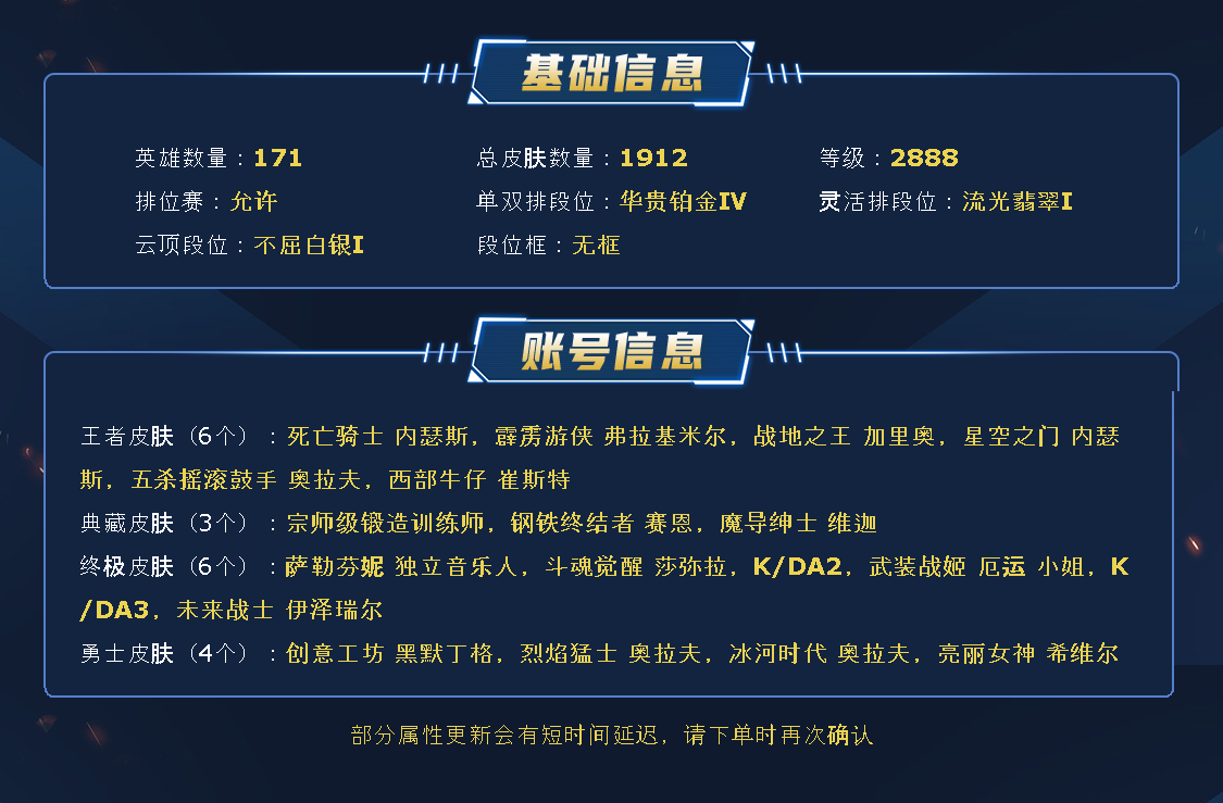 ~~喜欢记得收藏~~可排位~~1854皮全英雄丨90神话/至臻/海克斯丨IG套丨灵魂莲华套丨神龙尊者套丨鼠年套丨EDG套丨FPX套丨KDA套丨青花瓷套丨水晶玫瑰套丨御星艾希丨电玩女警丨星守狐狸丨玉剑男刀丨女帝卡特丨勇敢的心丨替父从军丨甜心格温丨觅心金克斯丨至高天奎桑提丨福牛厄斐琉斯~~租之前尽量查一下游戏ID,确保段位是您需要的,避免浪费您的时间~~请勿挂机逃跑故意送人头,谢谢合作,谢谢~~