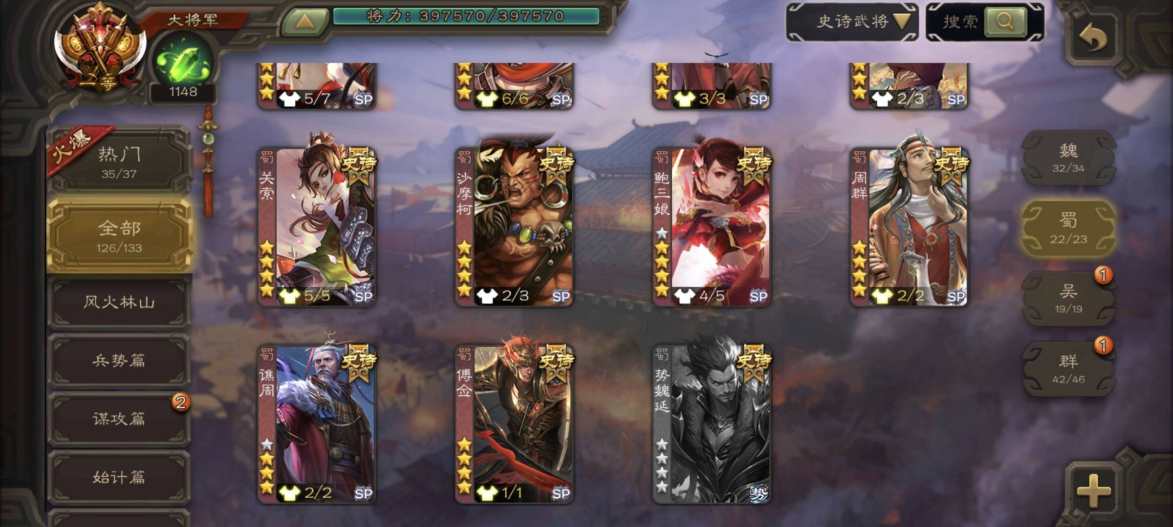 蜀——王平,诸葛瞻,谋马超,谋赵云,谋夏侯氏,花鬘,界黄忠,马云騄,张星彩,董允,赵襄,关索,沙摩柯,周群,谯周,谋刘备,某黄忠,谋孙尚香,鲍三娘,傅佥,谋诸葛亮,谋关羽