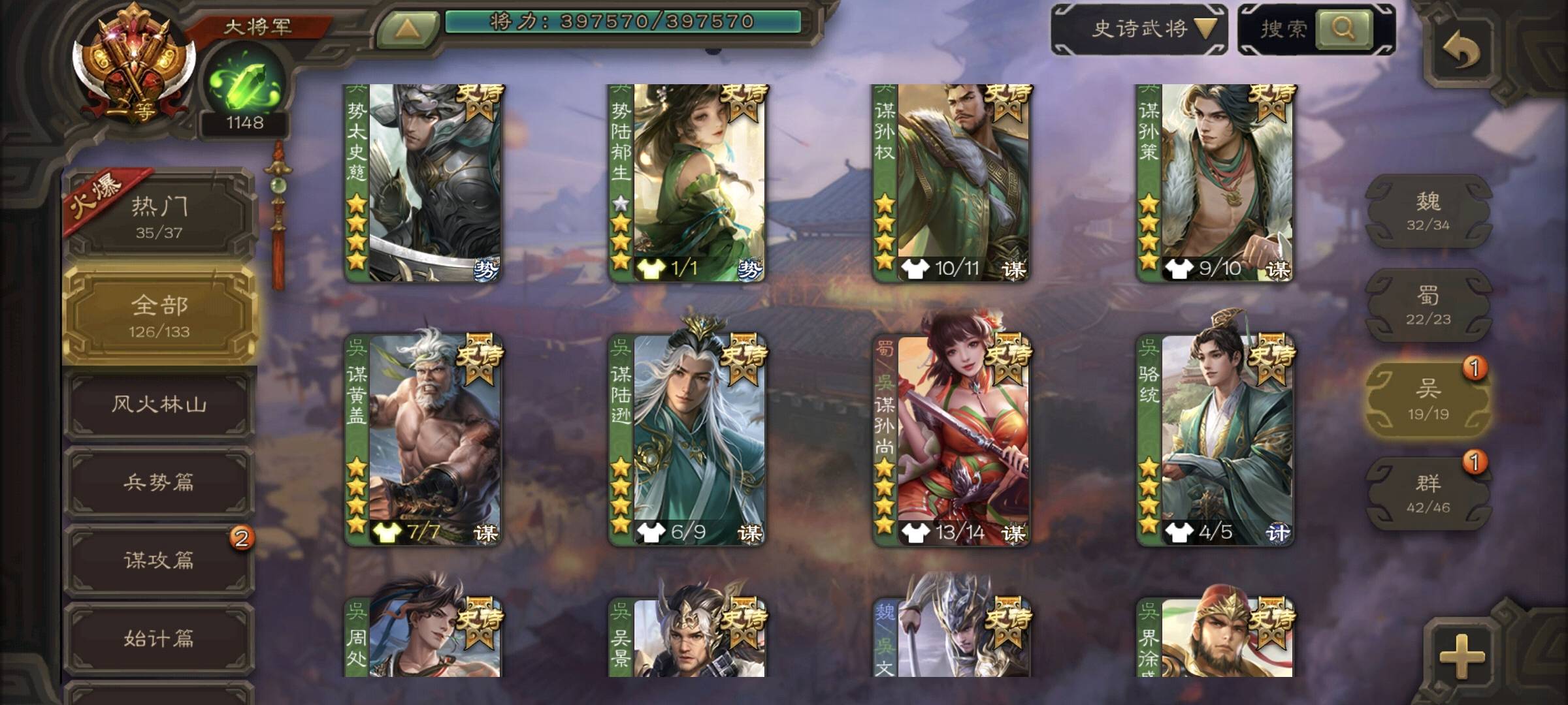 吴——谋黄盖,骆统,吴景,文鸯,界徐盛,界步练师,界朱然,贺齐,孙皓,留赞,谋孙权,谋孙策,谋孙尚香,周处,孙寒华,谋陆逊,张奋,势太史慈,势陆郁生