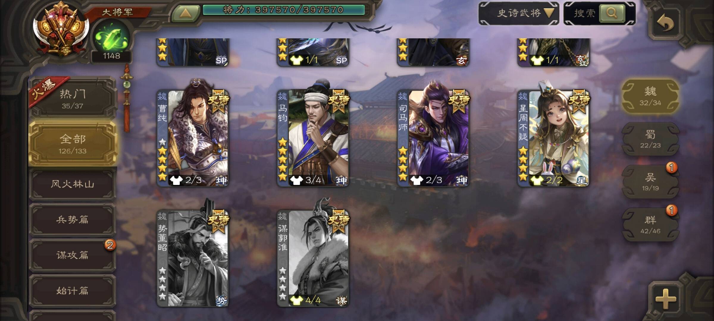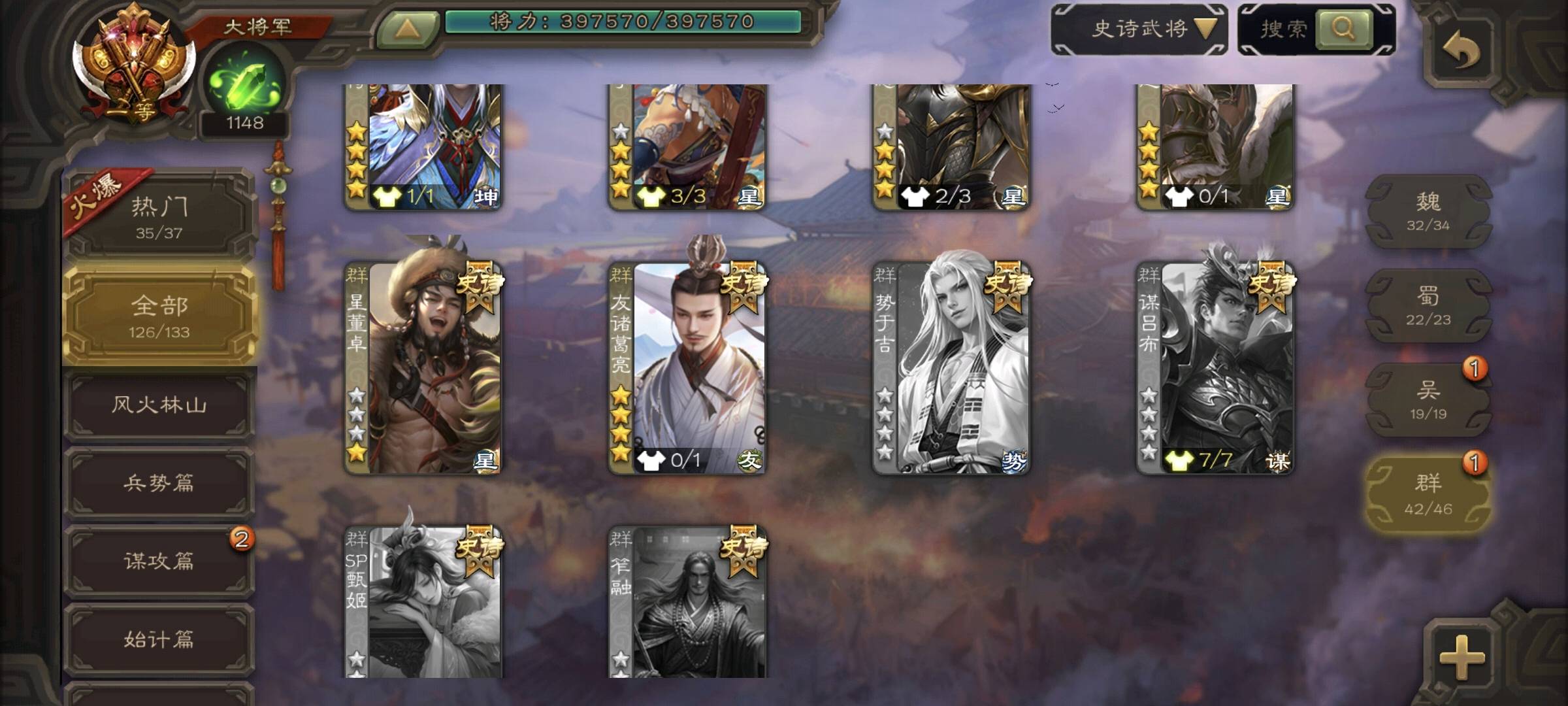 群——左慈,许攸,谋貂蝉,杜预,刘璋,界左慈,沮授,界李儒,张让,麹义,陶谦,士燮,司马徽,卑弥呼,刘焉,王允,苏飞,公孙康,兀突骨,祢衡,庞德公,郑玄,星甘宁,张仲景,黄甫嵩,界沮授,审配,徐荣,陈登,张琪瑛,灵雎,杨彪,裴秀,十常侍,星黄忠,星魏延,谋公孙瓒,司马昭,友诸葛亮