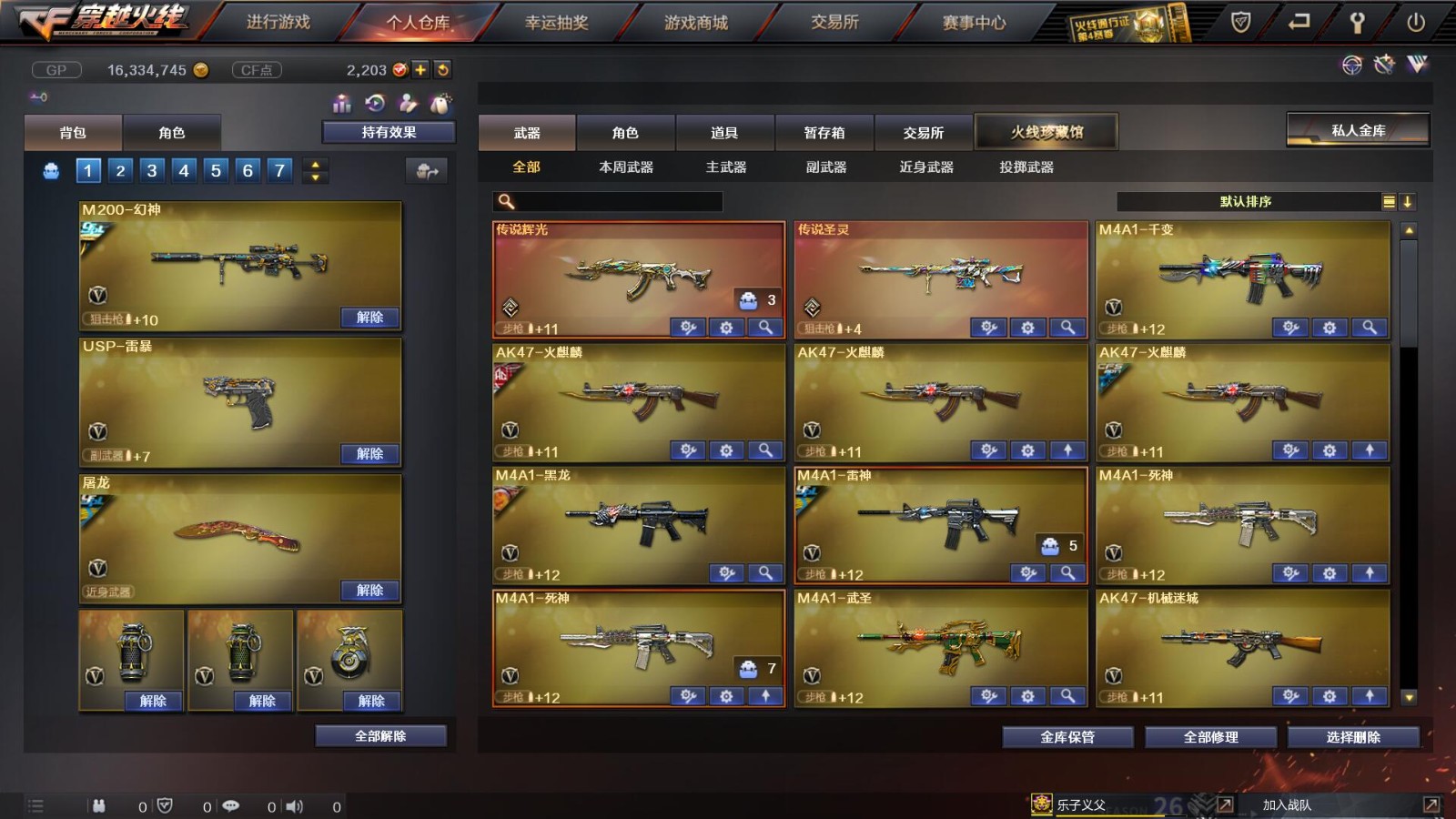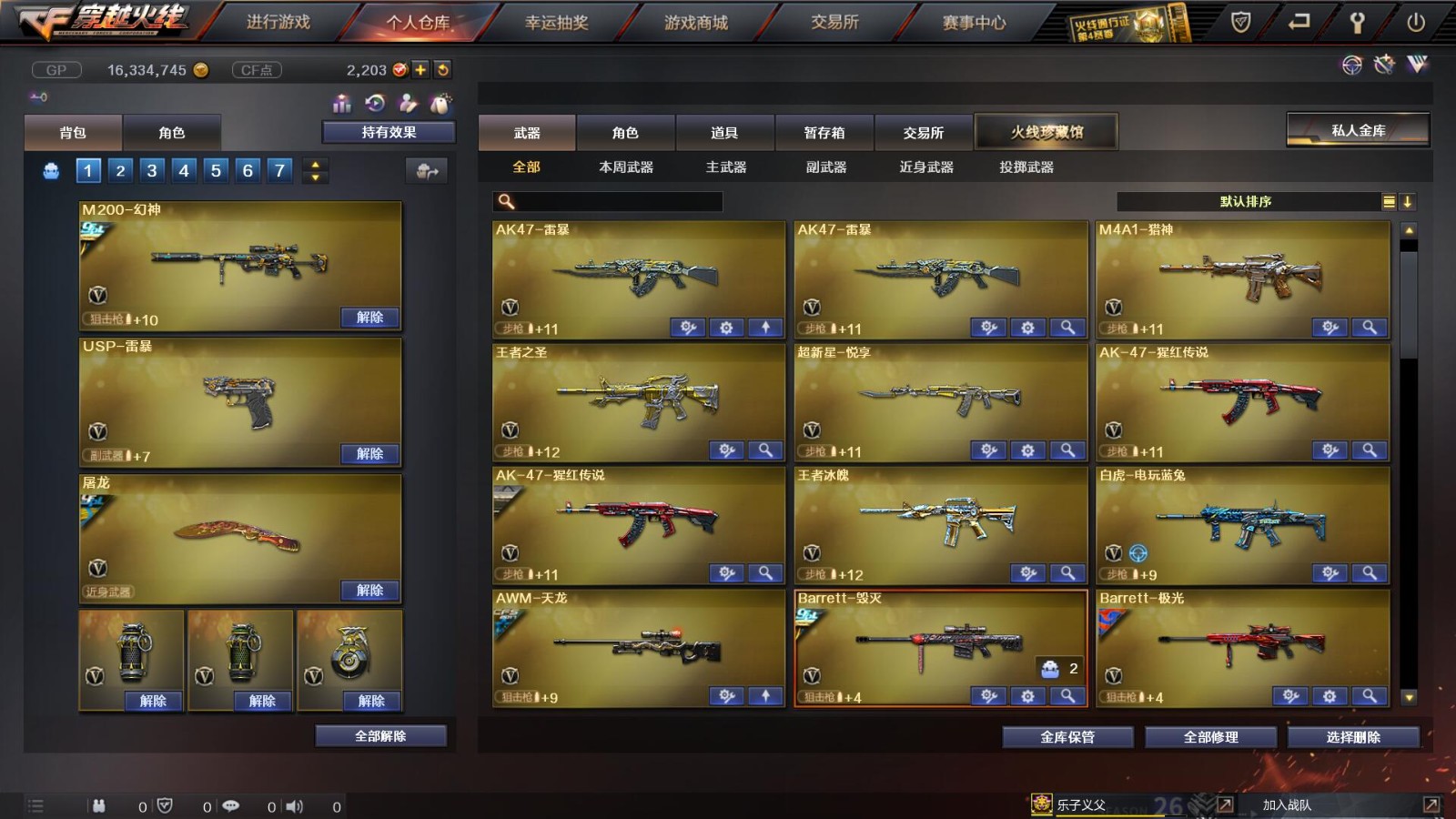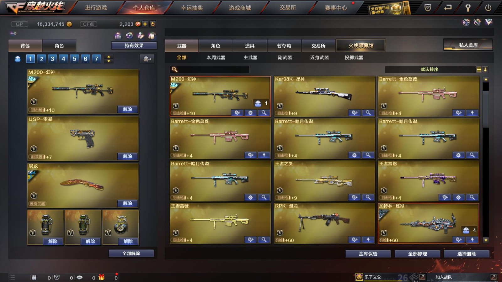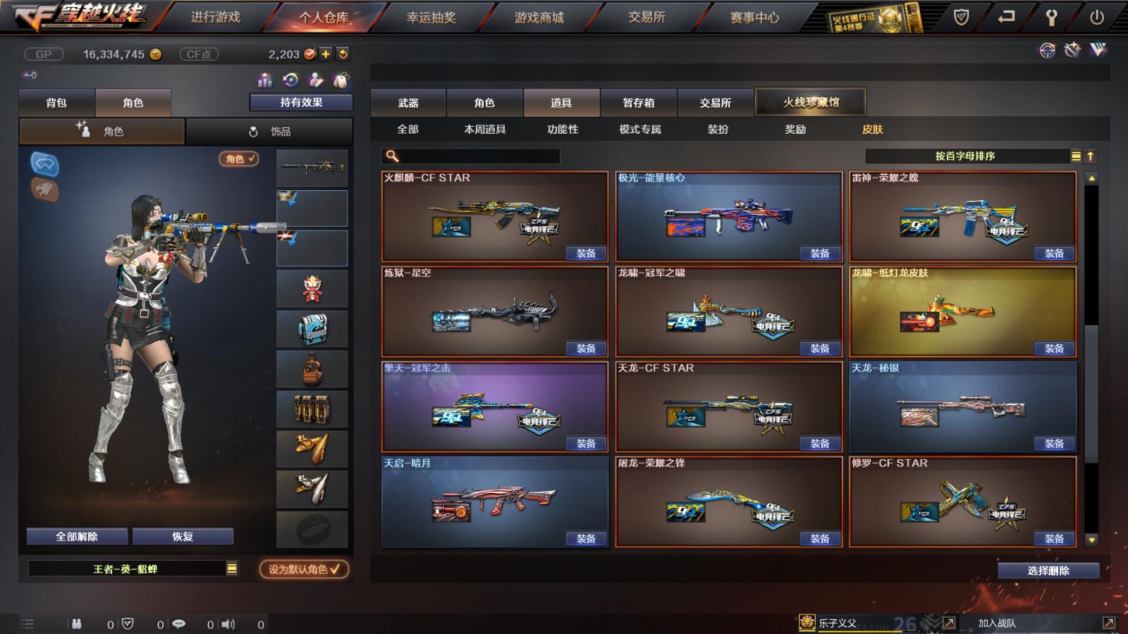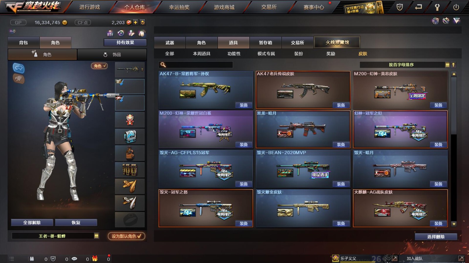 2传说/10王者/3炫金/73英雄/【重要角色10】王者凌霄/王者葵貂蝉/王者零/王者零国色天香/审判者/春/职业选手/葵(普通)/铁骑荣耀/司雨【套装2】雷暴/武圣/【传说武器2】传说辉光/传说圣灵【王者武器6】王者冰魄-觉醒版/超新星-悦享-觉醒版/王者之圣-觉醒版/王者蔷薇-觉醒版/王者雷怒/王者之决-觉醒版【炫金武器3】炫金雷神/炫金毁灭/炫金天龙【热门武器16】传说辉光/M200-幻神/Kar98K-星神/柯尔特-冠军之特/炼狱-迷你小钢/斯泰尔-蝴蝶/死亡之眼*2/荣耀世冠-柯尔特/Knife-冠军之刃/USP-雷暴/盘龙/2修罗/炼狱/金刚伞-电玩红兔【英雄武器69】AK47-火麒麟*3/M4A1-千变/AK-47-猩红传说*2/白虎-电玩蓝兔/M4A1-死神*2/M4A1-雷神/AK47-雷暴*2/AK47-机械迷城/M4A1-武圣/M4A1-黑龙/M4A1-猎神/AWM-天龙/Barrett-暗月传说*3/Barrett-极光/barrett-金色蔷薇*2/Barrett-毁灭/M200-幻神/Kar98K-星神/加特林-炼狱/RPK-盘龙/龙啸*2/女皇利刃-幻兽/斩神刀-雷暴/屠龙/擎天/AA-12-雷霆/闪光弹-雷暴*7/烟雾弹-雷暴*7/高爆手雷-雷暴*7/高爆手雷-幻兽/烟雾弹-幻兽/闪光弹-幻兽/手雷-云海游龙/沙鹰-修罗*2/沙鹰-天神/USP-雷暴/柯尔特-电竞装甲/沙鹰-幻兽/柯尔特-冠军之特/Glock18-武圣/荣耀世冠-柯尔特【热门皮肤武器17】龙啸-纸灯龙/M200-幻神-黄忠/M200-幻神-荣耀世冠白鲨/幻神-冠军之幻/毁灭-BEAN-2020MVP/毁灭-冠军之怒/巴雷特-毁灭-CFPL冠军/龙啸-冠军之啸/擎天-冠军之击/天龙-CFSTAR/火麒麟-CFSTAR/修罗-CFSTAR/毁灭耀金/屠龙-荣耀之锋/雷神-荣耀之魄/炼狱-星空/天龙-秘银【人偶武器武器4】斯泰尔-蝴蝶/炼狱-迷你小钢/火麒麟-灵狐/COP-旗袍【暴走生化武器6】斯泰尔-蝴蝶/炼狱-迷你小钢/死亡之眼*2/RPK-盘龙/双面神【挑战武器武器4】神圣爆裂者III/神圣爆裂者-末日III/征服者-超越觉醒 [Lv 3]/阐释者III【音效卡武器5】Barrett-极光音效卡/M200-幻神音效卡/白鲨语音包/M4A1-雷神音效卡/Barrett-毁灭音效卡【普通皮肤7】火麒麟-AG/AK47-B-常胜将军-孙权/修罗-能量核心*2/天启-暗月/毁灭-暗月/极光-能量核心